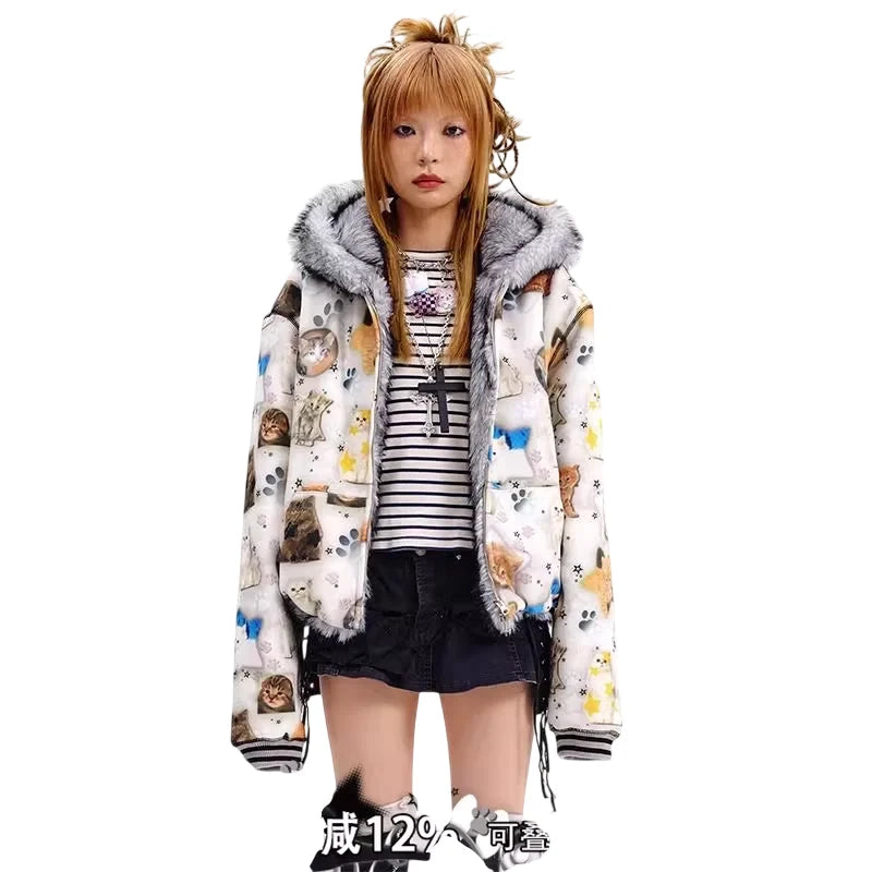 CFIERCE Reversible Cat Print Faux Fur Hooded Coat
