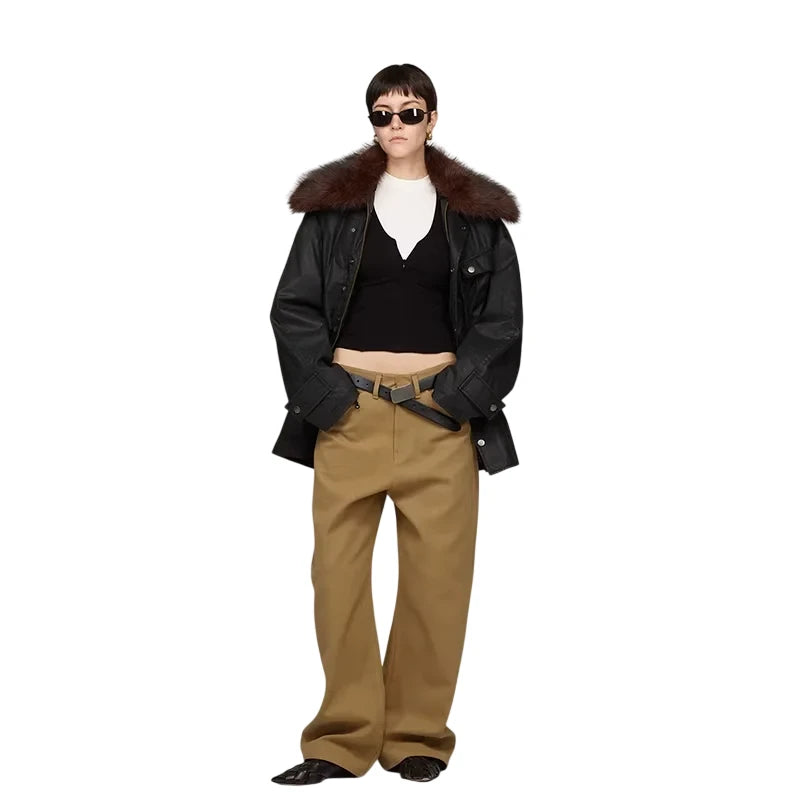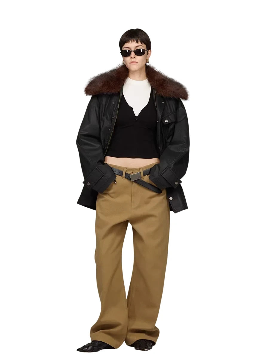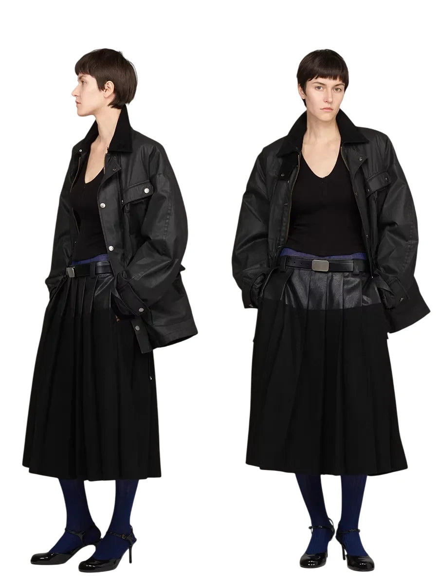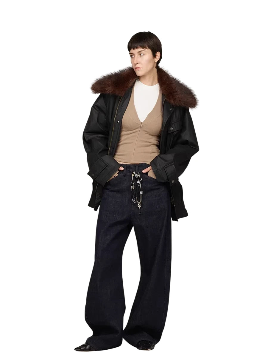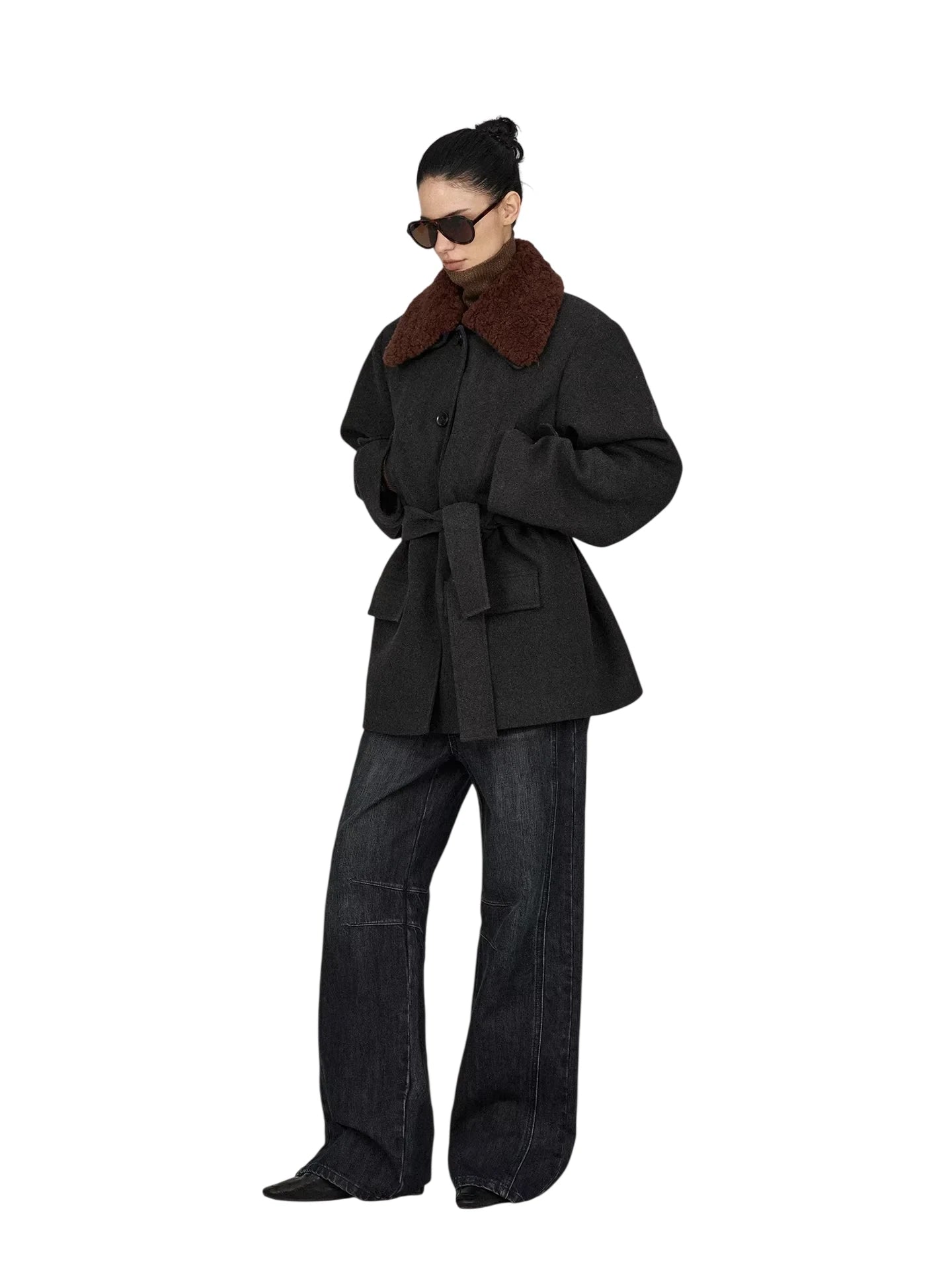 ACSENSE STUDIO Colorblock Wool Coat with Detachable Fur Collar