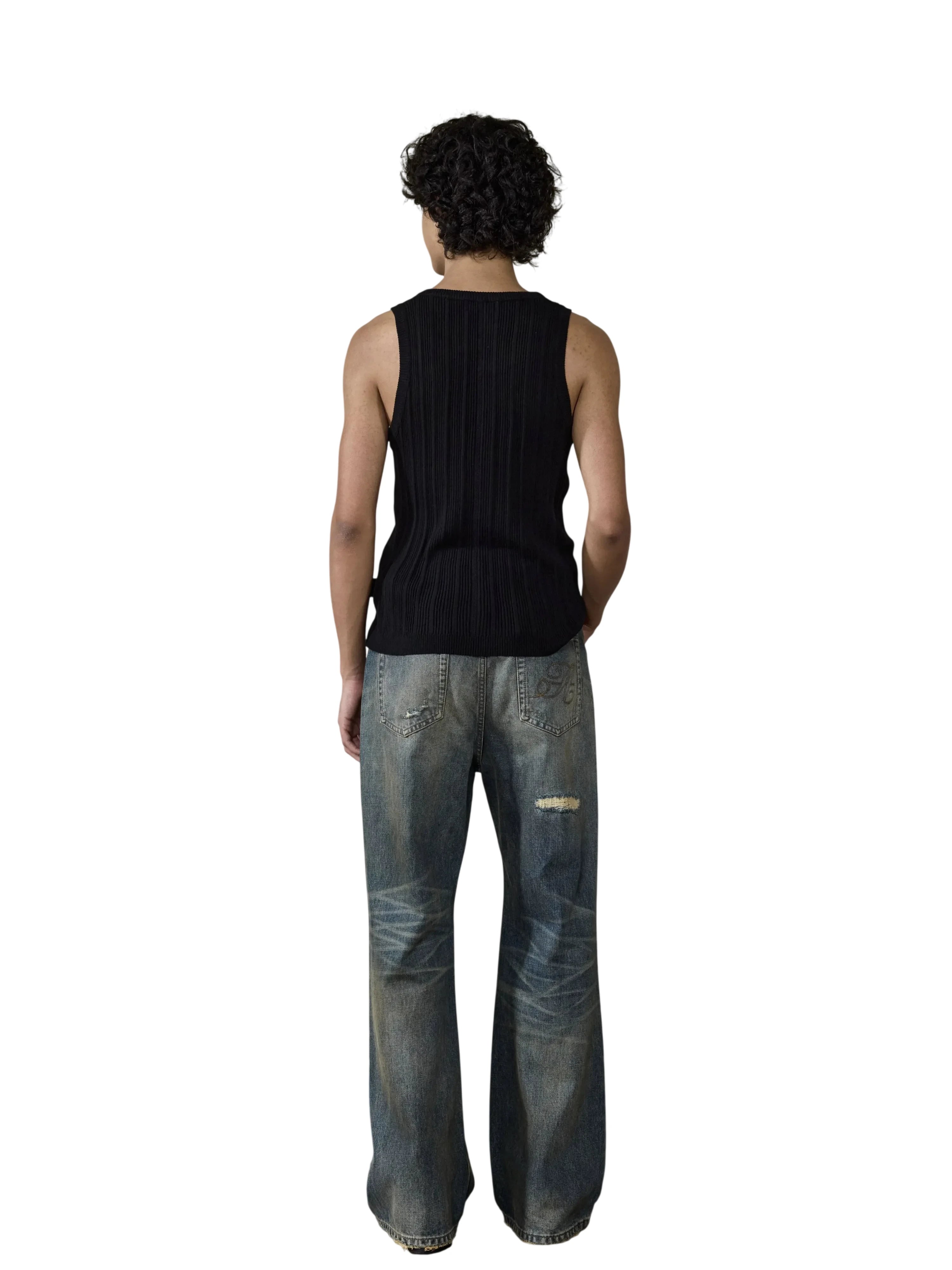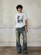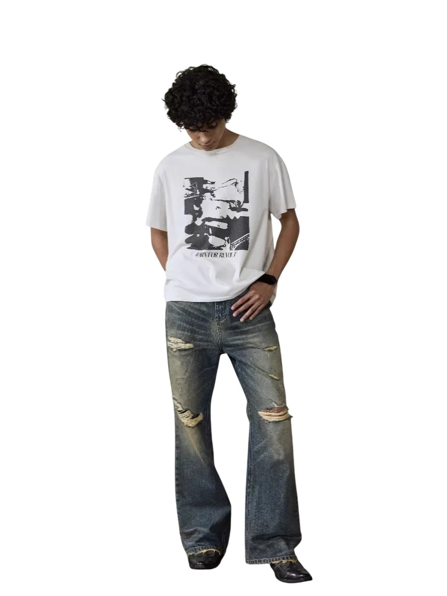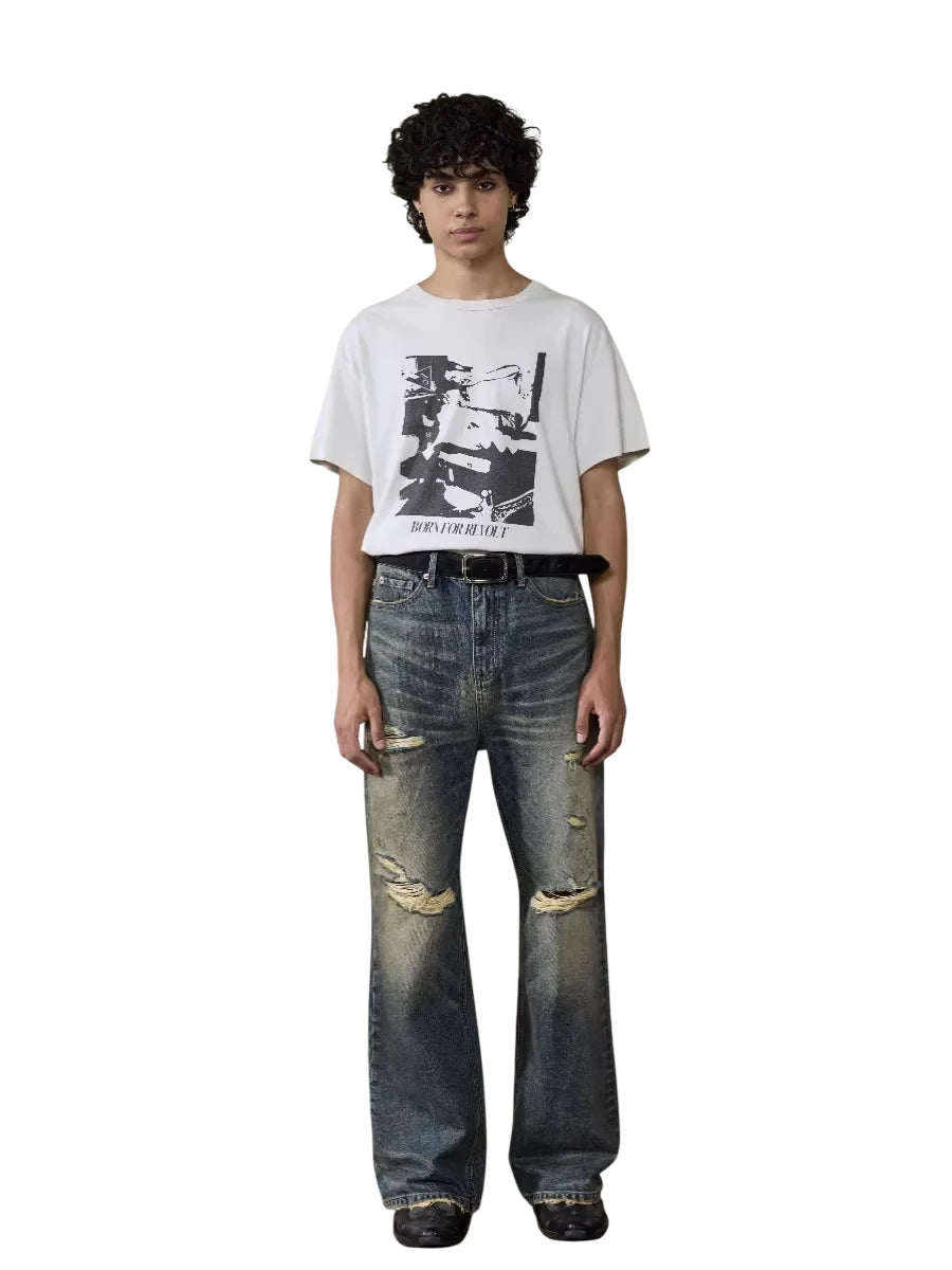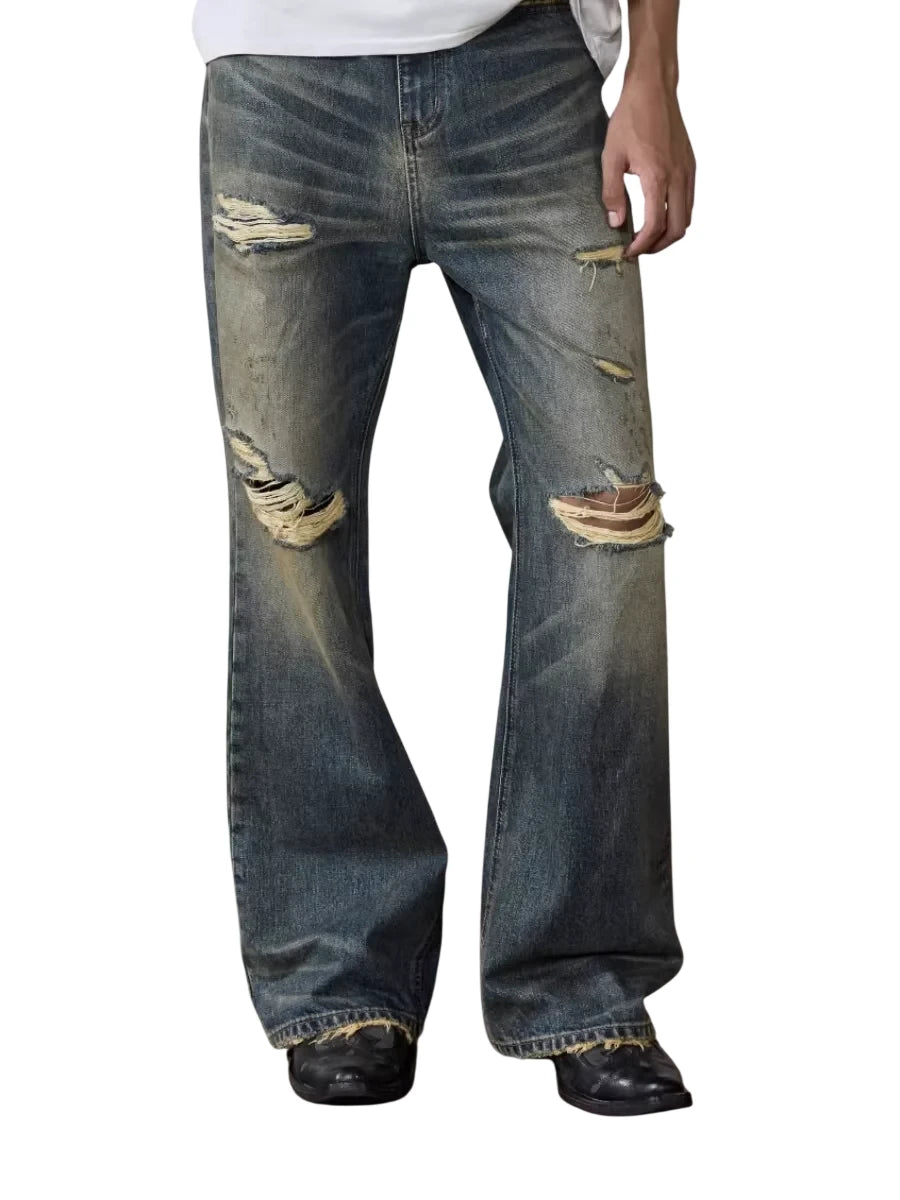 These men's flared straight jeans feature a medium blue wash with heavy distressing for a bold, rugged look. Designed with frayed rips on the thighs and knees and distressed hems, they offer a modern twist on a vintage aesthetic. The wide-leg silhouette adds comfort and street-style appeal, ideal for casual wear with a touch of edge.