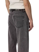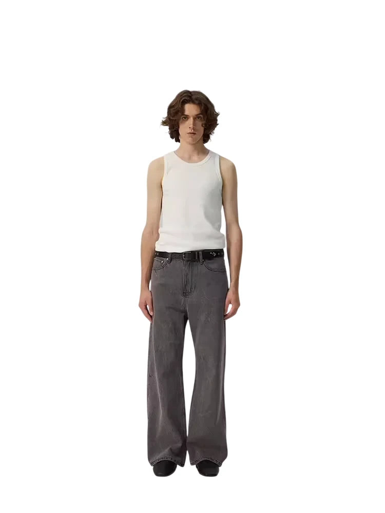 These smoke grey jeans feature a distinctive water ripple texture and a gently worn look, bringing a vintage flair to modern streetwear. Designed with a high-waisted fit and relaxed wide-leg silhouette, they channel a 90s-inspired aesthetic. Styled here on a male model, they pair effortlessly with casual tops and statement footwear for an effortlessly cool outfit.