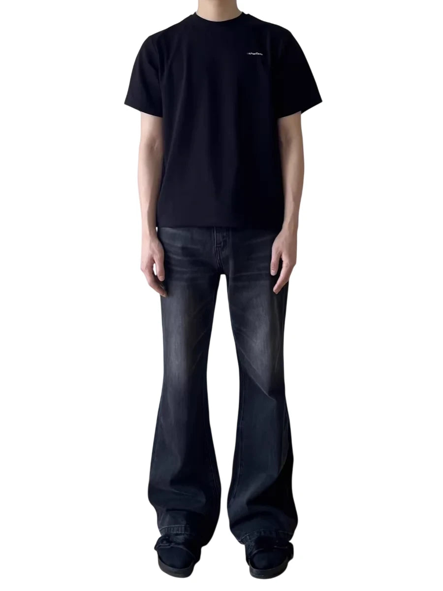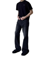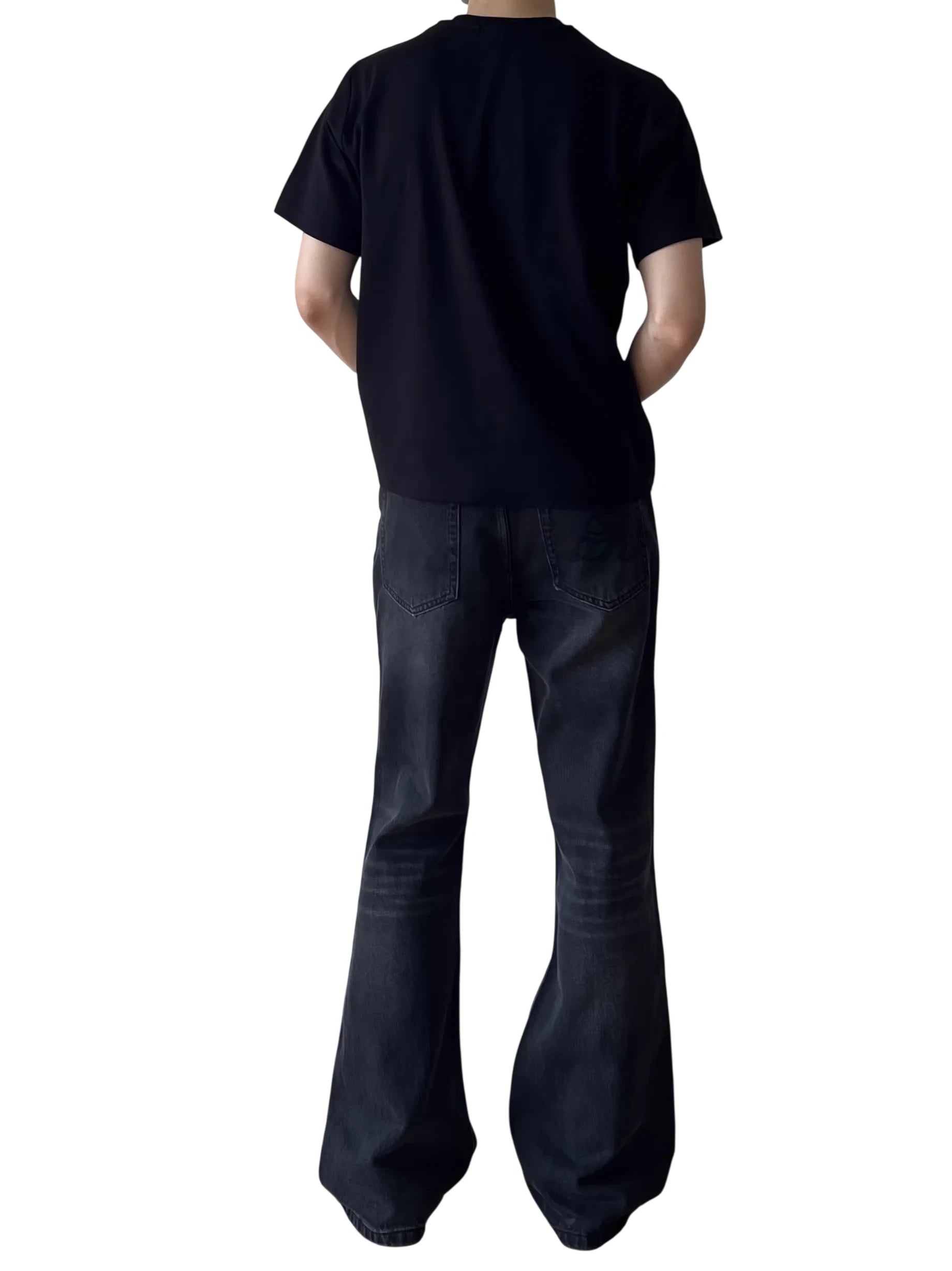 These vintage washed flared black denim jeans offer a timeless silhouette with a modern edge. Featuring a dark wash with subtle fading, they provide a relaxed and oversized fit for all-day comfort and effortless style. Designed for men, the straight-leg cut flares slightly at the bottom, adding a touch of retro-inspired flair. Perfect when paired with casual tees or layered looks.