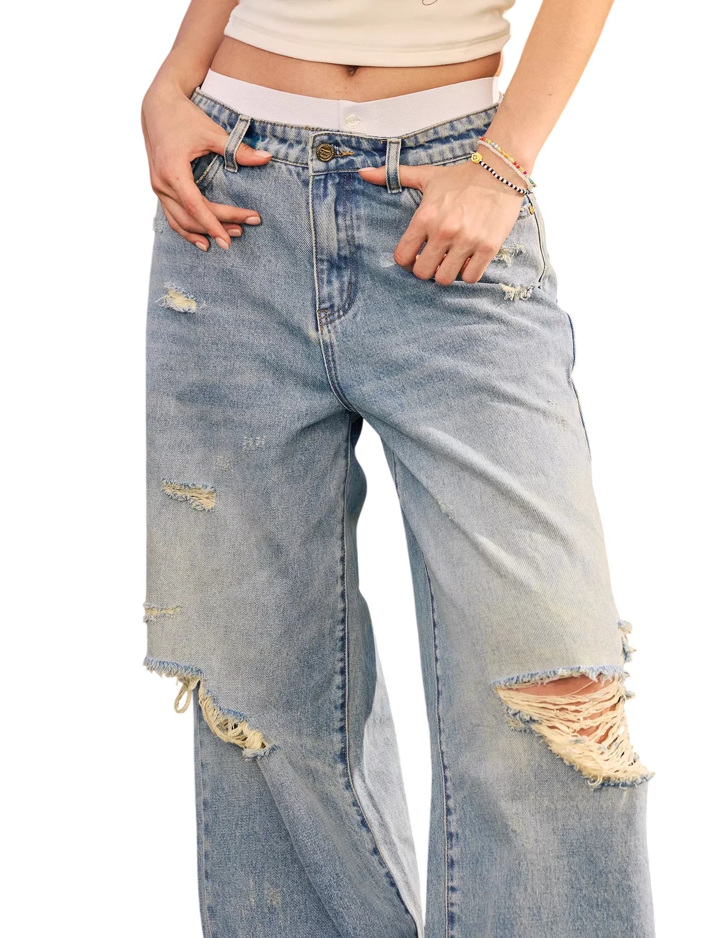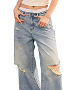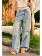 Elevate your casual style with these light blue, high-waisted wide-leg jeans designed for women. Featuring a relaxed fit, these denim pants offer heavy distressing on the knees and thighs for a trendy, worn-in look. Complete with front and back pockets, a zip fly, and button closure, they are perfect for effortless summertime ensembles.