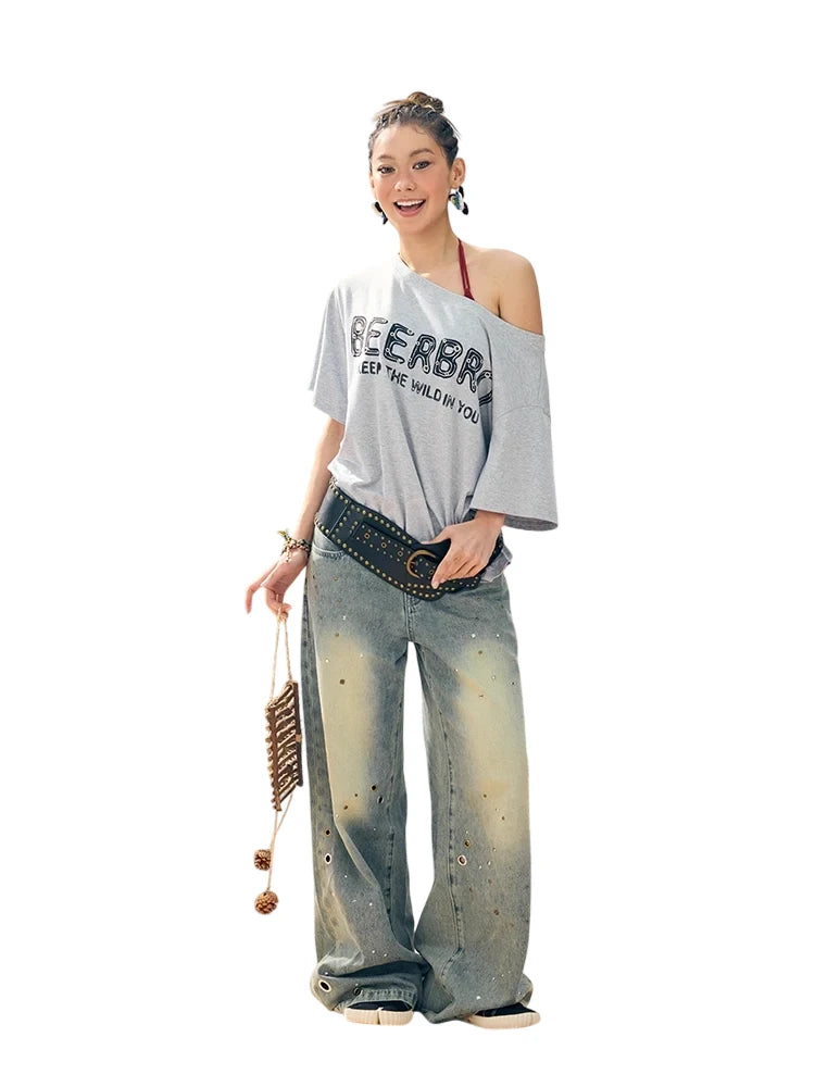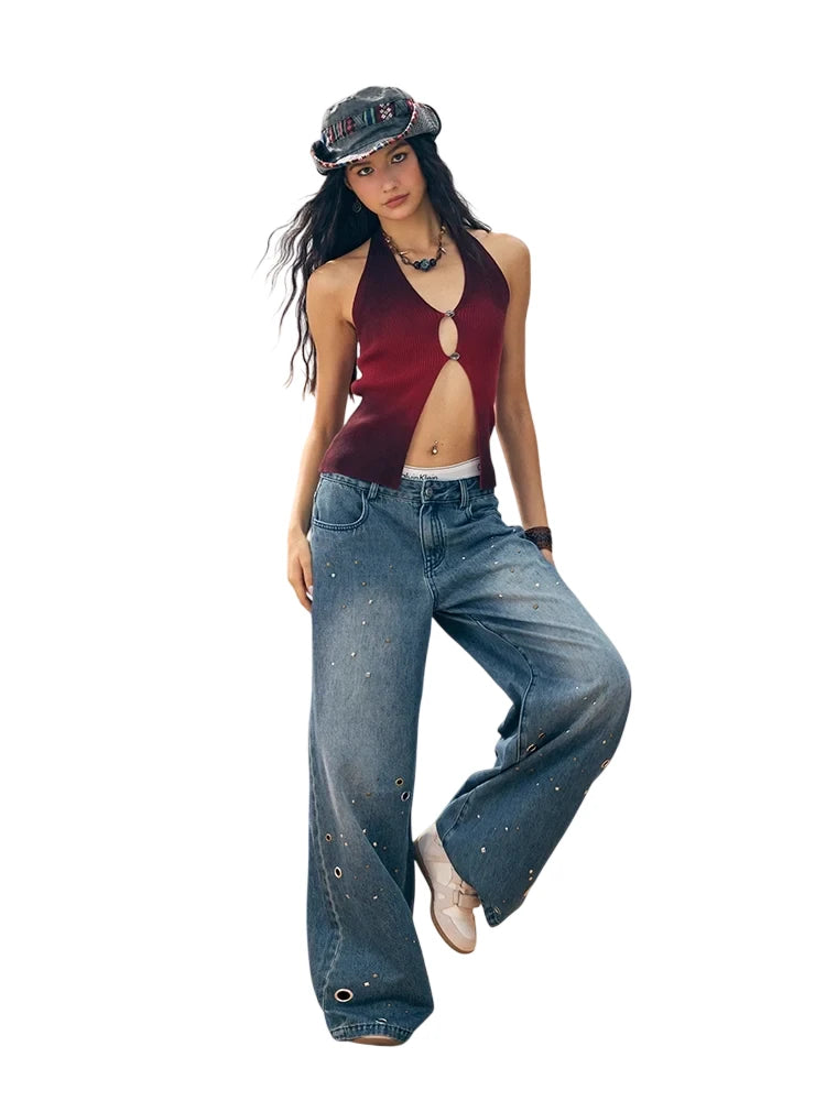 Elevate your summer wardrobe with these distressed wide-leg denim pants designed for women. Featuring a high-waisted silhouette and loose fit, these jeans offer both comfort and a flattering slimming effect. Metallic grommets and bead-like embellishments add an edgy, stylish touch, making them a standout piece for casual or festival-ready looks. Perfect for pairing with cropped tops or tucked-in blouses.