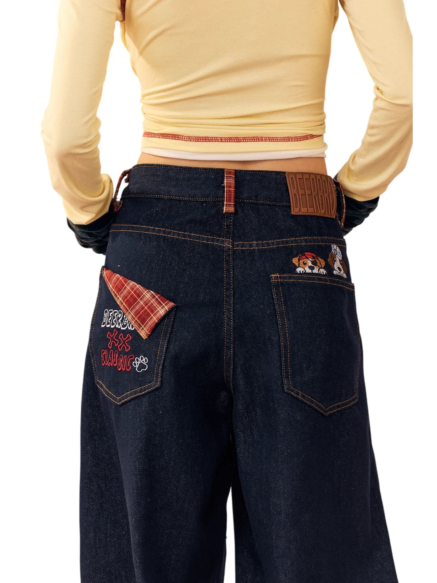 These women's high-waisted straight-leg jeans offer a bold blend of comfort and streetwear flair. Crafted from durable dark denim, they feature colorful embroidered and printed cartoon-style dog and paw graphics along the legs for a playful edge. Contrasted with red stitching and red plaid fabric peeking from the folded cuffs, these jeans bring both personality and urban style to your wardrobe. Designed with classic pockets and belt loops for everyday functionality.