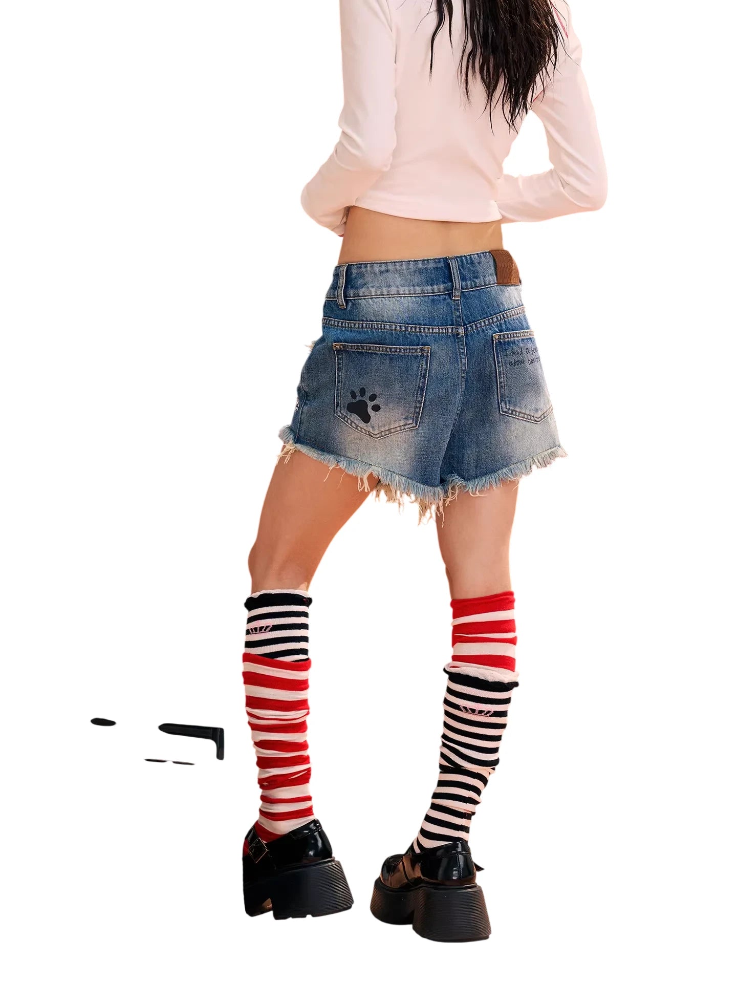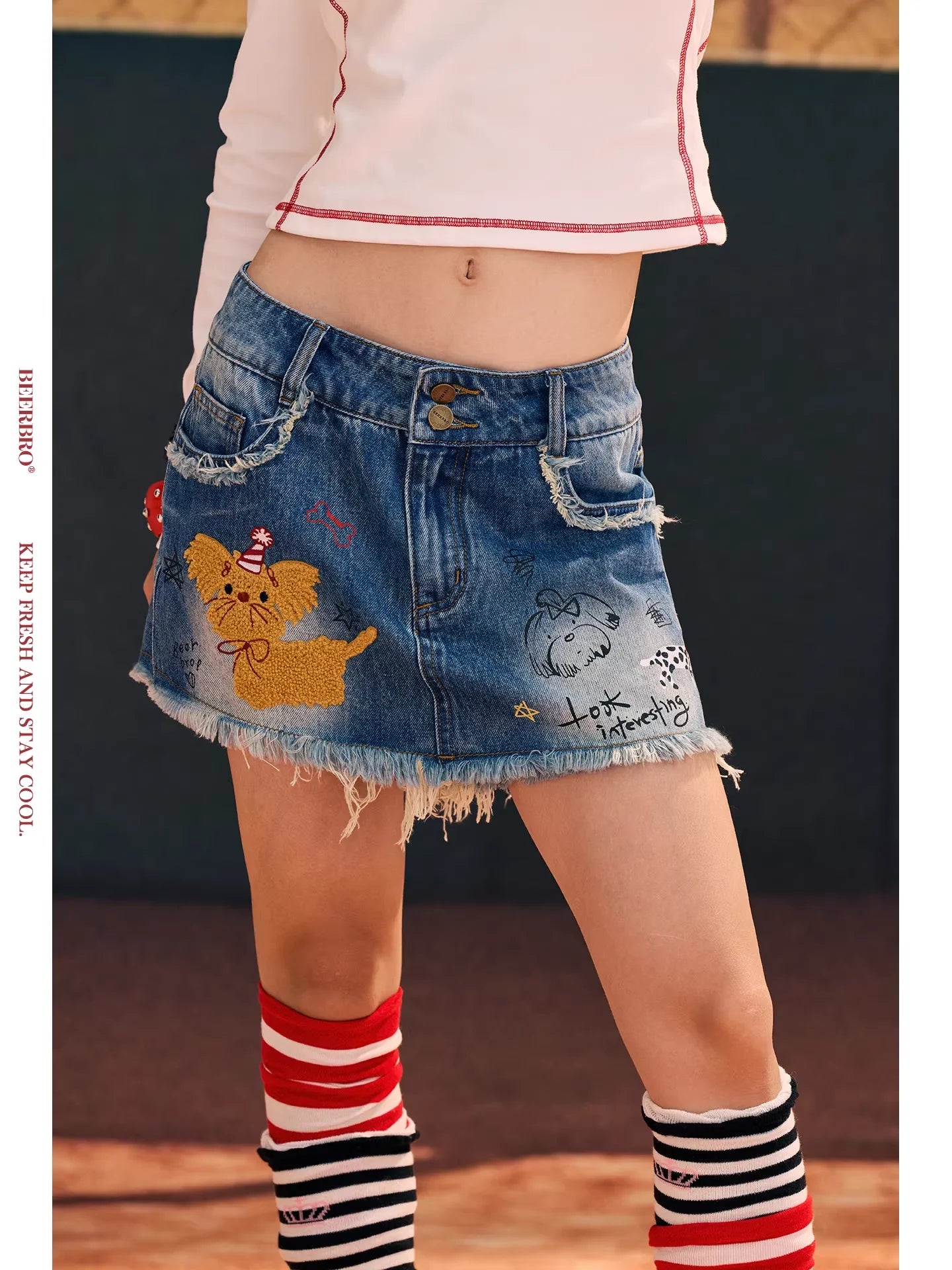 BeerBro Graffiti Embroidered Denim Mini Skirt with Raw Hem for Women