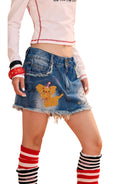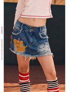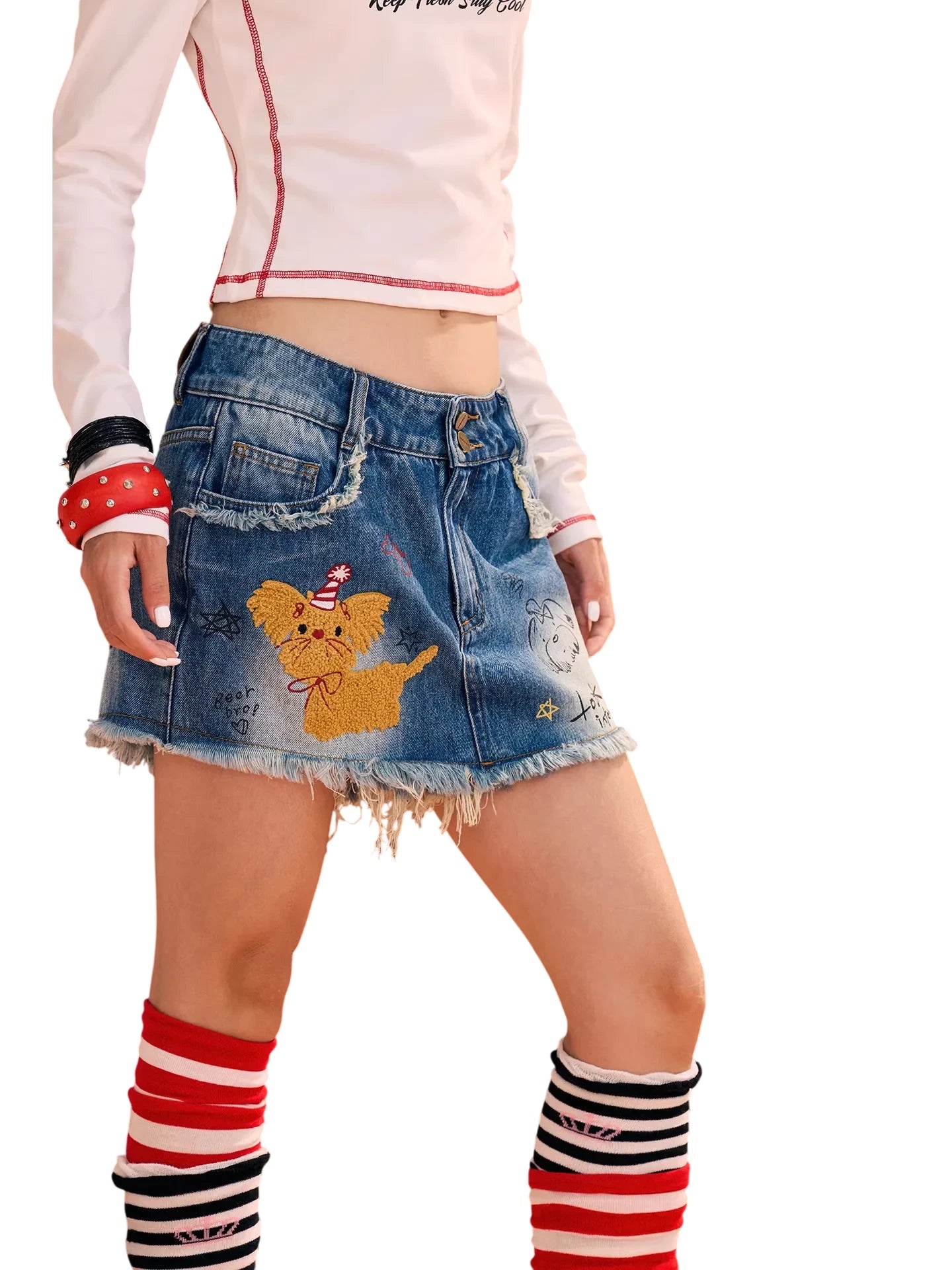 Express your playful side with this stylish denim mini skirt designed for women. Featuring colorful graffiti-inspired embroidery including cartoon puppy motifs, stars, and quirky text phrases, this skirt brings a youthful street style vibe to your wardrobe. The raw hemline adds an edgy touch while the medium blue wash offers a relaxed, worn-in look. Classic five-pocket styling, a double-button closure, and zip fly complete this versatile autumn-ready piece.