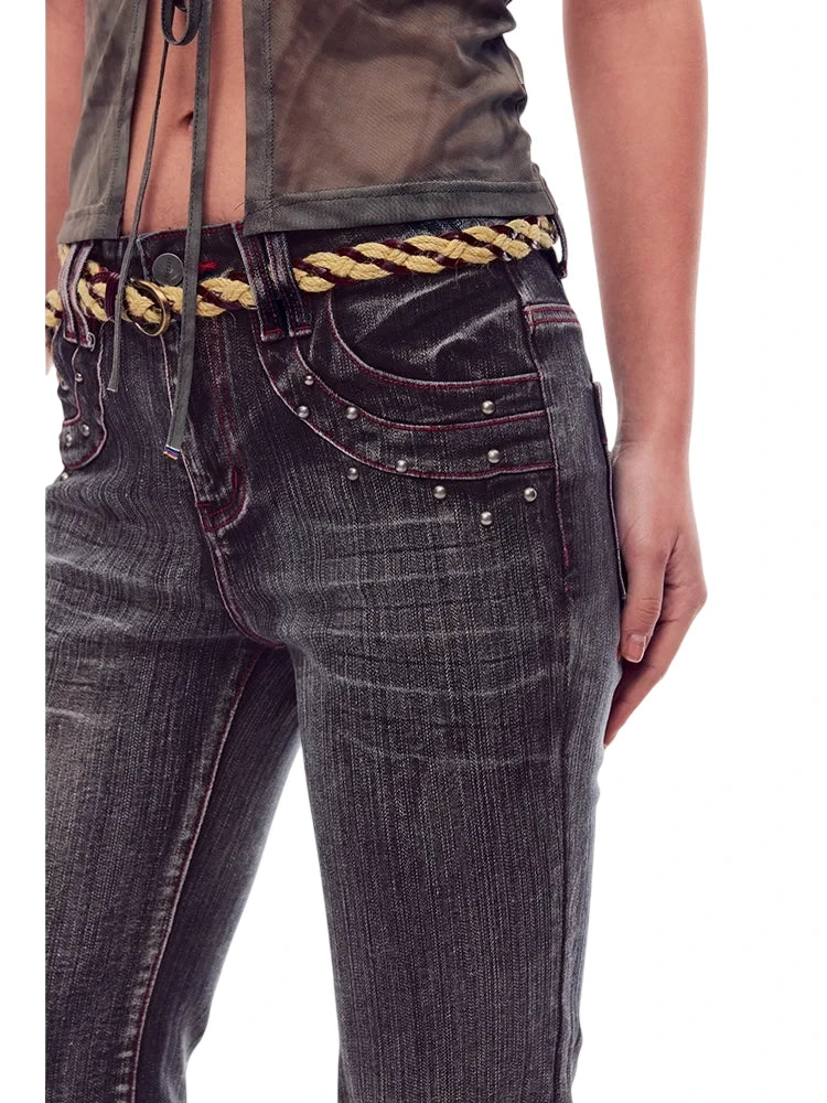 Elevate your casual style with these fashion-forward low-rise flared jeans, designed to flatter with their tailored silhouette and subtle whisker detailing. Crafted in a dark wash with light distressing, the denim offers a modern twist on a classic look. Perfectly paired with crop tops or casual wear, these jeans are an ideal choice for the style-conscious woman. Finished with a statement rope-style belt to complete the outfit.