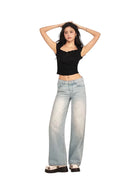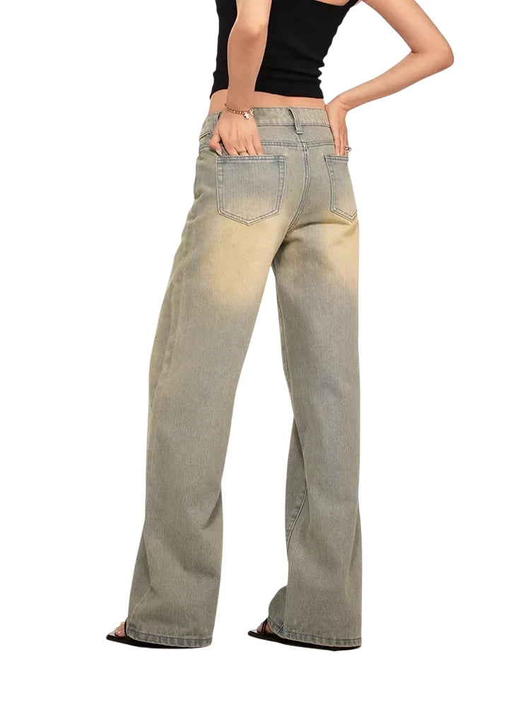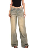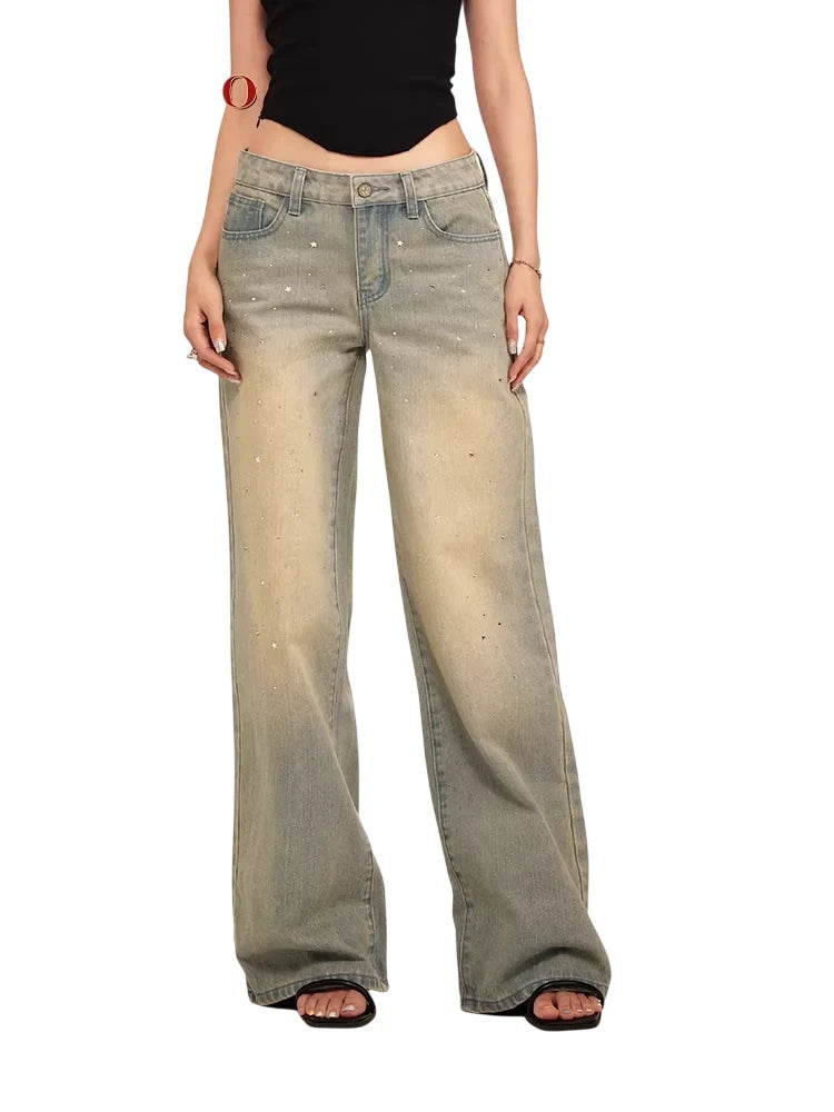 BeerBro Retro High-Waisted Wide-Leg Jeans with Rhinestone Detail