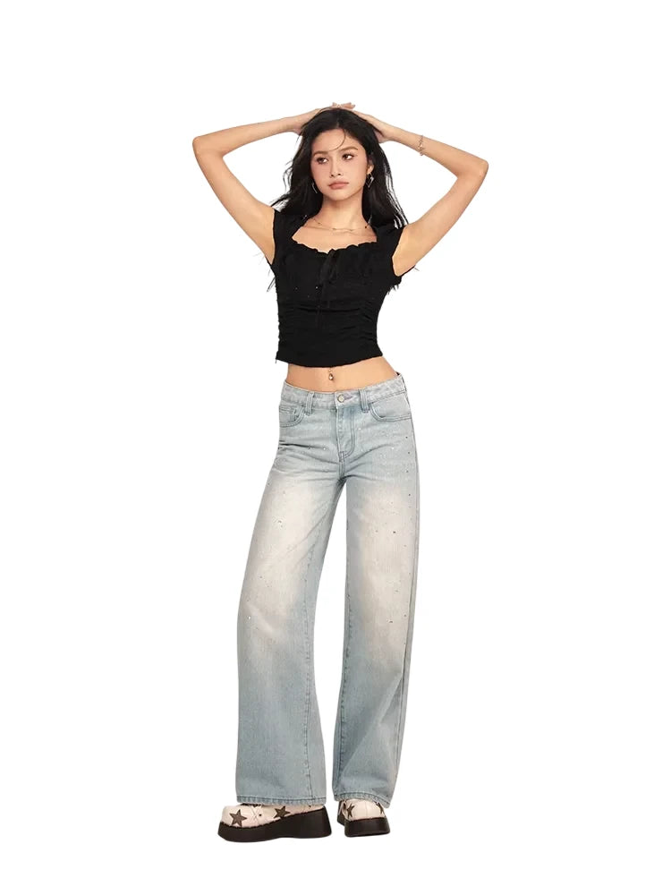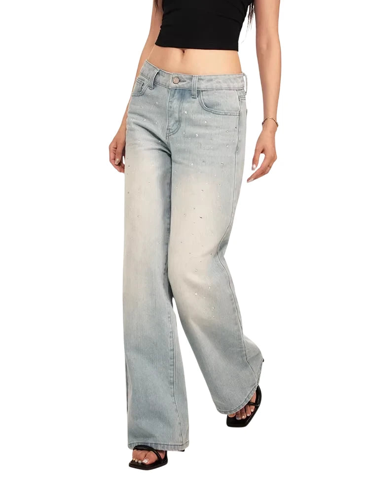 Elevate your everyday style with these women's retro-inspired high-waisted jeans. Crafted from light wash denim, they feature a flattering wide-leg silhouette and a classic five-pocket design. Scattered rhinestone embellishments on the front provide a subtle sparkle, making these jeans a standout piece for casual or dressier looks. The button and zip fly closure ensure a secure and comfortable fit.