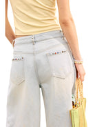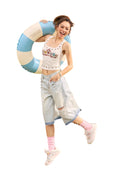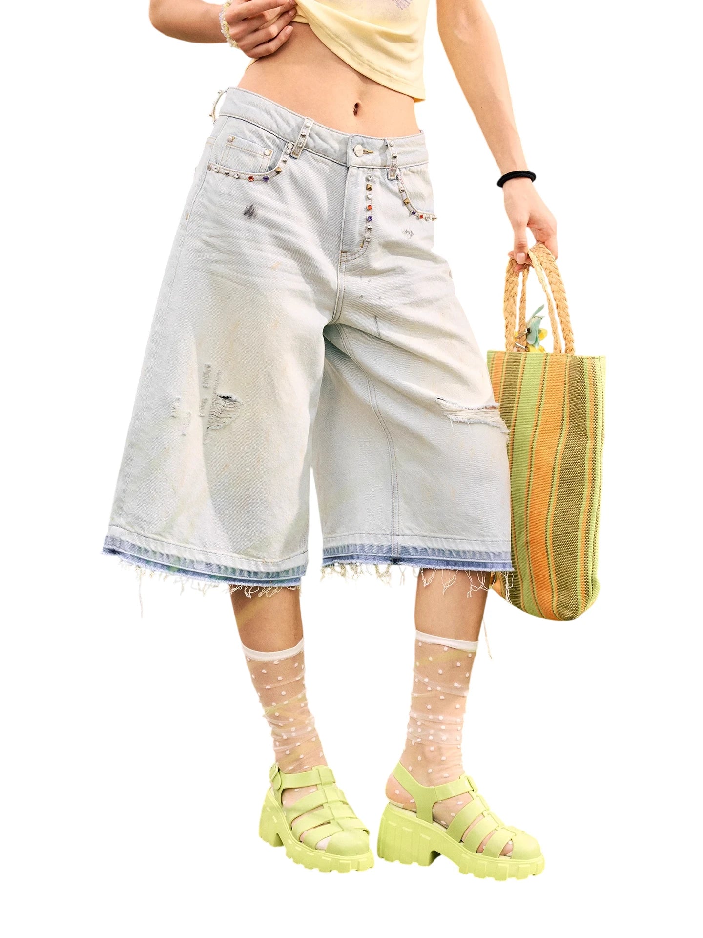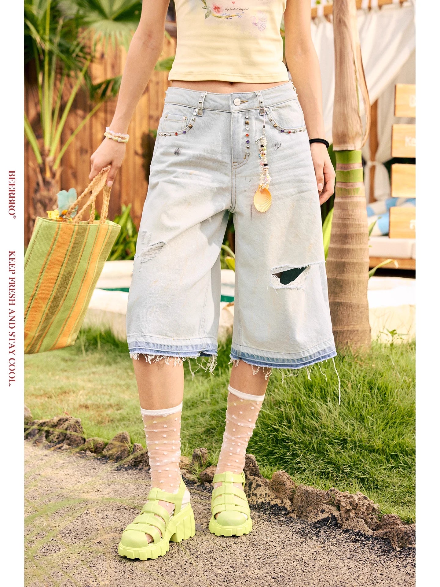 Elevate your casual wardrobe with these stylish distressed denim Bermuda shorts for women. Featuring a light-washed finish, these knee-length shorts are designed with frayed hems and fashionable ripped detailing. The waistband is adorned with decorative rhinestones and a playful beaded keychain accessory, adding a touch of individuality. Perfect for warm weather, these shorts offer a trendy yet relaxed look suitable for a variety of casual occasions.