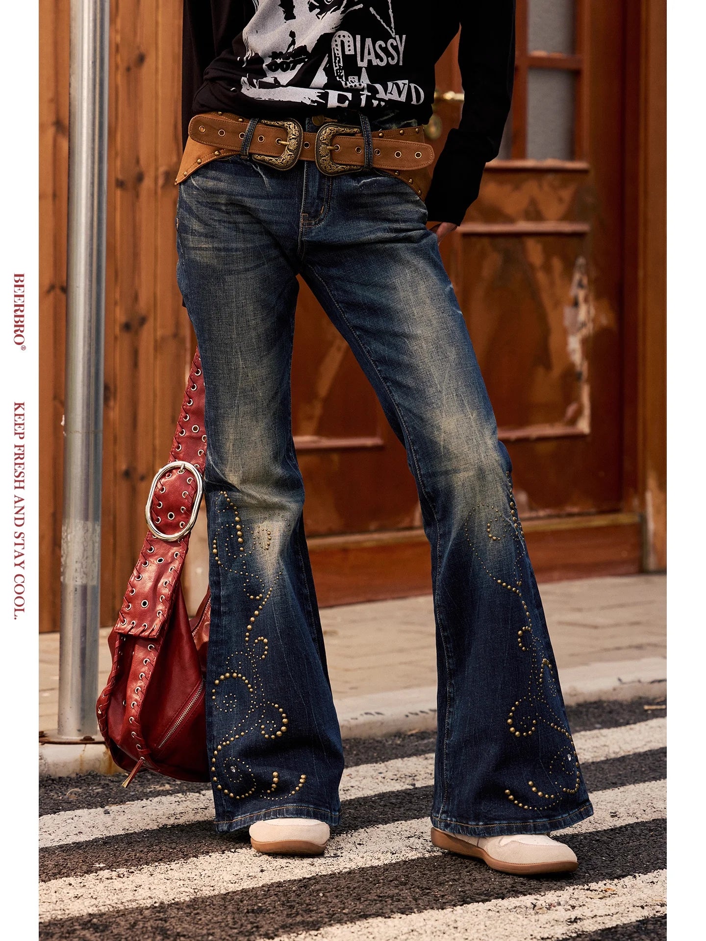 Elevate your Western-inspired wardrobe with these women's slim flared jeans. Crafted with a heavy vintage wash, they feature elegant gold stud and rhinestone embellishments near the lower legs. The mid-rise design is complemented by a wide double-buckle suede belt for added flair. Perfect for creating stylish bohemian looks with a touch of rustic charm.