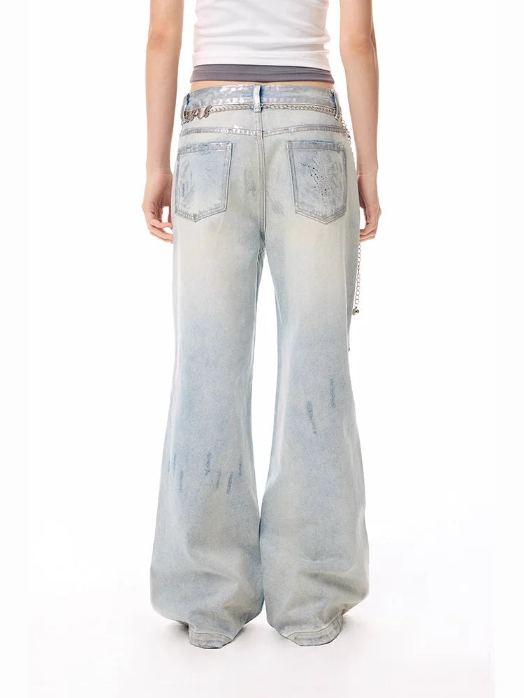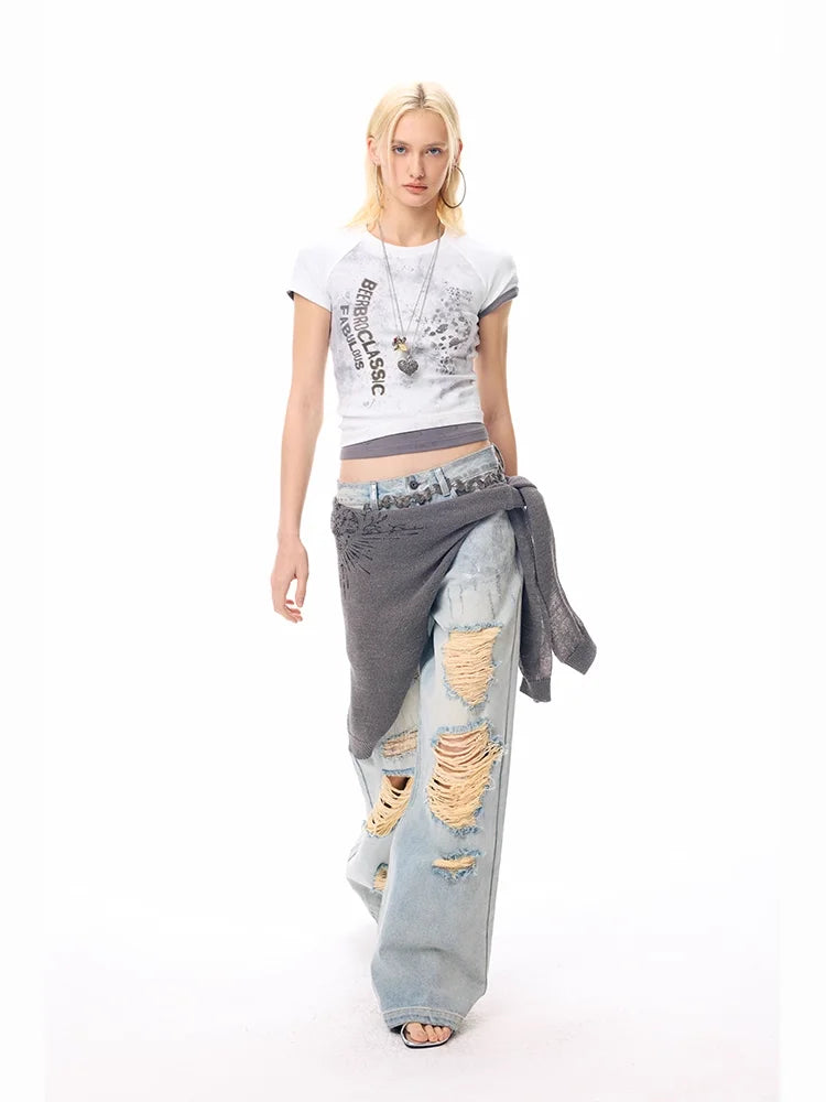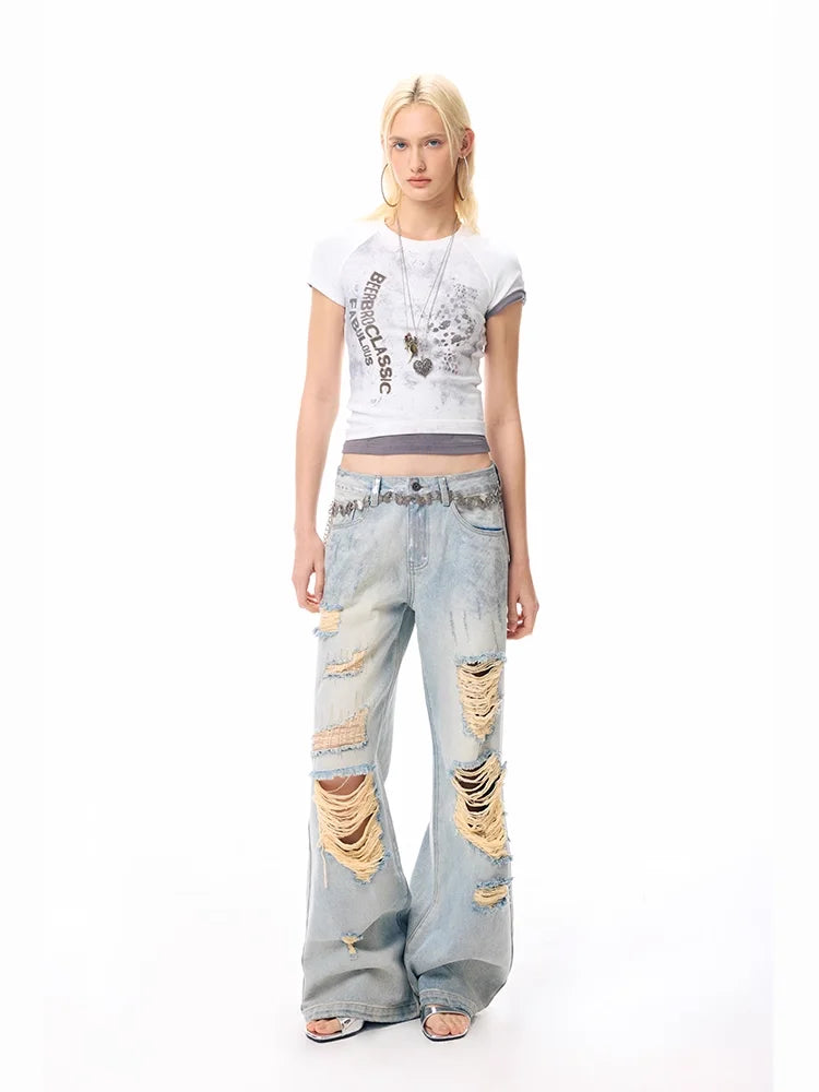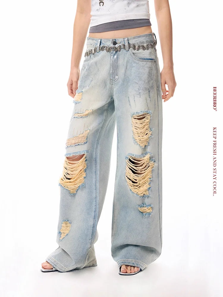 Make a bold statement with these women's high-waisted, wide-leg jeans crafted from soft pure cotton. Featuring heavy distressed detailing and large frayed holes on the front, these jeans offer an edgy, fashion-forward look. The light-wash denim is subtly faded for a vintage vibe, while the classic five-pocket design, belt loops, and button closure provide practical appeal. An attached chain accessory adds an extra touch of attitude, perfect for standing out with modern street style.