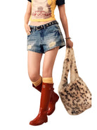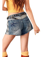 BeerBro Women's Distressed Mid-Low Waist Denim Shorts with Studded Belt