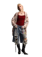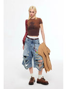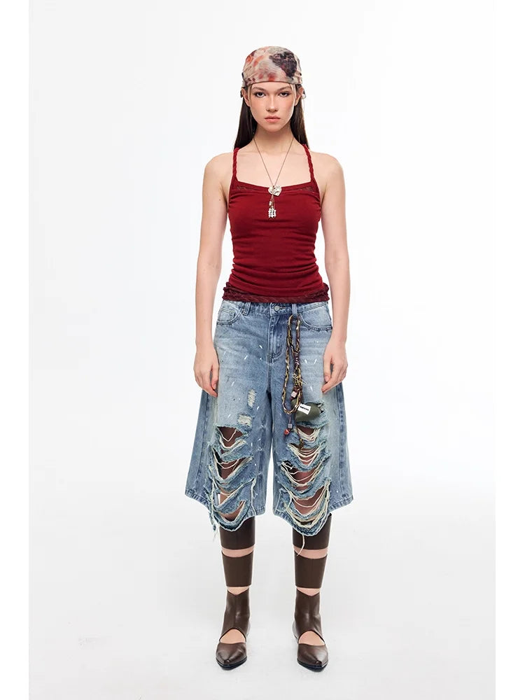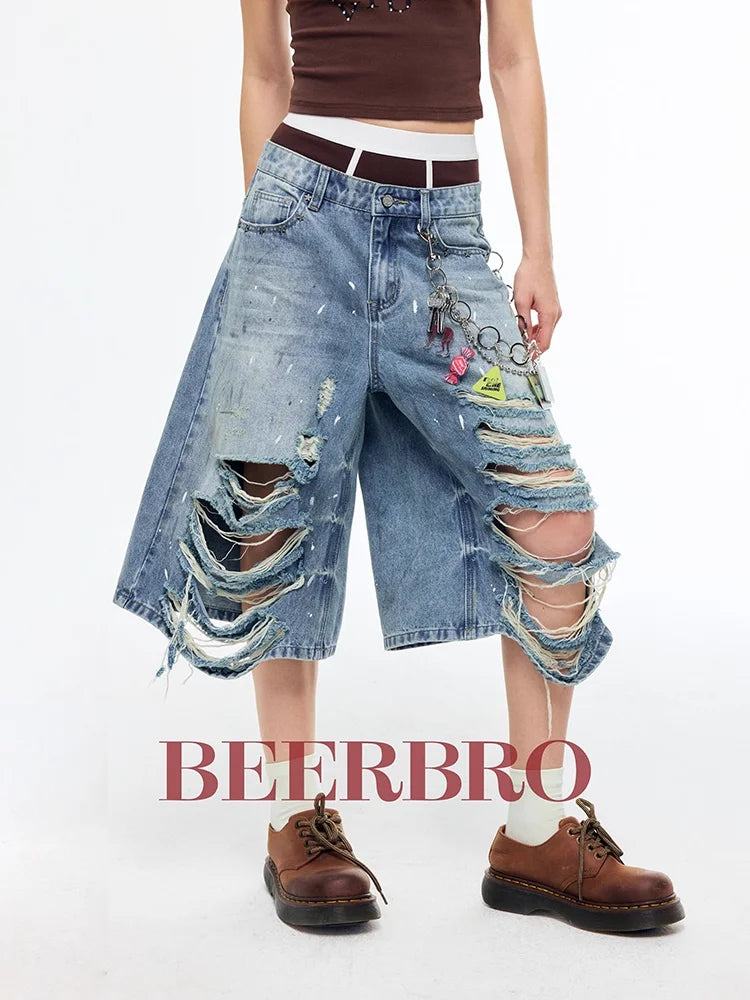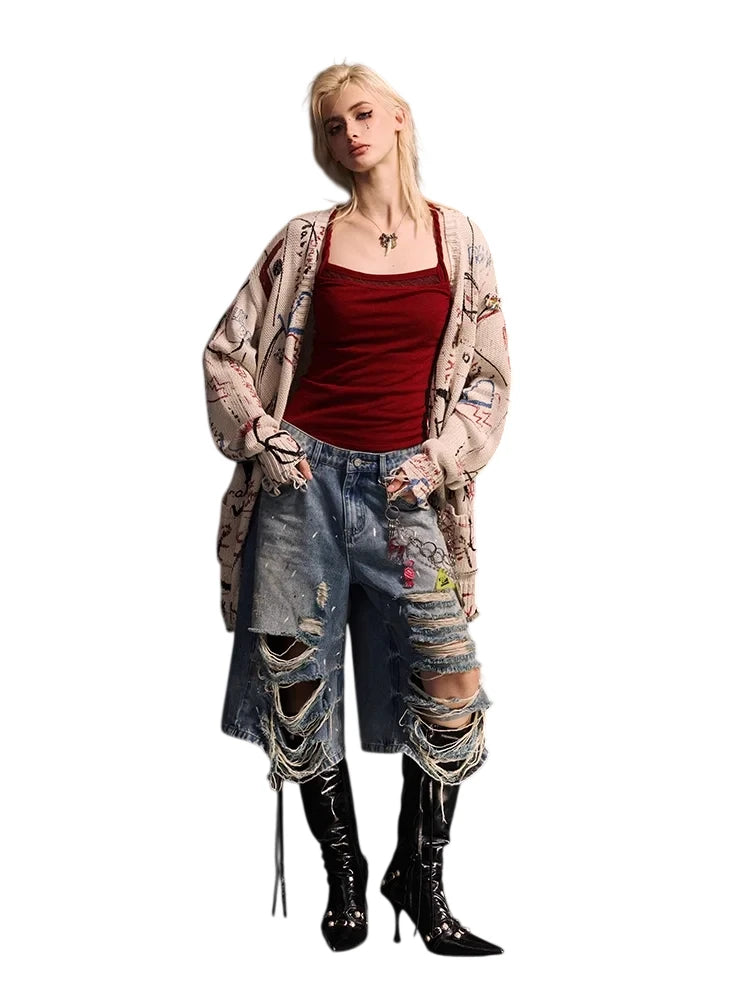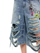 Elevate your streetwear style with these women's distressed denim shorts. Featuring a loose, baggy fit and knee-length cut, these shorts are designed with bold horizontal rips, frayed hems, and expressive paint-splatter details that add a rock-inspired, grunge edge. Perfect for casual days where comfort meets statement fashion.