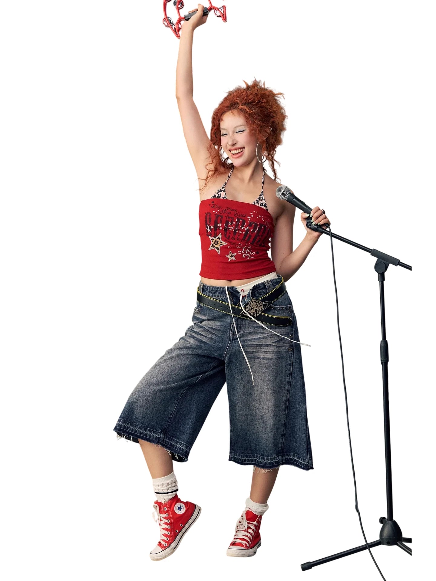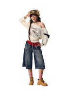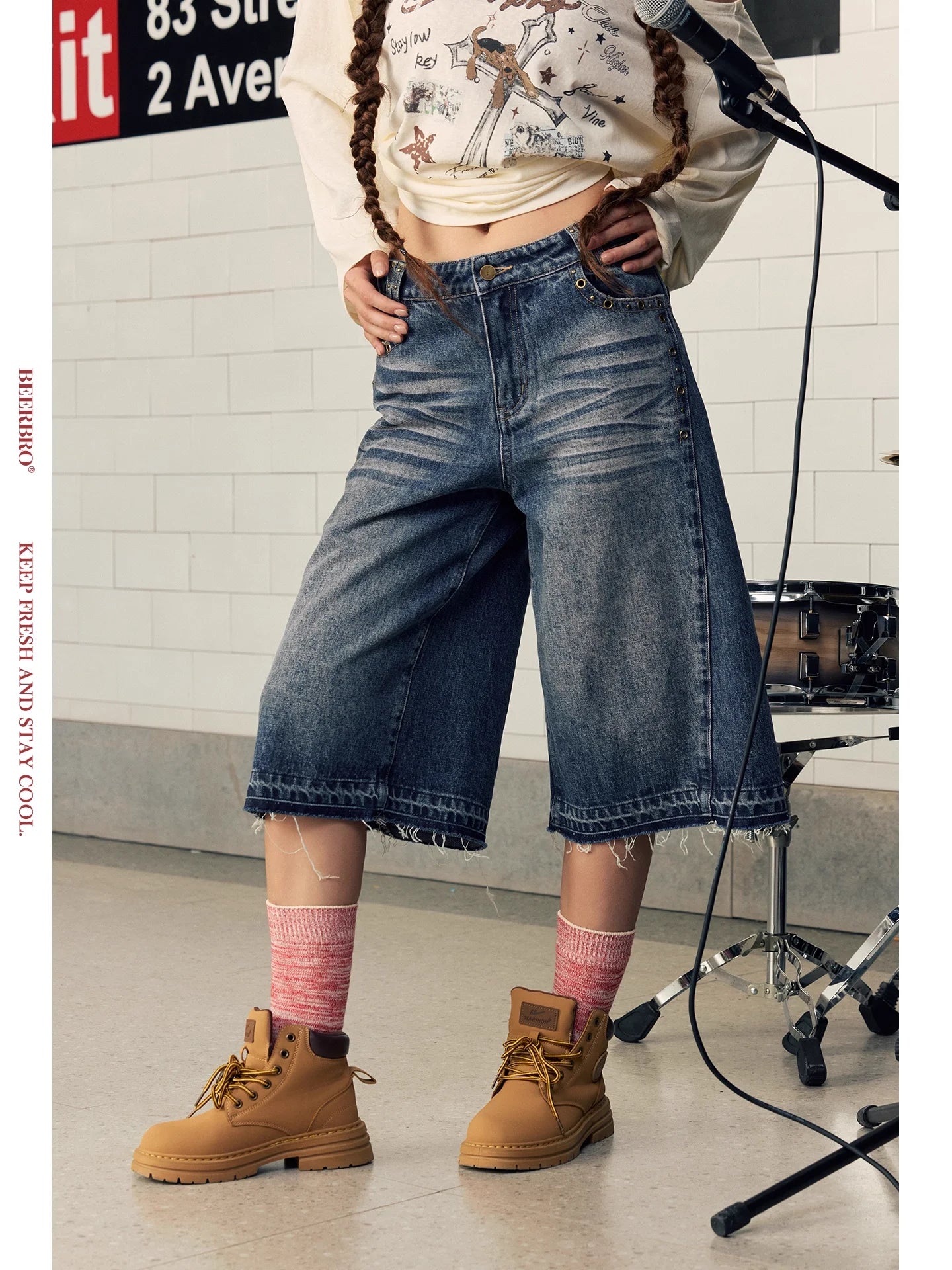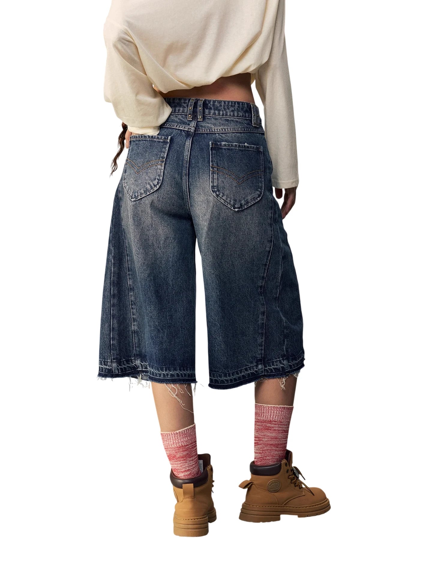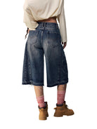 These women's low-waist cropped denim shorts offer a relaxed, street-style look with a wide-leg silhouette and dark-washed finish. Designed with subtle distressing, raw-cut frayed hems, and a classic five-pocket layout, they bring a touch of edge to casual wear. Perfect for pairing with oversized tops and boots, these shorts are ideal for creating a youthful and carefree fashion statement.
