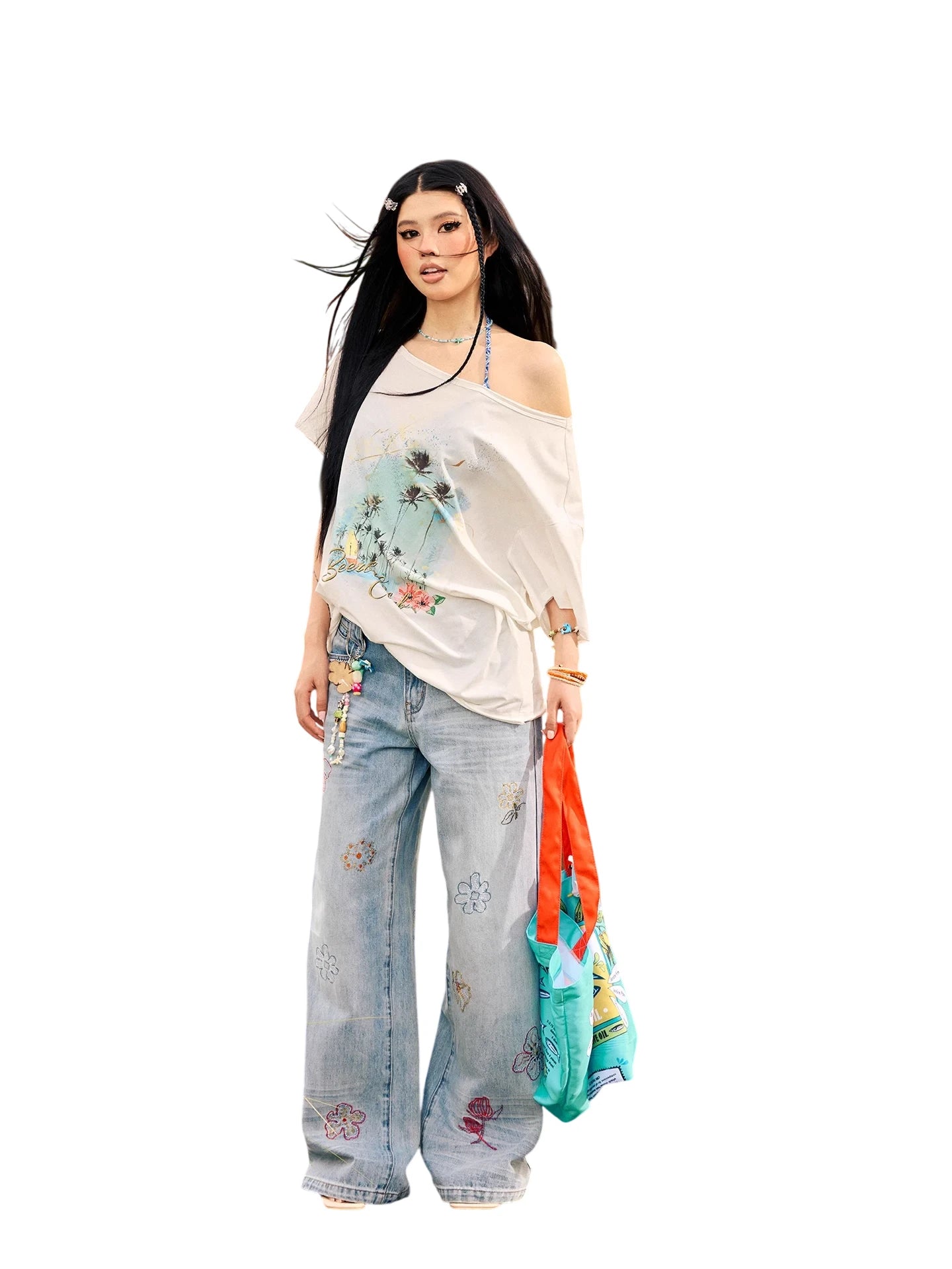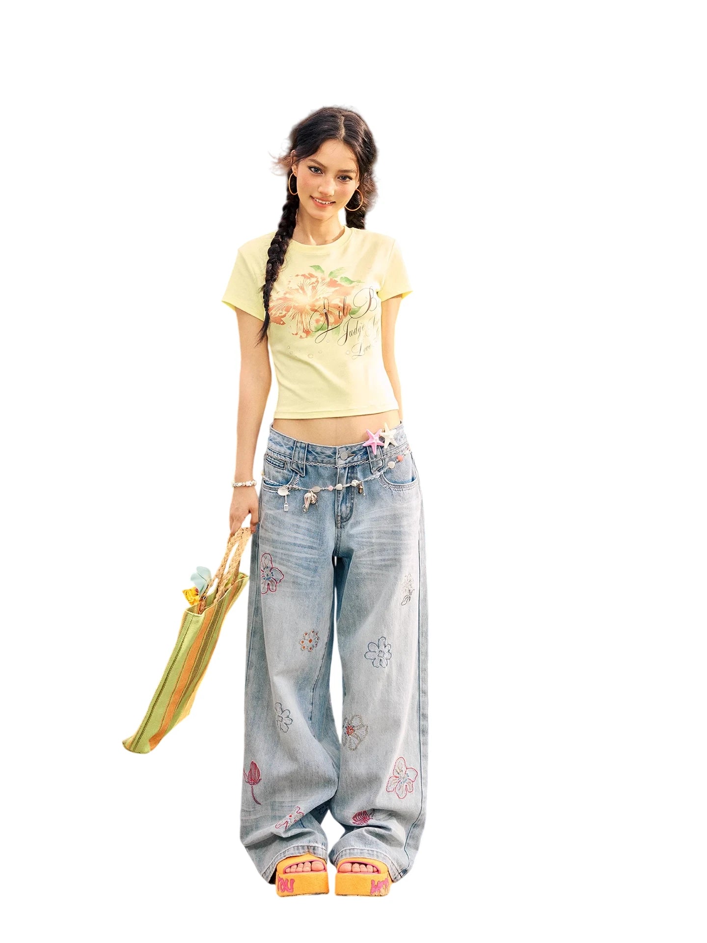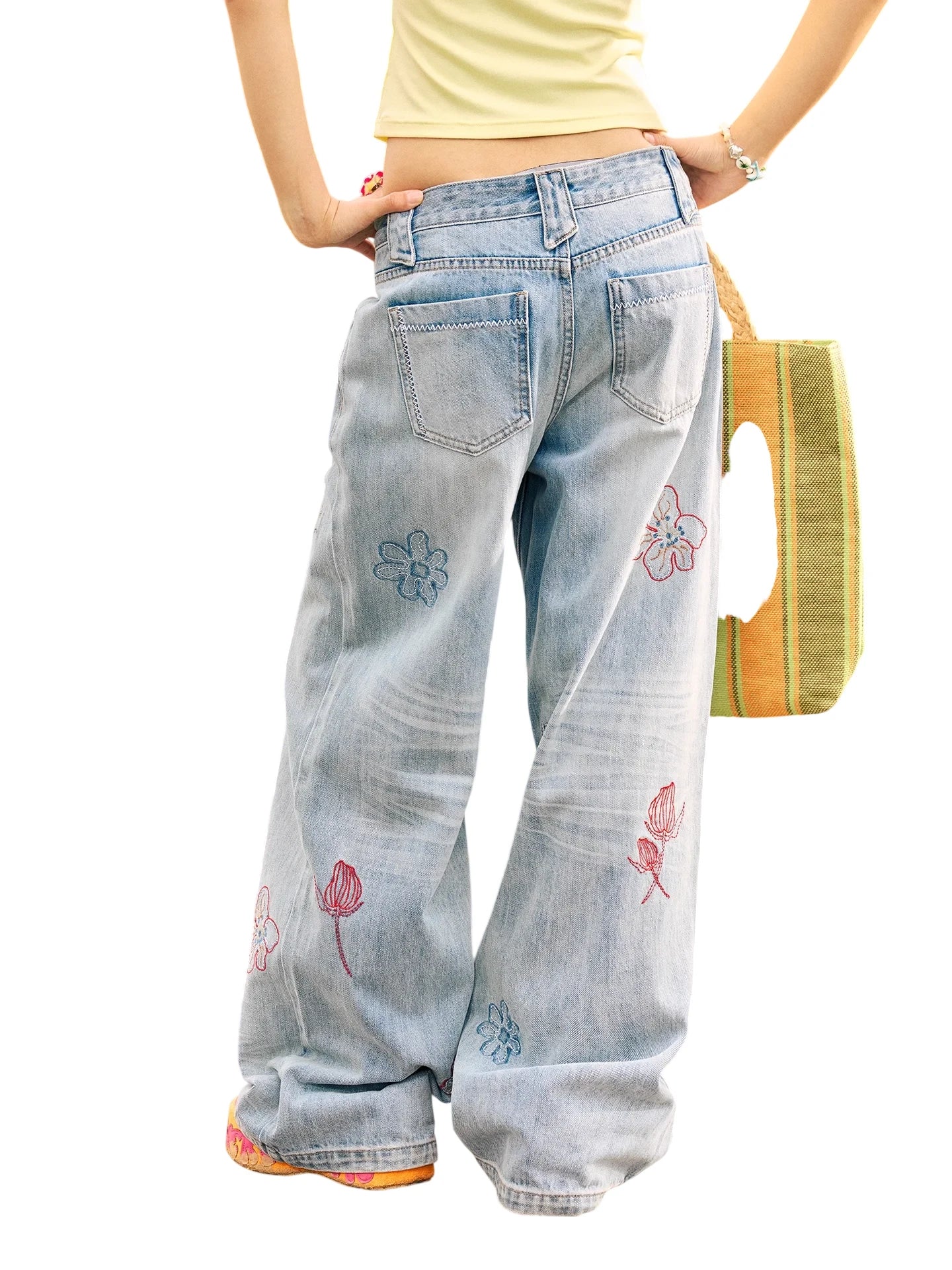 Step into summer with these stylish women's low-waist jeans, crafted from light blue denim with a soft, washed-out finish for a relaxed, casual vibe. Featuring a straight-leg silhouette, these jeans are decorated with colorful floral embroidery in pink, purple, and red tones. Complete with a traditional button and zip closure and front and back pockets, they effortlessly combine comfort and playful charm.