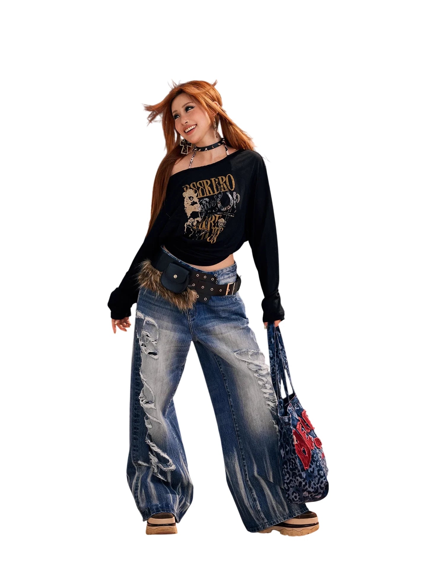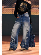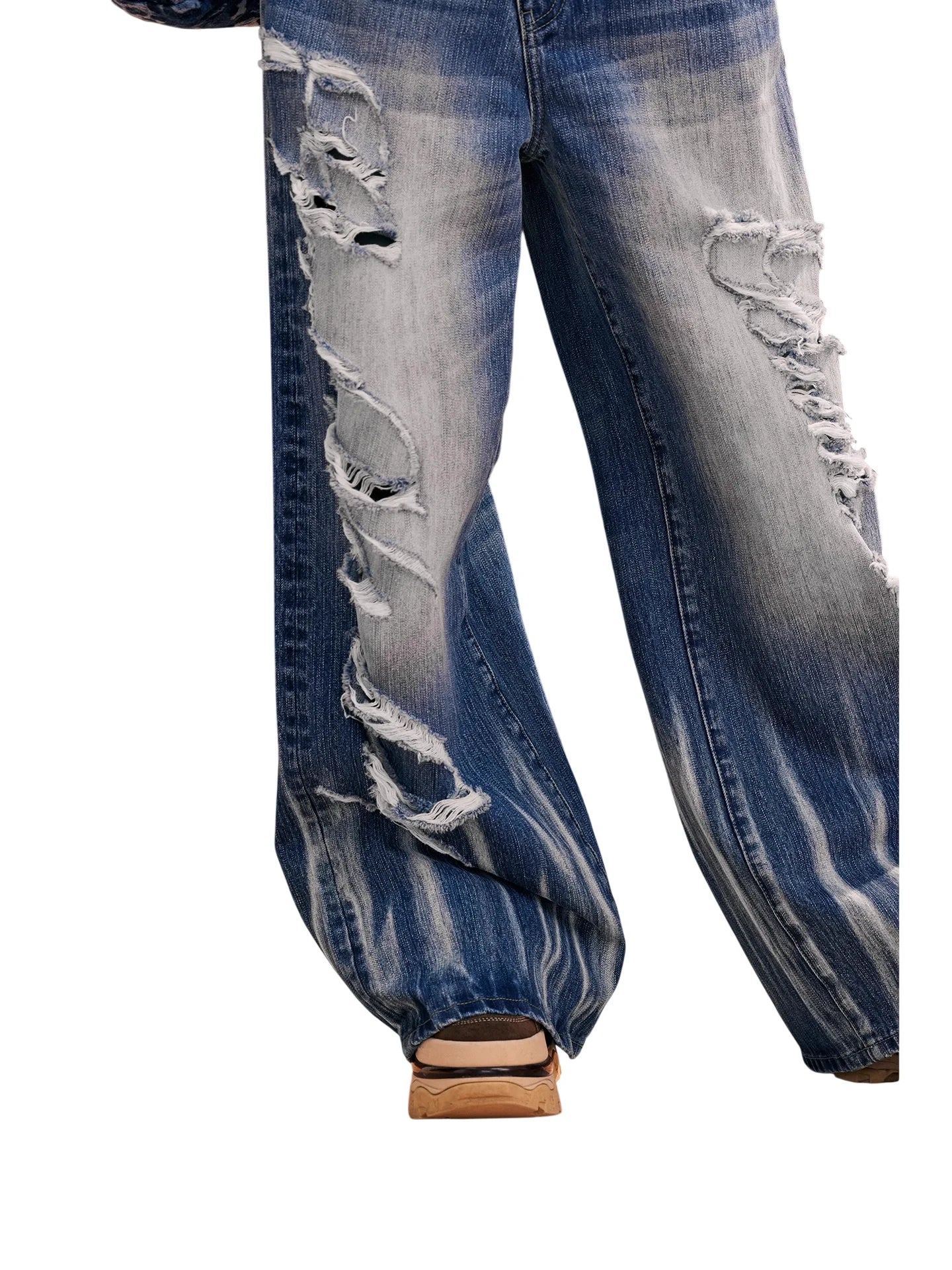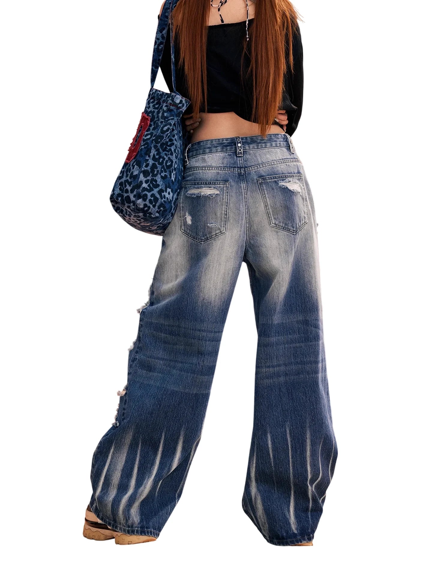 BeerBro Women's Relaxed Fit Distressed Wide-Leg Jeans