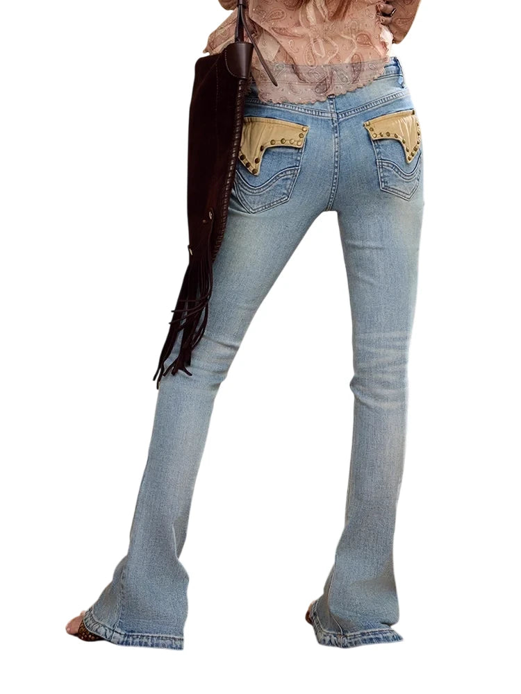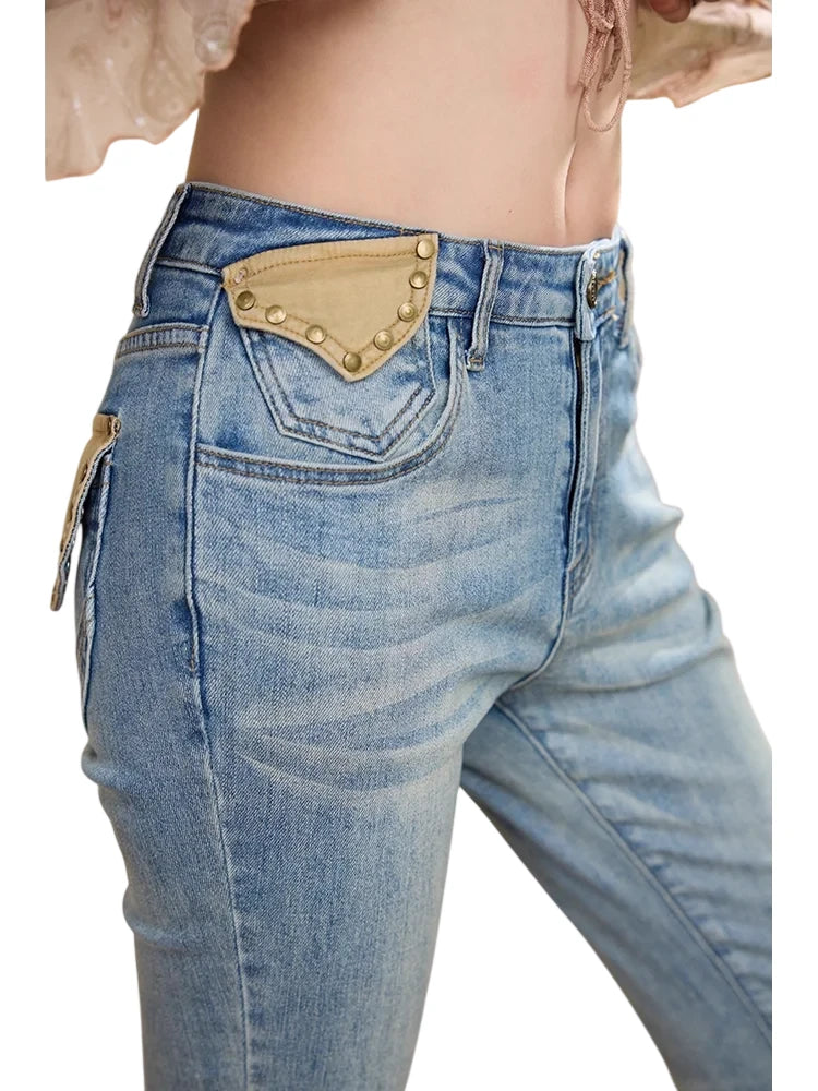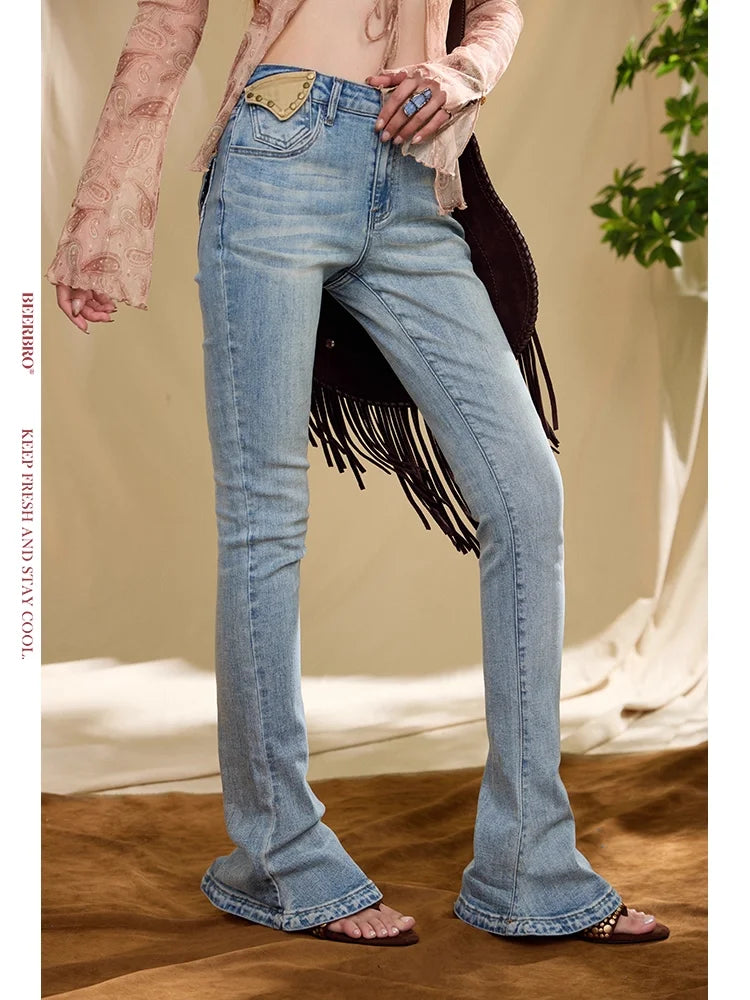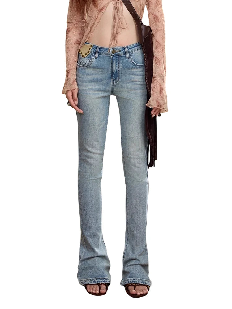 Step up your style with these women's slim fit flared denim jeans. Crafted in a light-wash finish, these jeans feature a flattering mid-rise waist and a slightly faded design for a casual-chic look. The straight-leg silhouette subtly flares at the bottom, blending classic and contemporary elements. A standout detail includes a unique triangular waistband accent with metallic rivets, adding a trendy touch to your outfit.