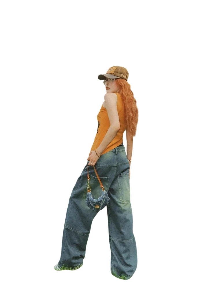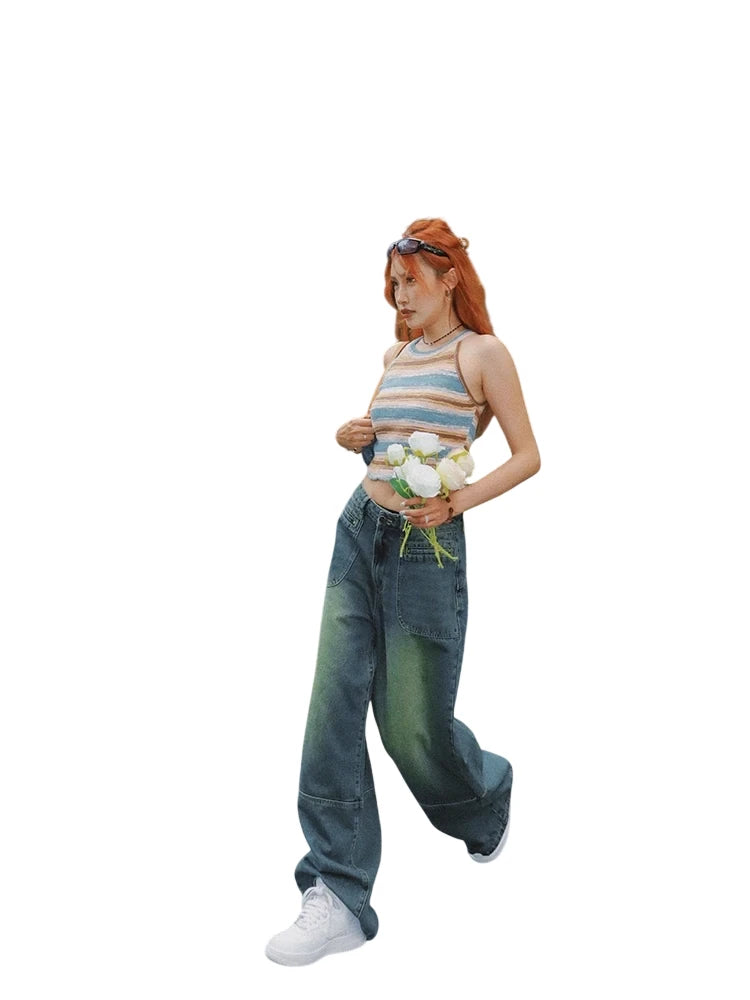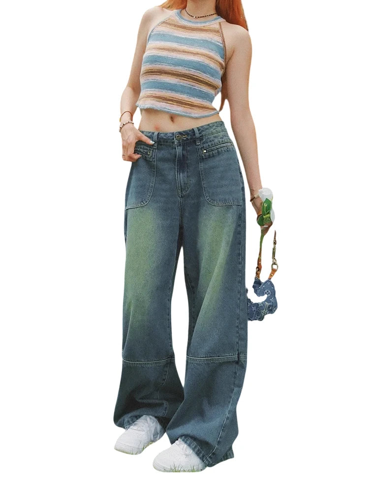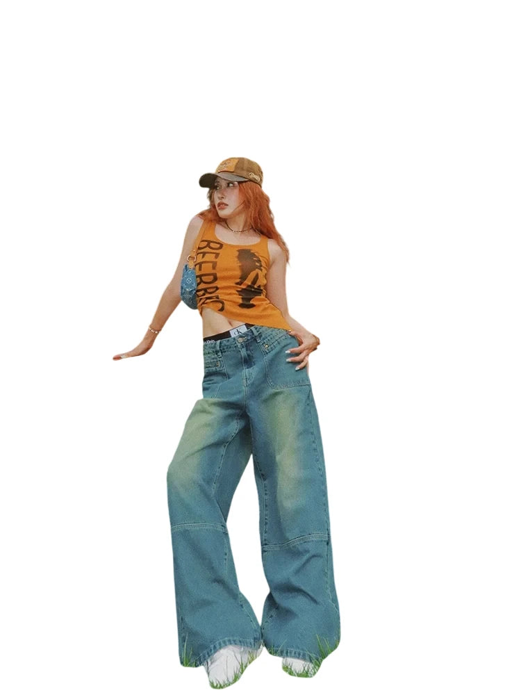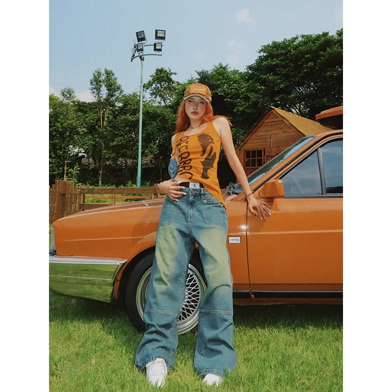 Elevate your casual wardrobe with these women's washed blue straight-leg denim jeans, designed for a bold summer streetwear look. Featuring a low-rise fit and a relaxed silhouette, these jeans offer both comfort and style. The faded wash and contrast cuff details add a vintage-inspired touch, perfect for pairing with graphic tanks and caps. Ideal for outdoor hangouts or urban adventures, these jeans bring retro flair to your seasonal staples.