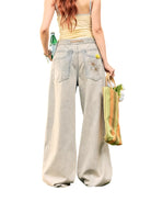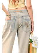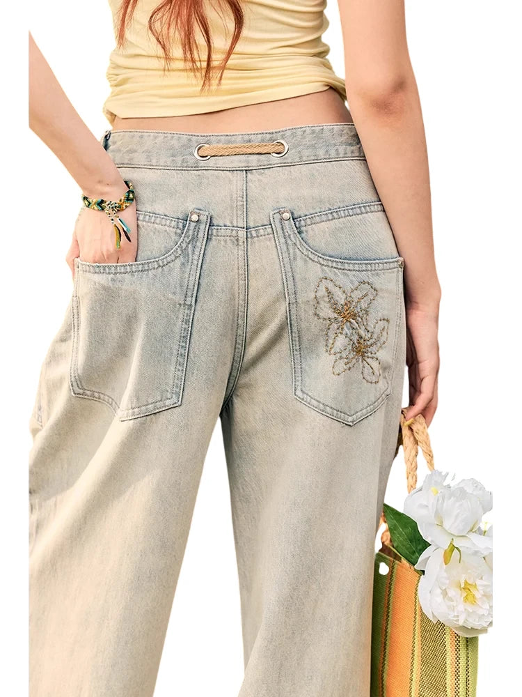 BeerBro Women's Wide-Leg Drawstring Embroidered Denim Pants