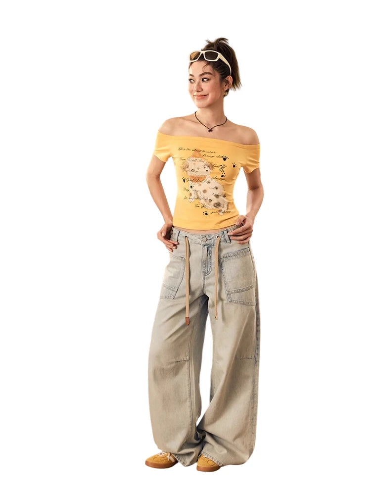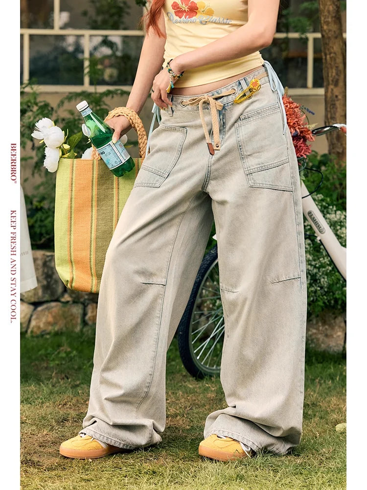 Elevate your casual summer style with these high-waisted, wide-leg denim pants for women. Crafted from soft washed cotton, they feature a relaxed straight-leg fit, prominent front patch pockets, and a comfortable drawstring waistband. Decorative embroidery and a colorful cloth belt add playful charm, making them a comfortable yet fashionable choice for outdoor outings or everyday wear.