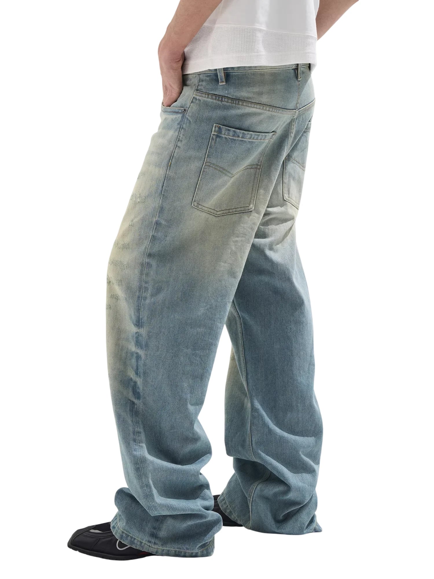 These men's wide-leg denim jeans feature a light blue whisker-washed finish with heavy fading and bleached detailing on the front thighs. Designed for a relaxed, street-ready look, the jeans offer a loose, oversized fit that extends past the shoes. Subtle whiskering, distressed patches, and classic five-pocket styling complete the contemporary design.