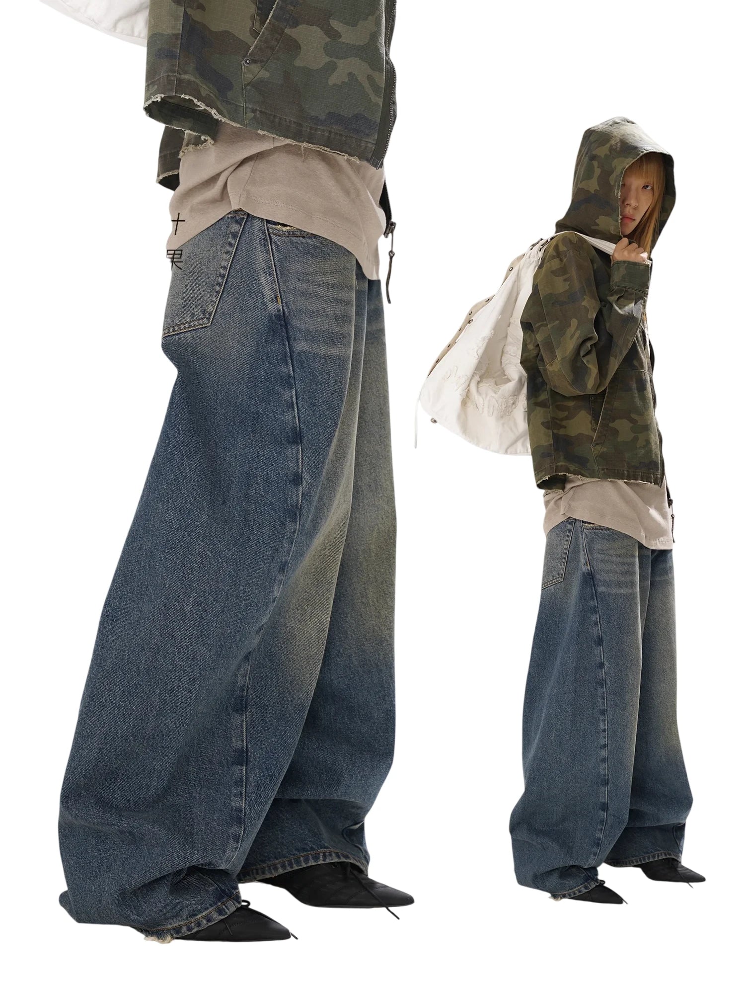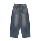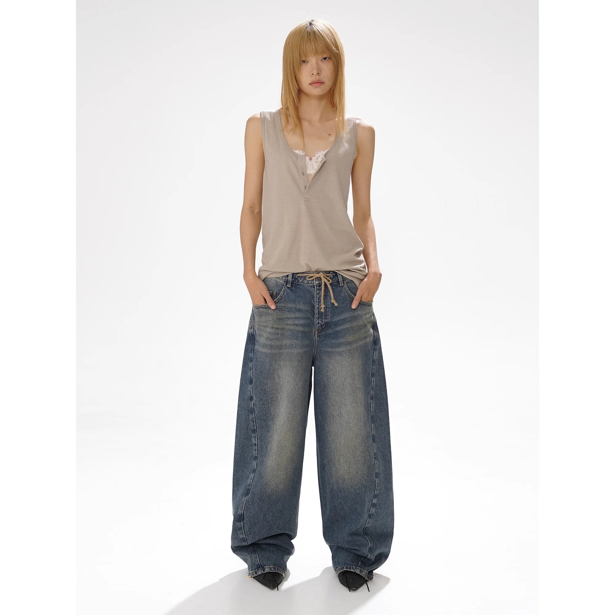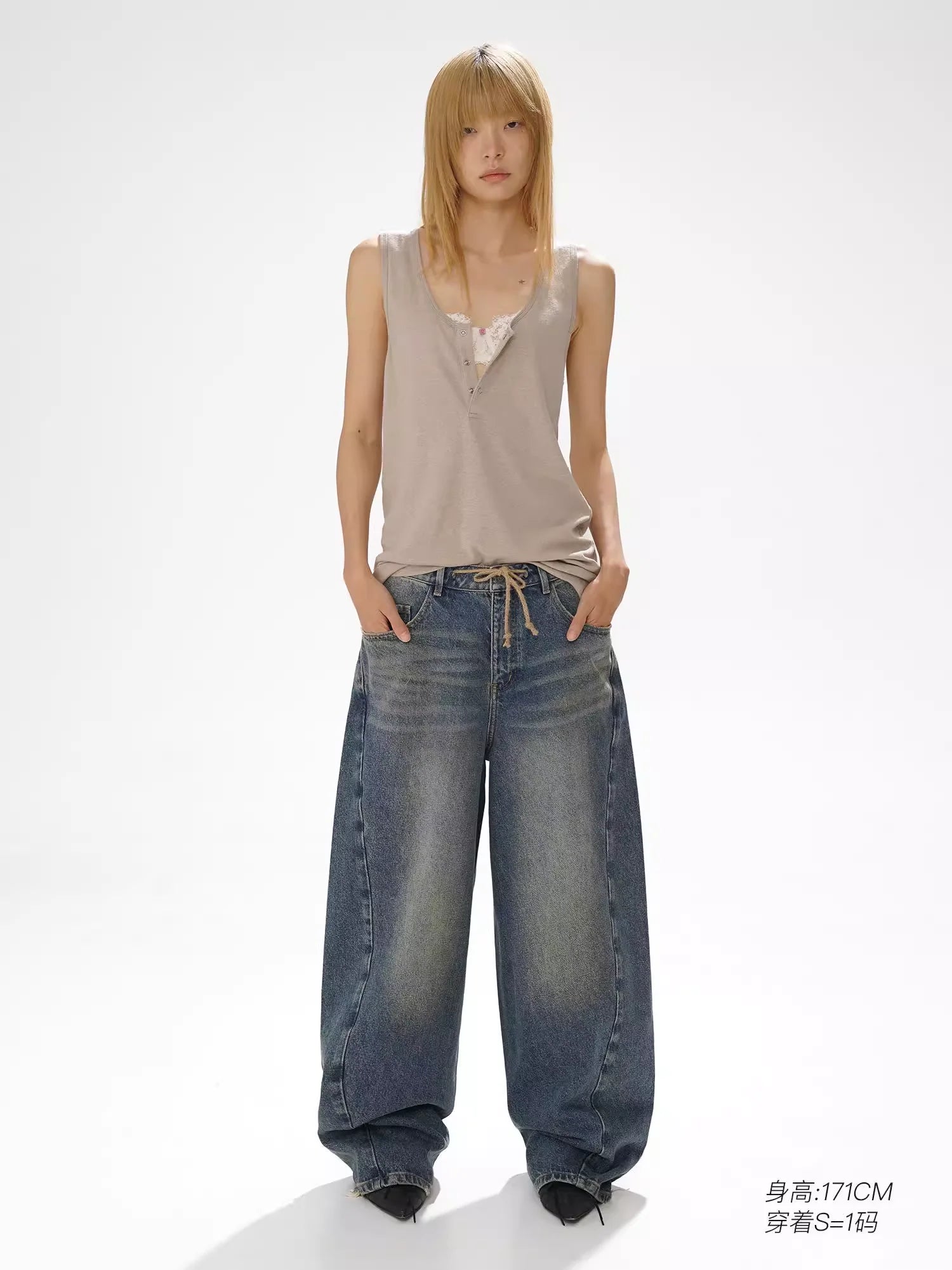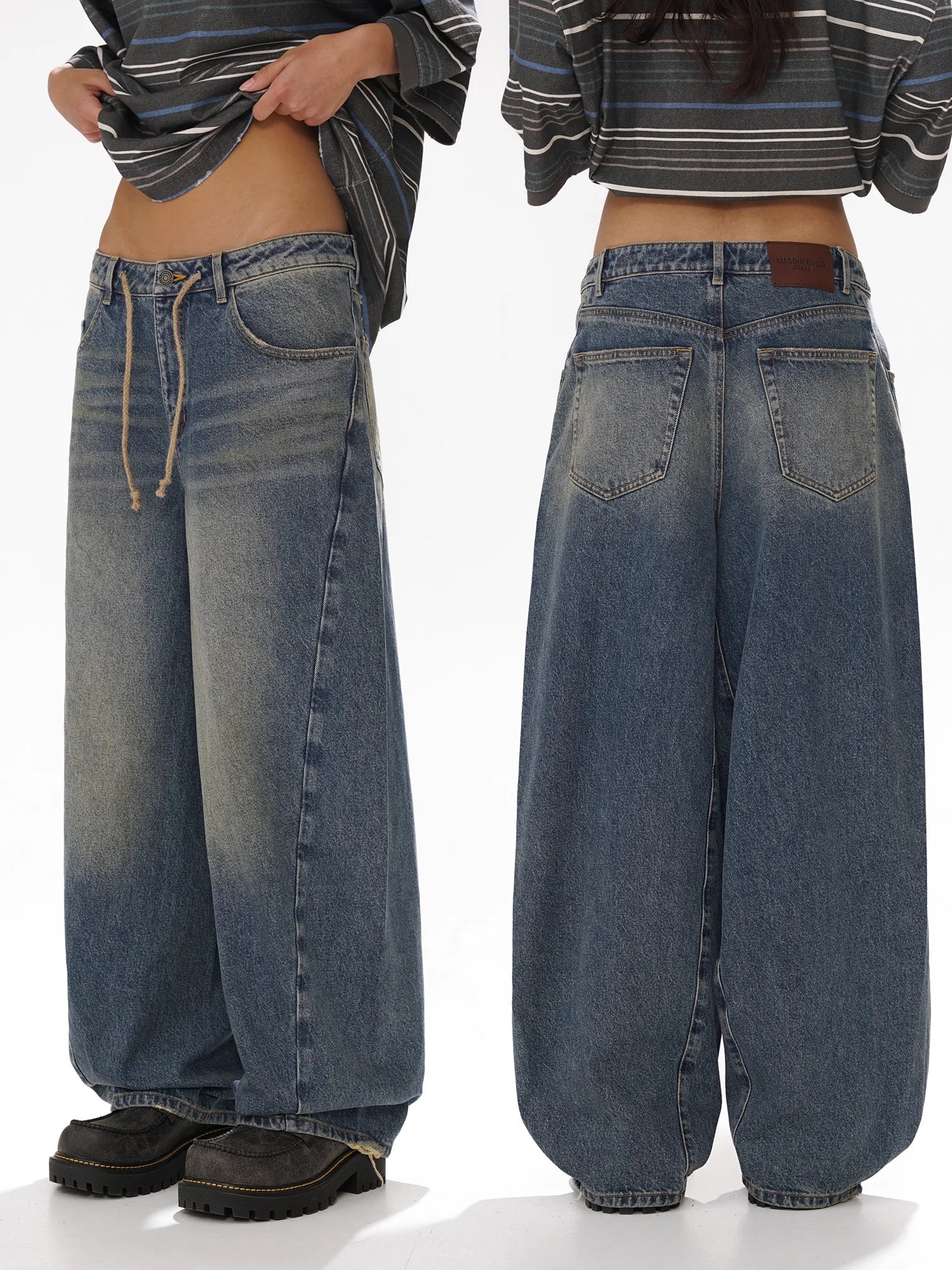 Elevate your casual wardrobe with these women's loose fit curved denim jeans. Designed with a natural, wide-leg silhouette, these jeans offer a relaxed and structured look. The washed-out fabric and fading along the thighs and knees give a vintage, worn-in vibe. A lace tie at the waist adds a touch of detail, while the extra-long hem gracefully drapes over shoes, offering a laid-back yet stylish finish.