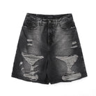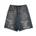 These men's knee-length denim shorts offer a rugged, streetwear vibe with their distressed and frayed detailing. Featuring a classic five-pocket design and zip-fly closure, the shorts are fashioned from medium to dark wash denim and are accented with a subtle natural tie-dye effect. The fading and vintage wear give them a well-worn appeal, perfect for casual, everyday wear.