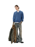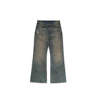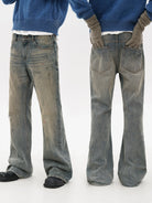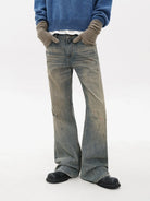 Elevate your casual wardrobe with these women's bootcut jeans featuring a retro-inspired design. Crafted in a soft, faded wash, these denim jeans offer a vintage aesthetic with subtle distressing, including whiskering at the thighs and small rips near the knees for a worn-in look.