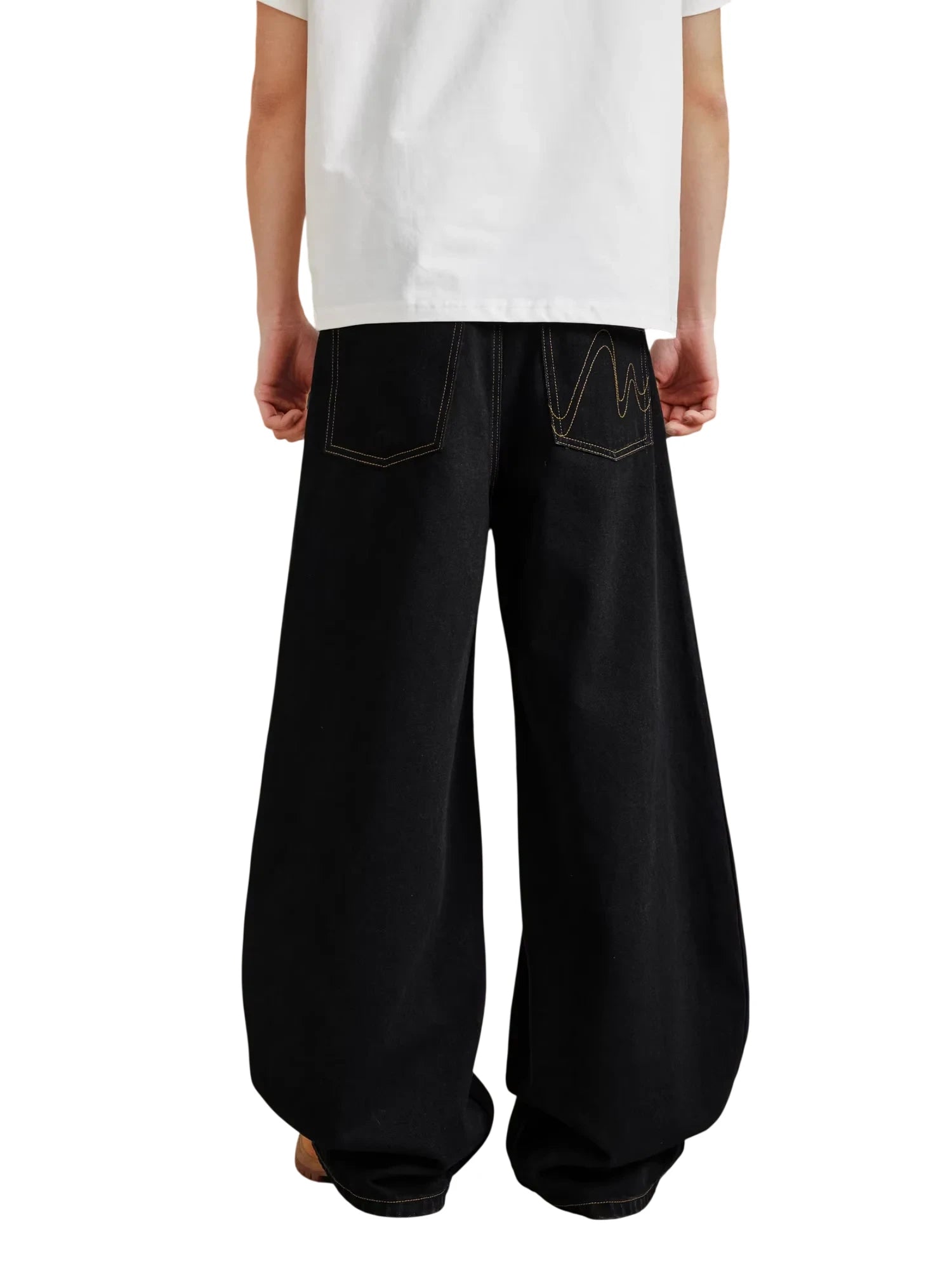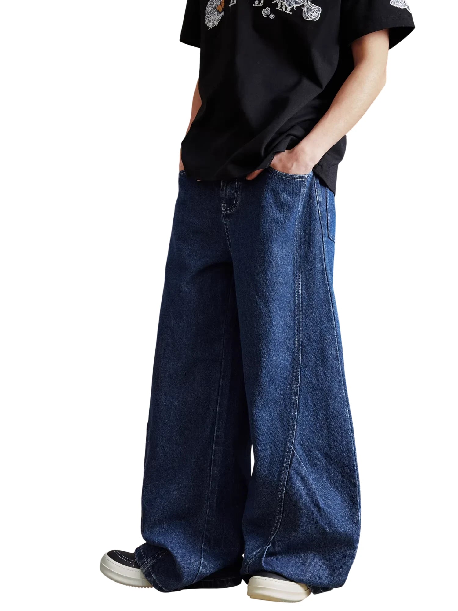 These men's wide-leg jeans feature bold contrast stitching along the seams, adding a unique touch to their relaxed, retro design. Crafted for comfort and style, they offer a loose draped fit with a mid-rise waist, making them ideal for casual wear during spring and autumn. Functional side pockets enhance their practicality, while the laid-back silhouette makes them a standout addition to any modern streetwear wardrobe.