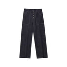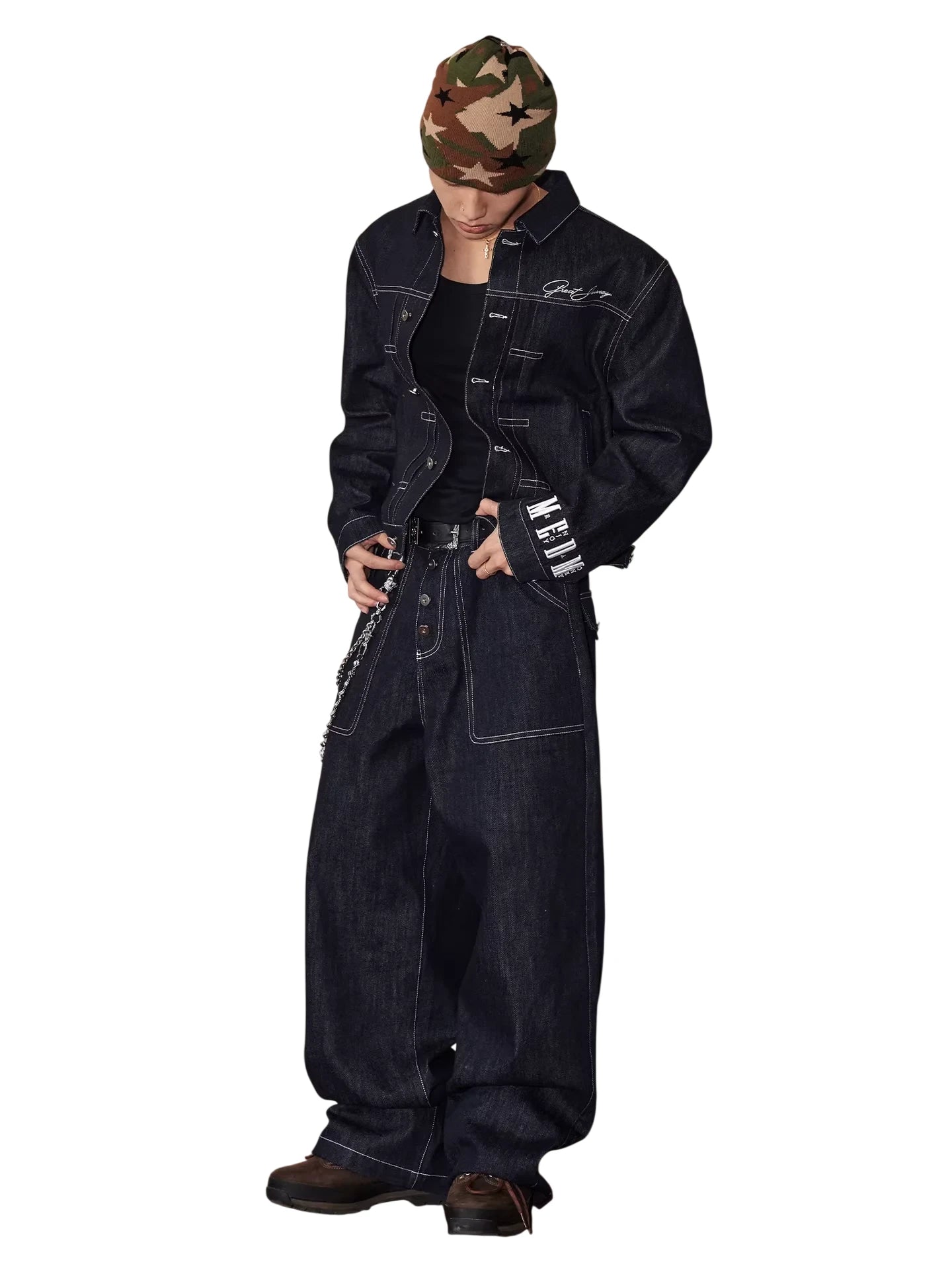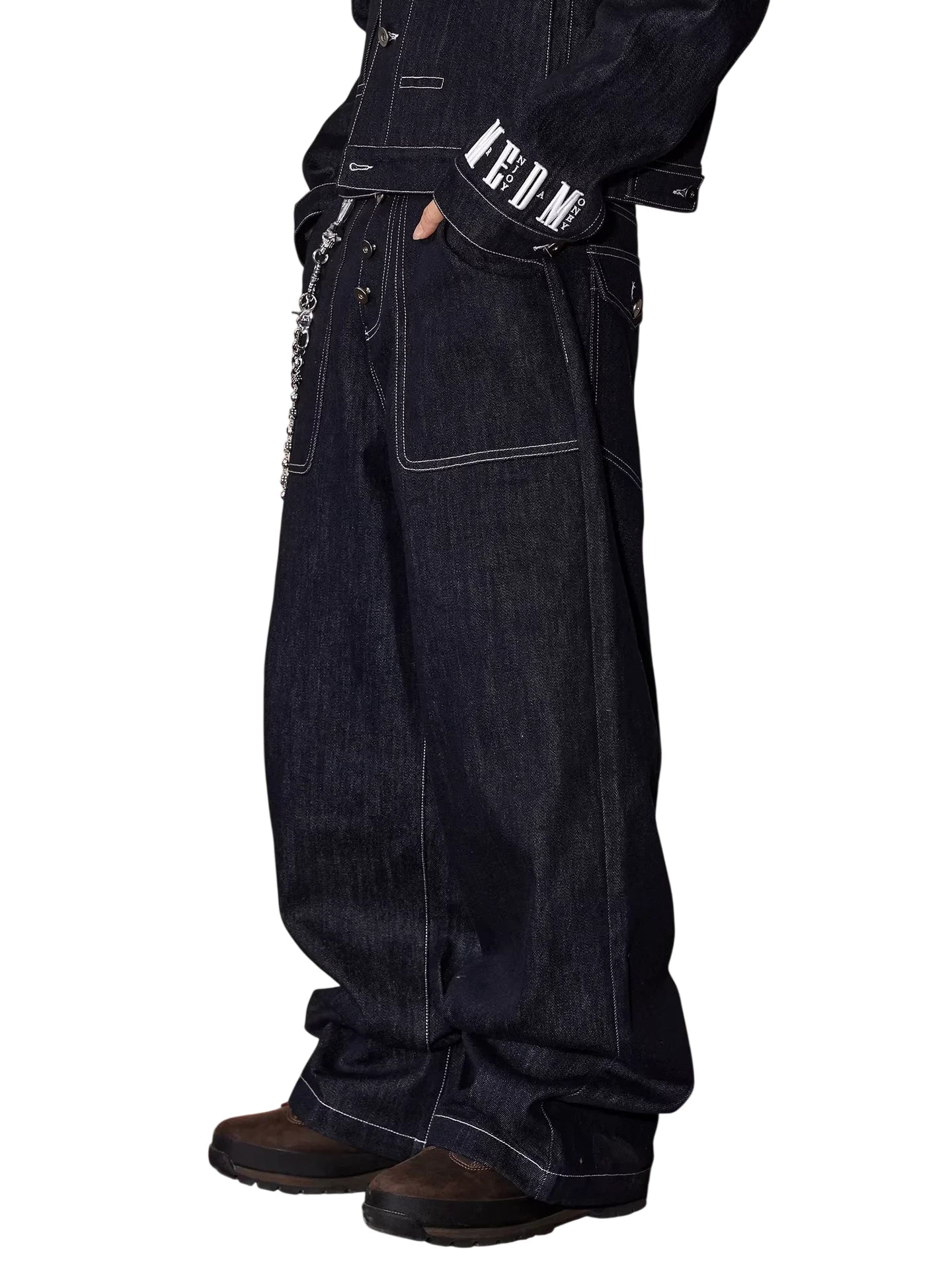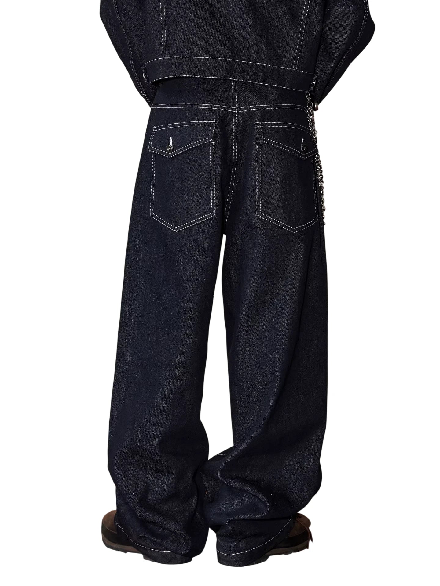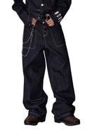 Elevate your streetwear style with these men's raw denim wide-leg jeans, designed for a bold and relaxed look. Featuring a rich dark blue hue and striking white contrast stitching, these straight-fit jeans bring a retro American vibe perfect for the autumn season. The pants include a button fly, visible seam detailing, and a metal chain accessory that adds an urban edge. Pair them effortlessly with matching denim jackets or layered tops for a complete street-ready ensemble.