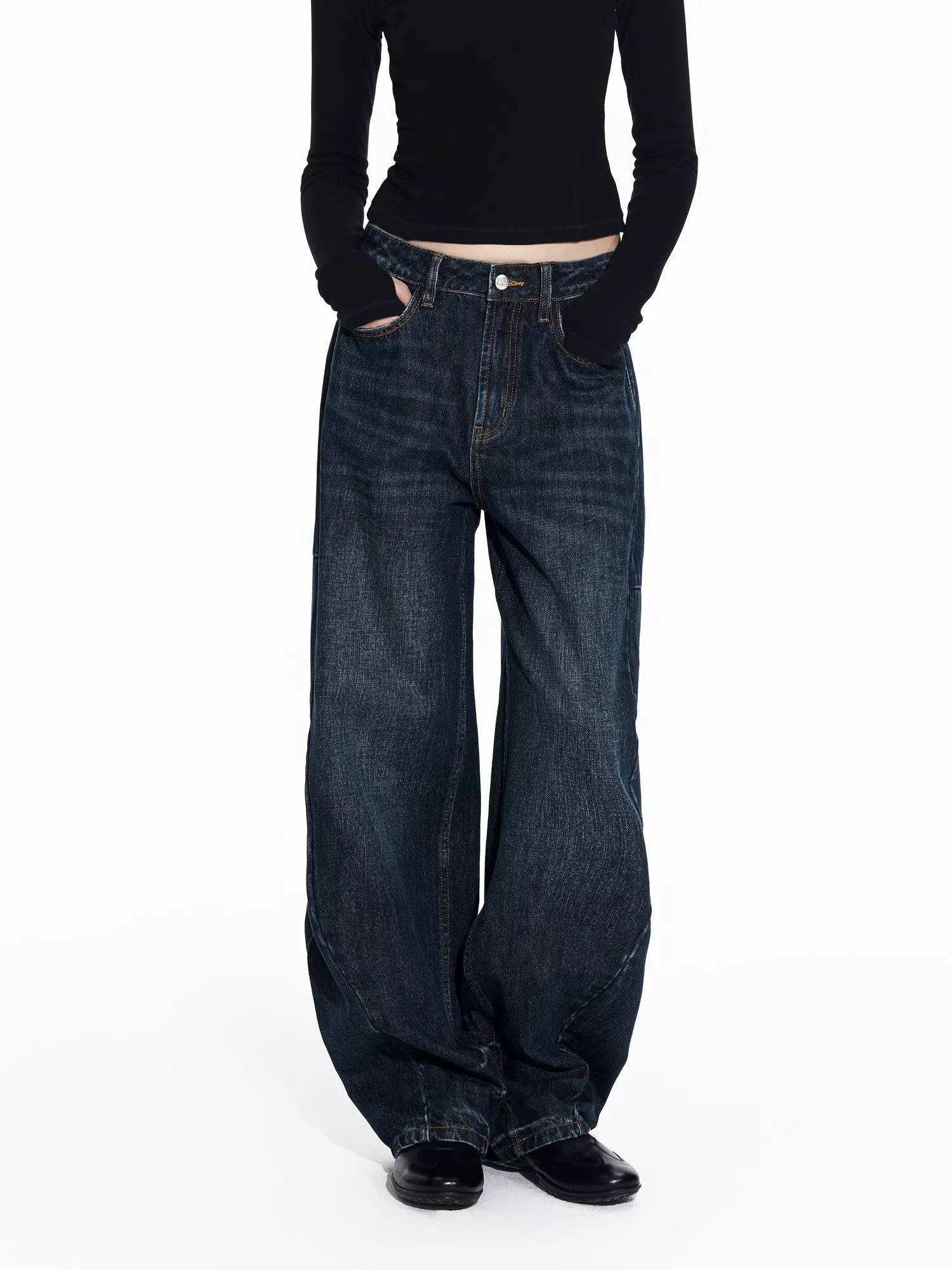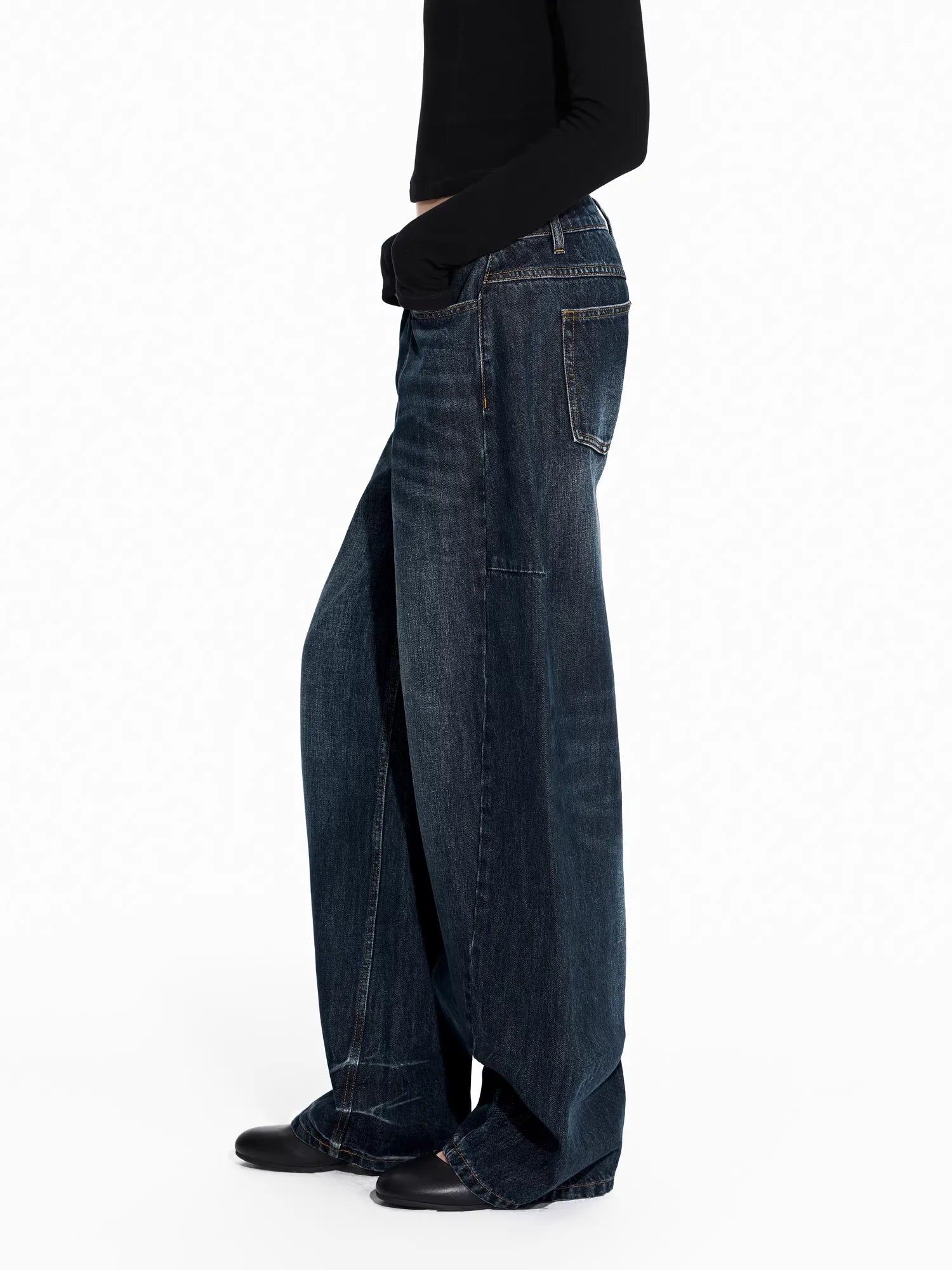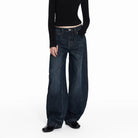 Make a bold fashion statement with these women's ultra-wide leg denim jeans, crafted in heavyweight raw denim for a structured yet relaxed silhouette. Designed with a dramatic balloon curve from hip to hem, these jeans offer a contemporary cocoon shape that stands out. Featuring a classic five-pocket design with subtle whiskering and vintage wash accents, they combine retro aesthetics with modern flair. Perfect for elevating your everyday style with comfort and edge.