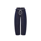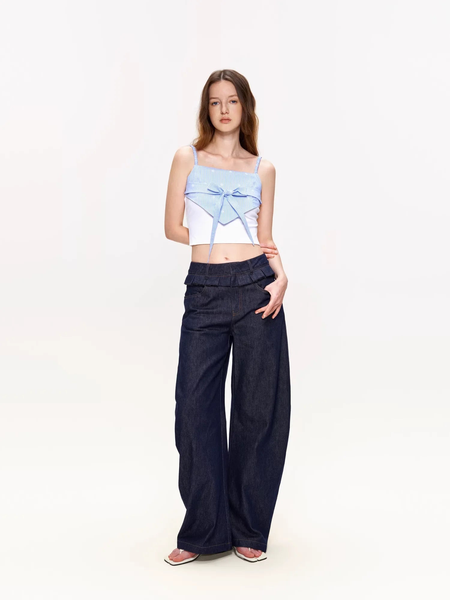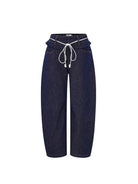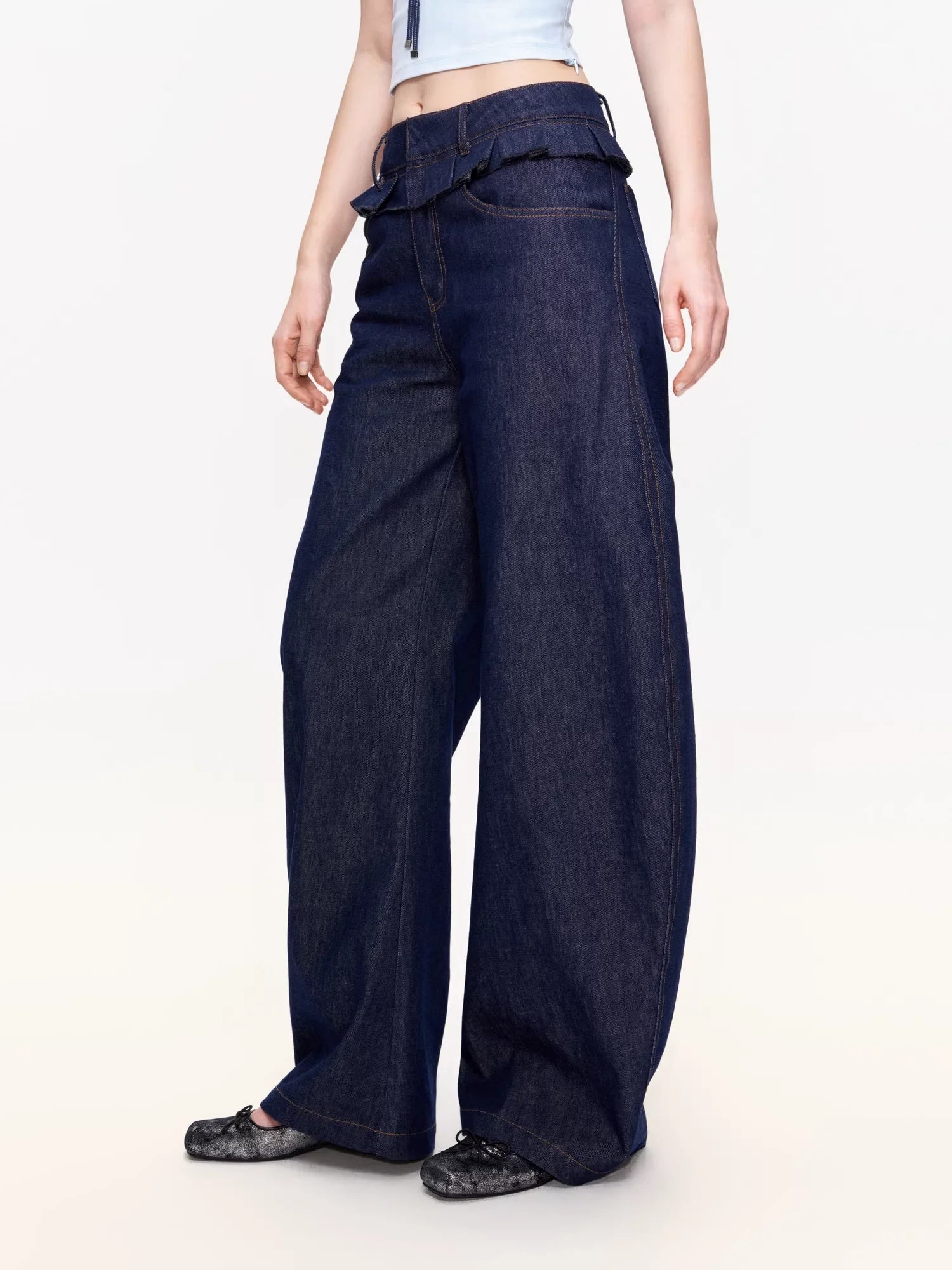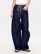 Make a bold statement with these women's wide-leg denim jeans, featuring a distinctive double waistband design and ruffled detailing. The high-rise fit is accentuated by a contrasting white drawstring at the front, adding both style and practical charm. Crafted in dark wash denim, these jeans offer a casual yet striking silhouette with oversized legs and visible front pockets. Pair them with your favorite cropped top for an effortlessly modern look.
