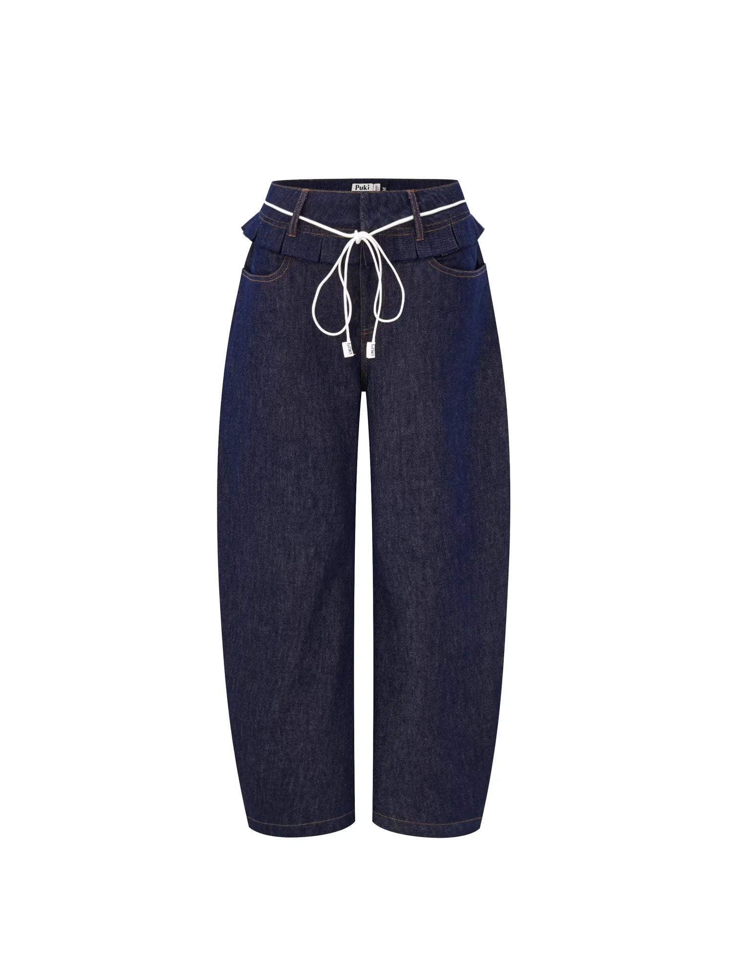 PUKI Women's Wide-Leg Jeans with Double Waistband and Drawstring Detail