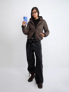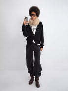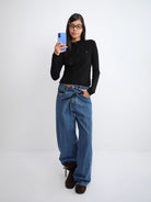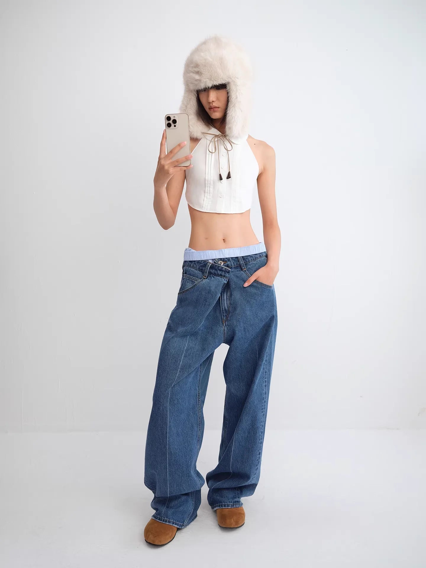 Elevate your streetwear game with these asymmetrical waist straight-leg jeans, designed for a relaxed and effortlessly cool look. These low-rise, oversized jeans feature a unique waist construction and a baggy silhouette that gathers slightly at the ankles. Worn here by a female model, they offer an edgy, fashion-forward style that pairs perfectly with cropped tops and casual footwear.