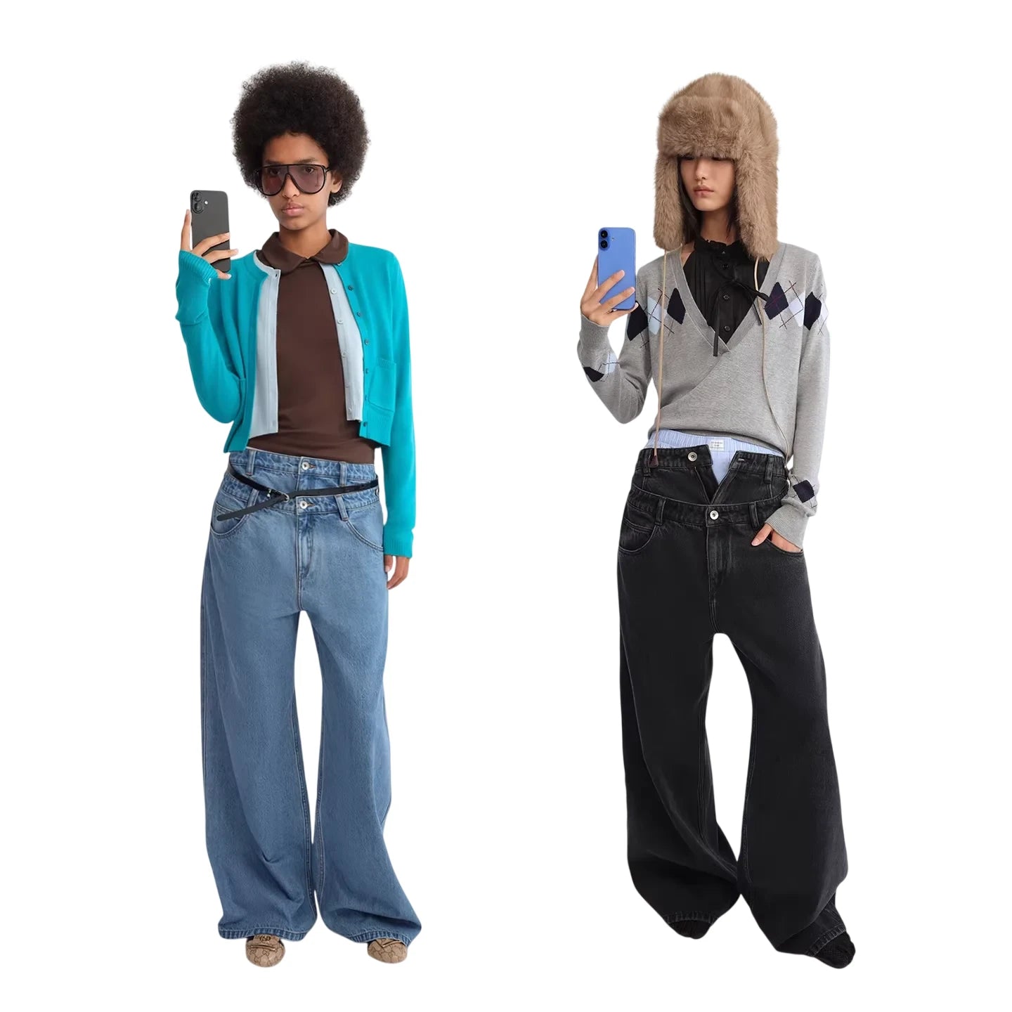 These detachable double waist wide leg jeans offer a bold and modern silhouette, perfect for contemporary streetwear styling. Featuring a unique double waistband design, these jeans sit low on the hips for an edgy fit. The wide leg cut adds drama and comfort, ideal for creating standout looks. Designed with detachable elements, they provide versatile styling options. Suitable for women seeking trend-forward, expressive fashion.