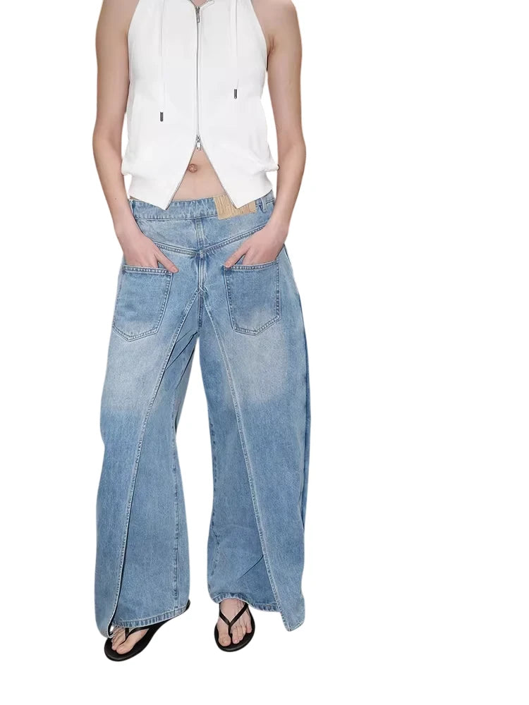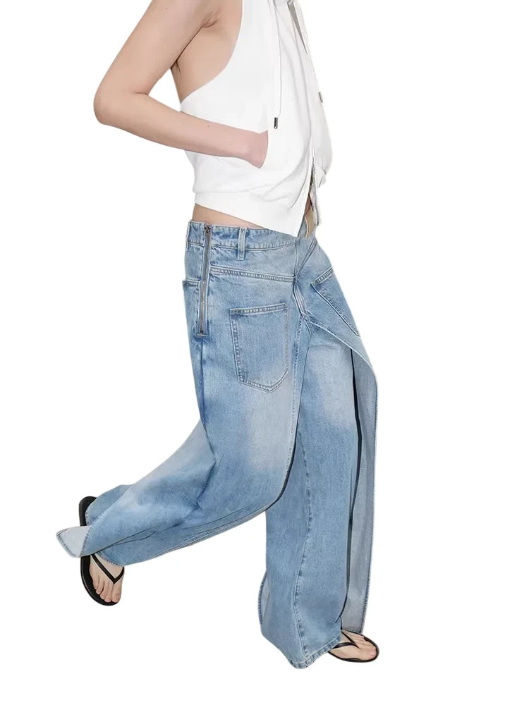 These reversible deconstructed denim pants offer a bold, fashion-forward take on classic jeans. Designed with exaggerated front paneling and a layered wrap-around effect, they feature a wide-leg silhouette in a light blue washed finish. Detailed with traditional five-pocket styling, contrast stitching, and back patch pockets, these unique pants merge functionality with experimental design.
