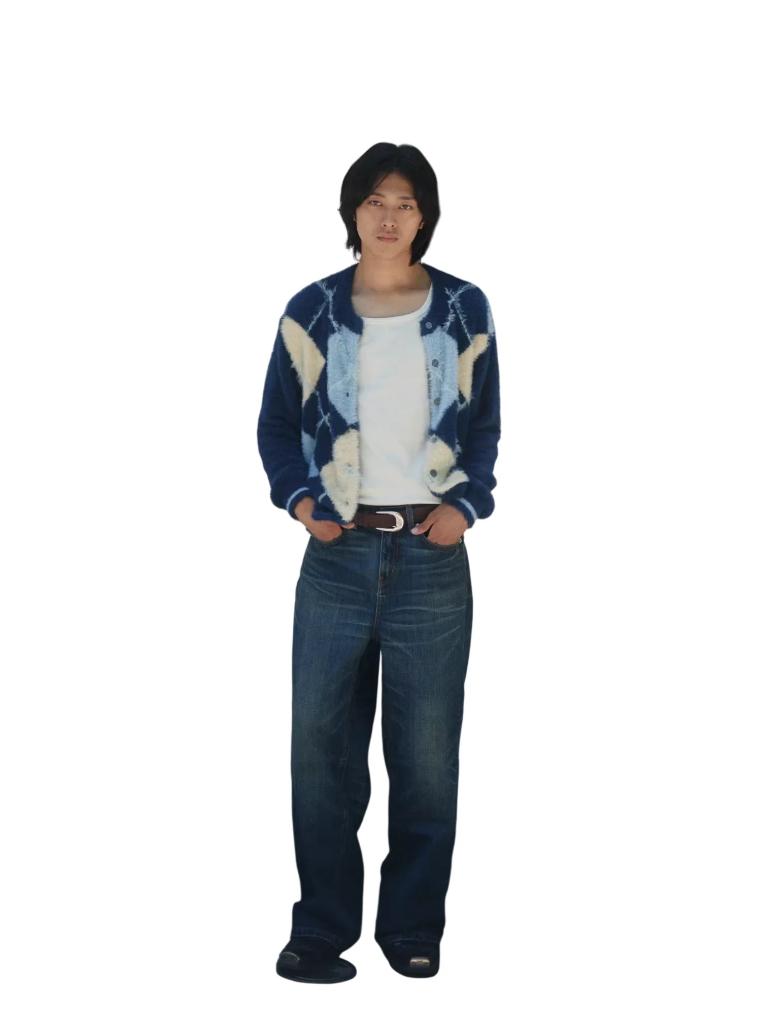 These dark blue wide-leg denim jeans feature a coarse slub texture with subtle faded lines and creases for a comfortable, worn-in aesthetic. Designed with a relaxed fit, they offer a contemporary and laid-back style perfect for everyday wear. Additional details include a visible chain accessory attached to the belt loop, adding an edgy accent. Ideal for men seeking both comfort and urban-inspired style.
