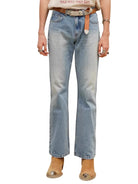 These men's retro washed ice blue flared jeans offer a timeless blend of classic style and vintage appeal. Designed with a light wash and subtle fading around the thighs and knees, the jeans exude a worn-in, lived-in character. The straight-leg flare silhouette adds a nod to retro fashion, while the whiskered detailing enhances the rugged look.