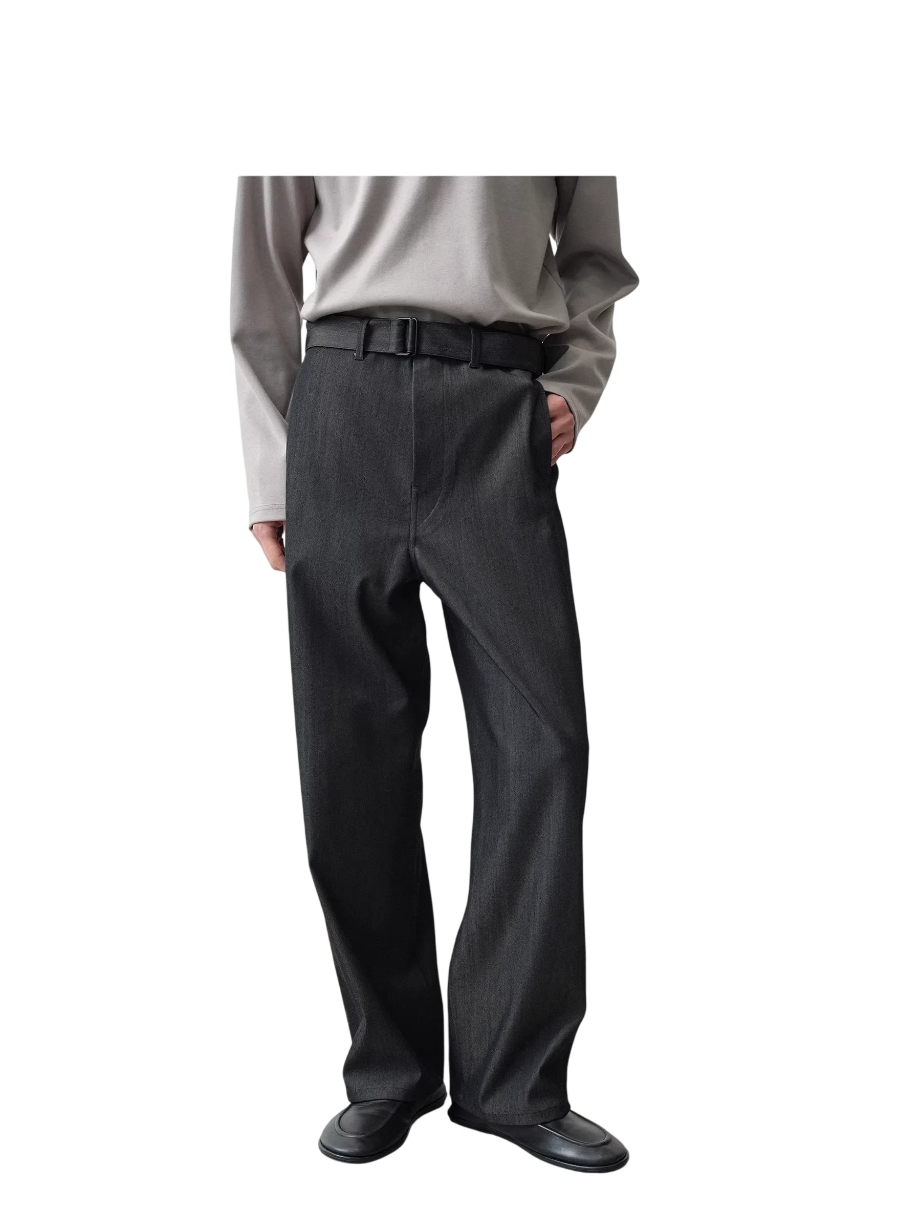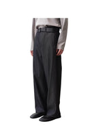 These men's high-waisted trousers feature a relaxed, straight-leg silhouette crafted from a structured yet soft wool-blend fabric. Designed with a matching fabric belt and rectangular buckle, they evoke a refined, vintage-inspired aesthetic influenced by workwear and old money style. The trousers offer a modern interpretation of Y2K fashion, ideal for elevated casual or sophisticated streetwear looks. Perfectly paired with tucked-in tops and leather shoes for a polished finish.