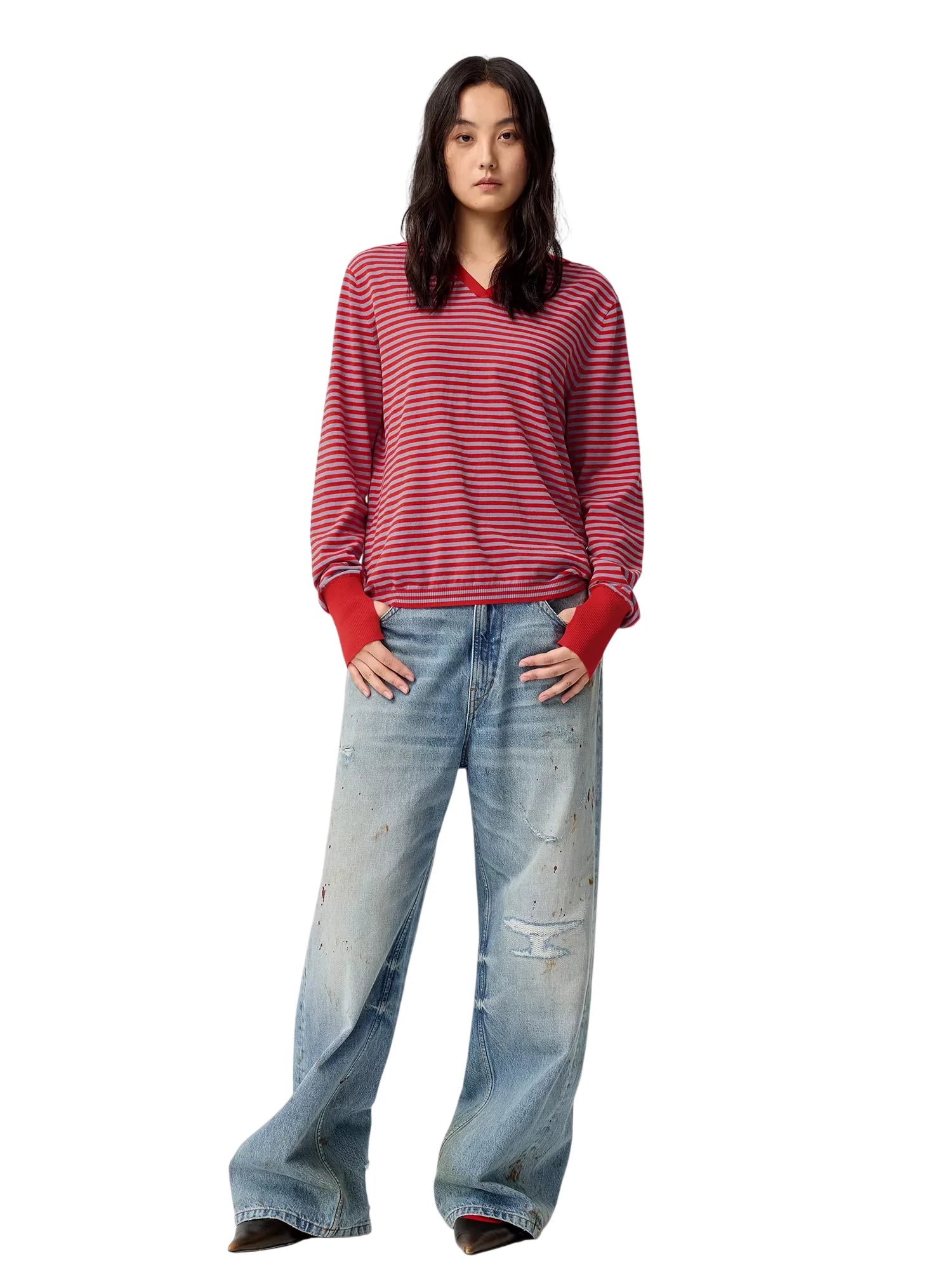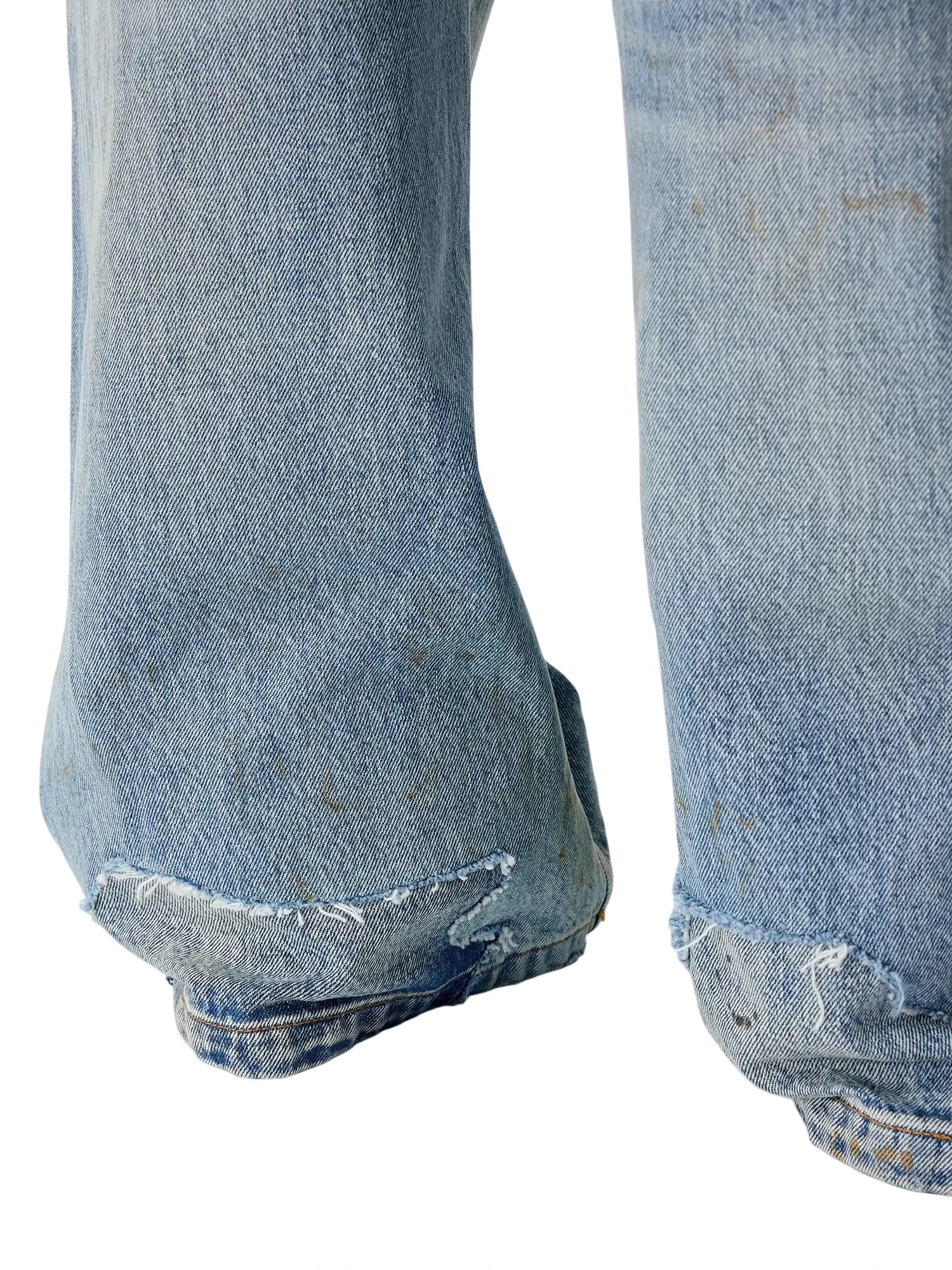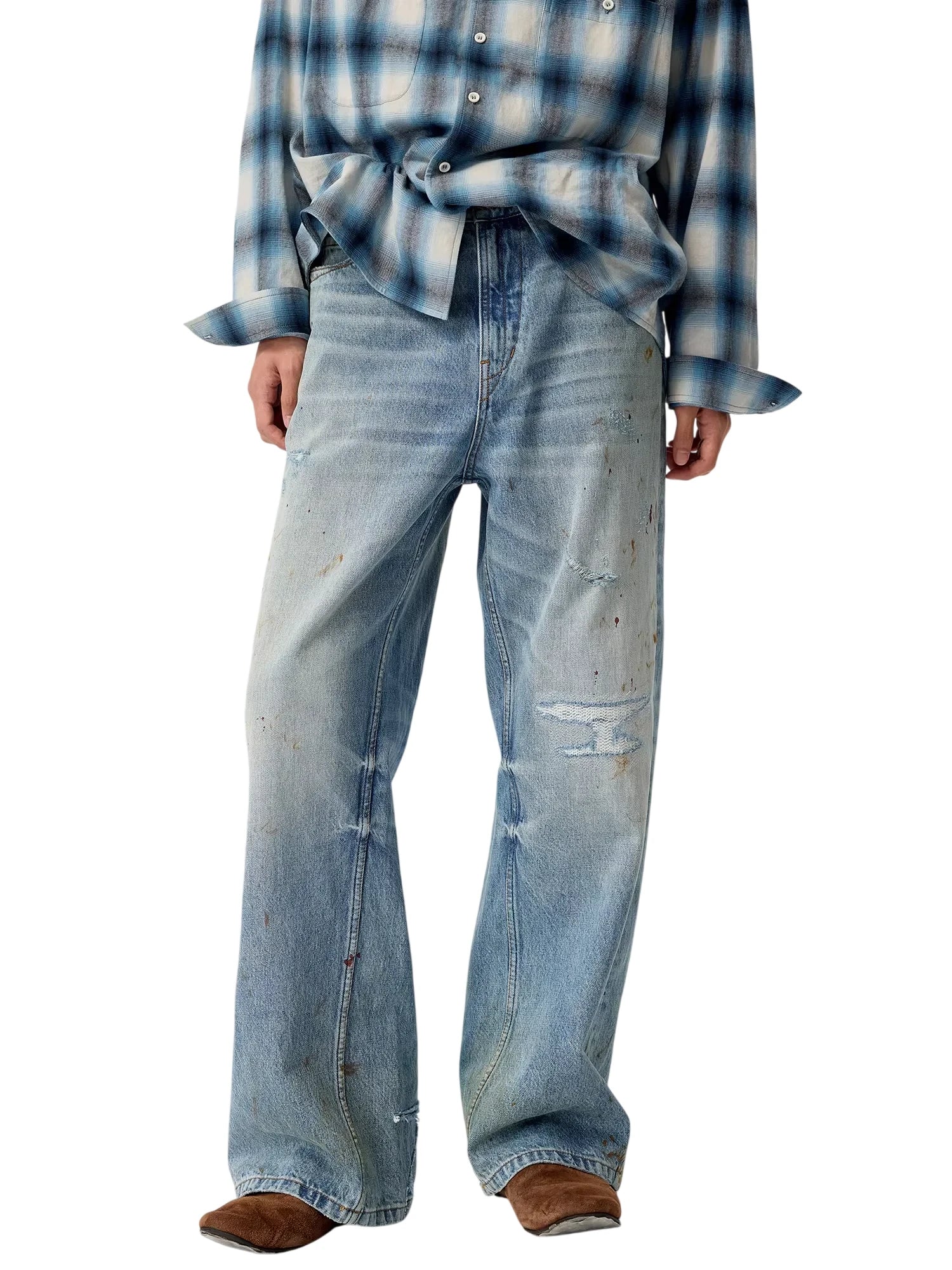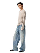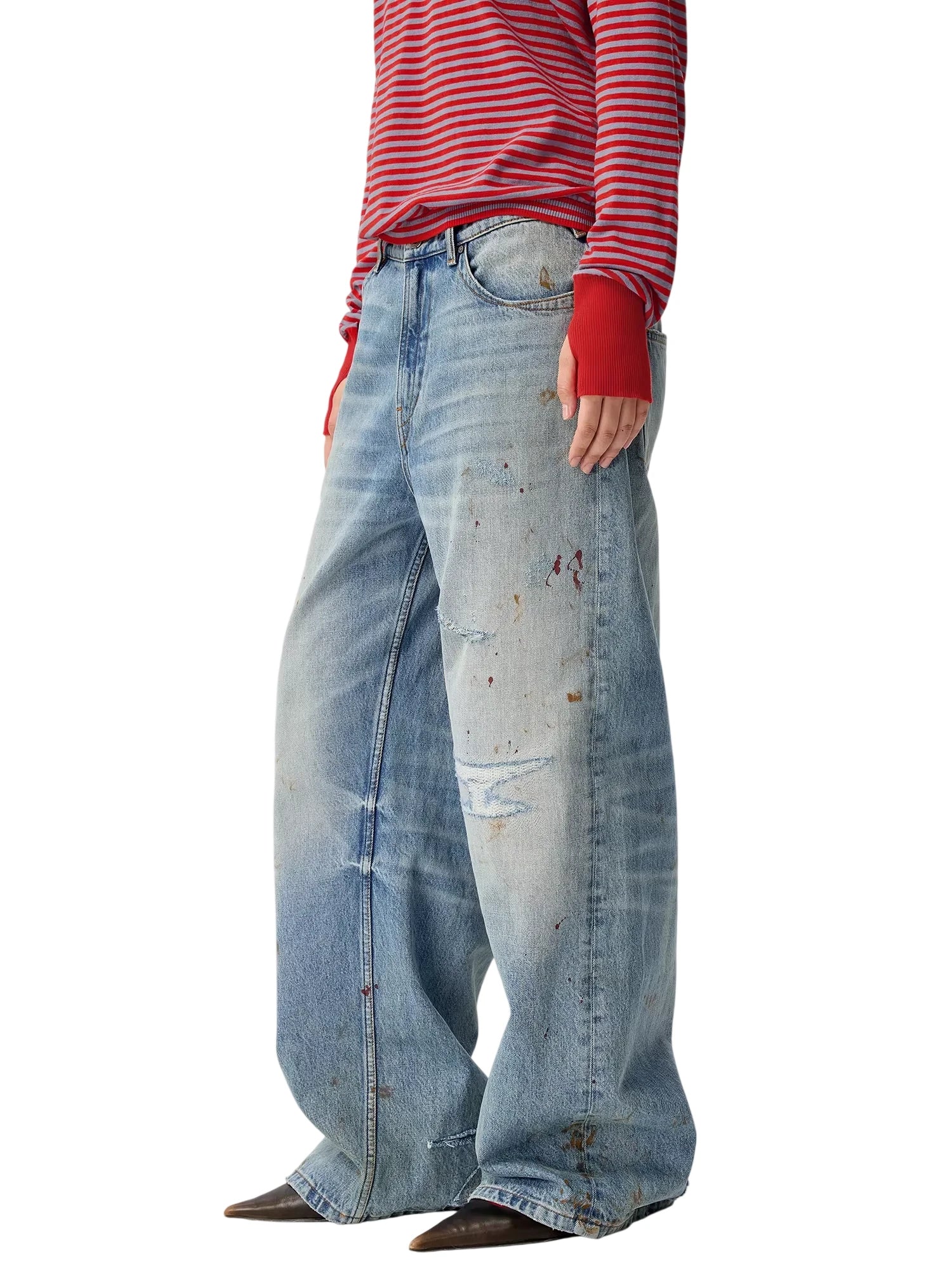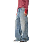 Make a bold statement with these women's distressed wide-leg jeans. Designed in a light wash denim, these A-line jeans feature a twisted seam detail and a heavily distressed finish, including scattered paint splatters, scratches, and small rips. The ultra-baggy silhouette offers a relaxed fit that drapes effortlessly over footwear, delivering a casual, street-style vibe.