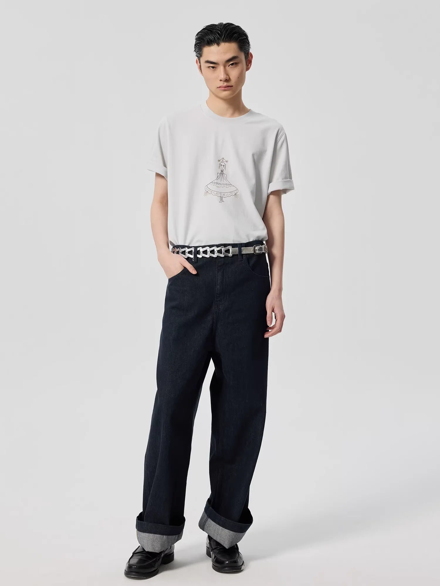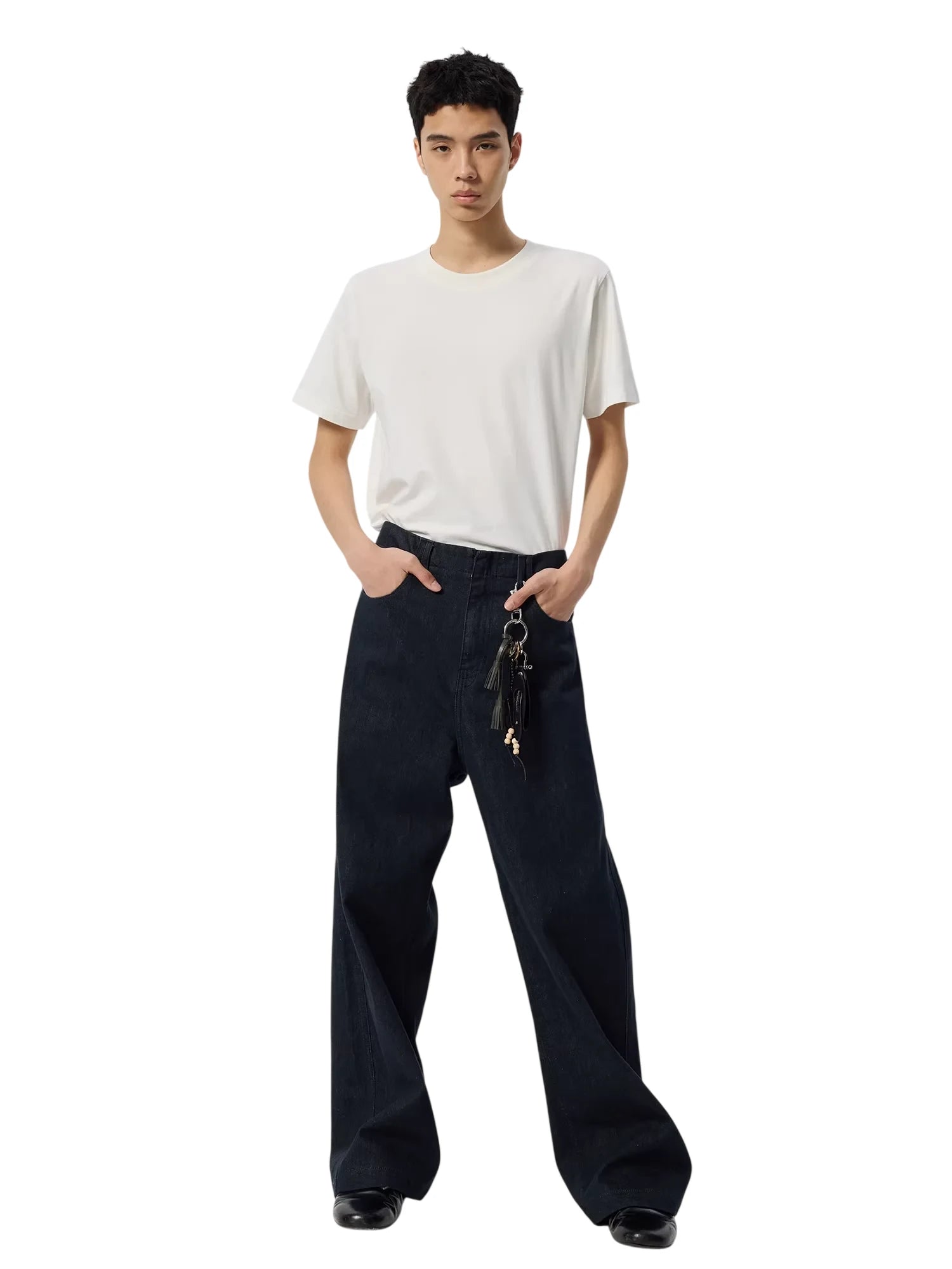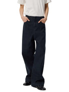 Elevate your denim collection with these men's high-waisted wide-leg jeans, crafted from premium raw selvedge denim in a deep indigo wash. Designed with a relaxed, straight-leg fit, these jeans feature classic five-pocket styling, visible stitching, and a clean hem. The high waist and loose silhouette offer both comfort and timeless style, making them a versatile staple for everyday wear.