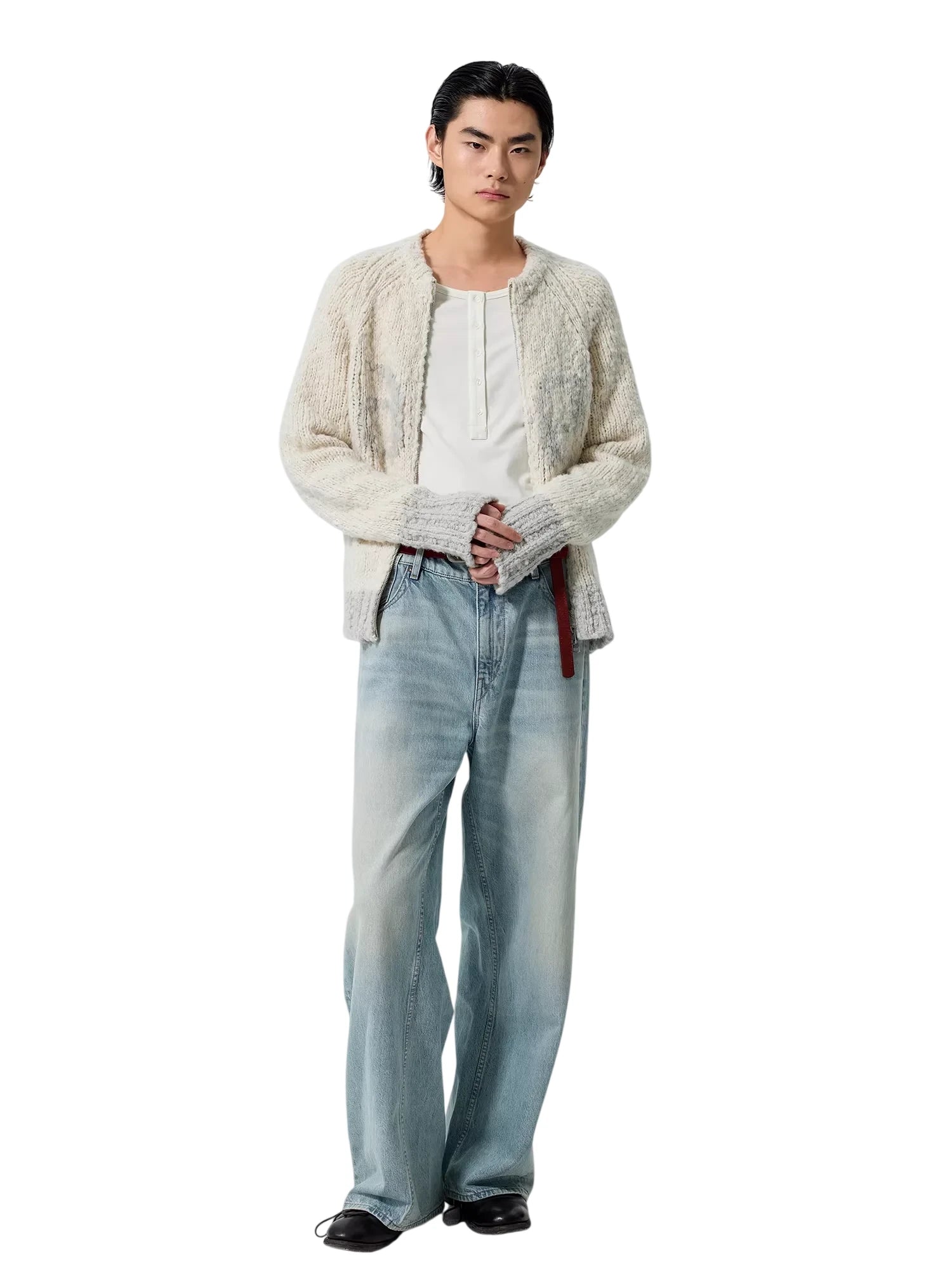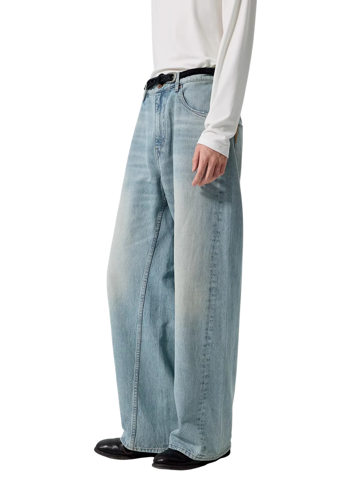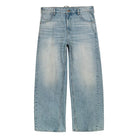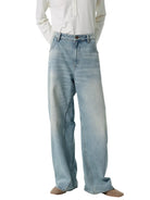 These men's wide-leg jeans feature a light washed indigo tone and an oversized silhouette for a relaxed yet structured look. Designed with a high-waisted fit and subtle fading along the thighs and knees, they offer both comfort and style. The traditional five-pocket layout and extended hem that drapes over footwear add classic detail to this modern shape.