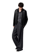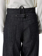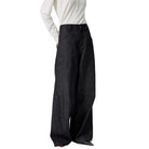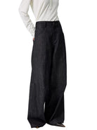 These women's wide-leg selvedge jeans feature a high-rise waist with a classic button and zipper closure. Crafted in dark indigo denim, they are designed with a 3D-cut construction and exaggerated paneling at the knees for a sculptural, oversized silhouette. Inset side pockets and extra-long hems add to the dramatic look, while a touch of lightweight ramie enhances comfort and breathability. Finished with a distinctive white edge, these trousers offer a bold take on contemporary denim.