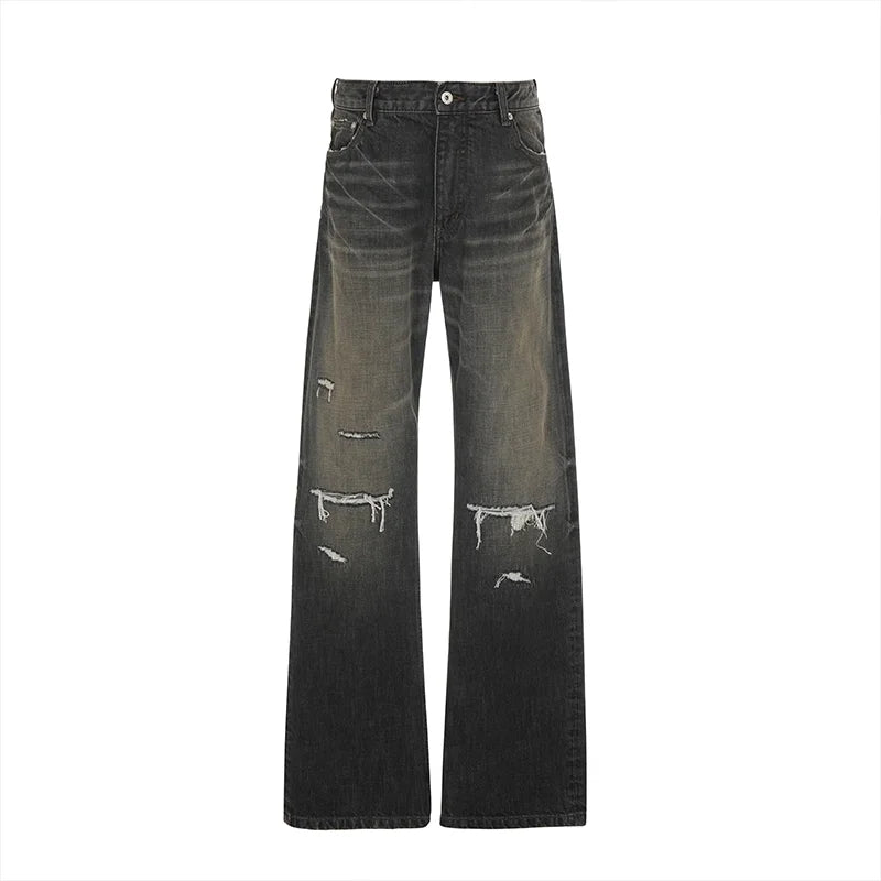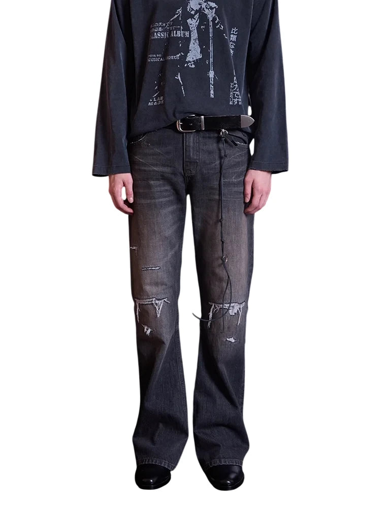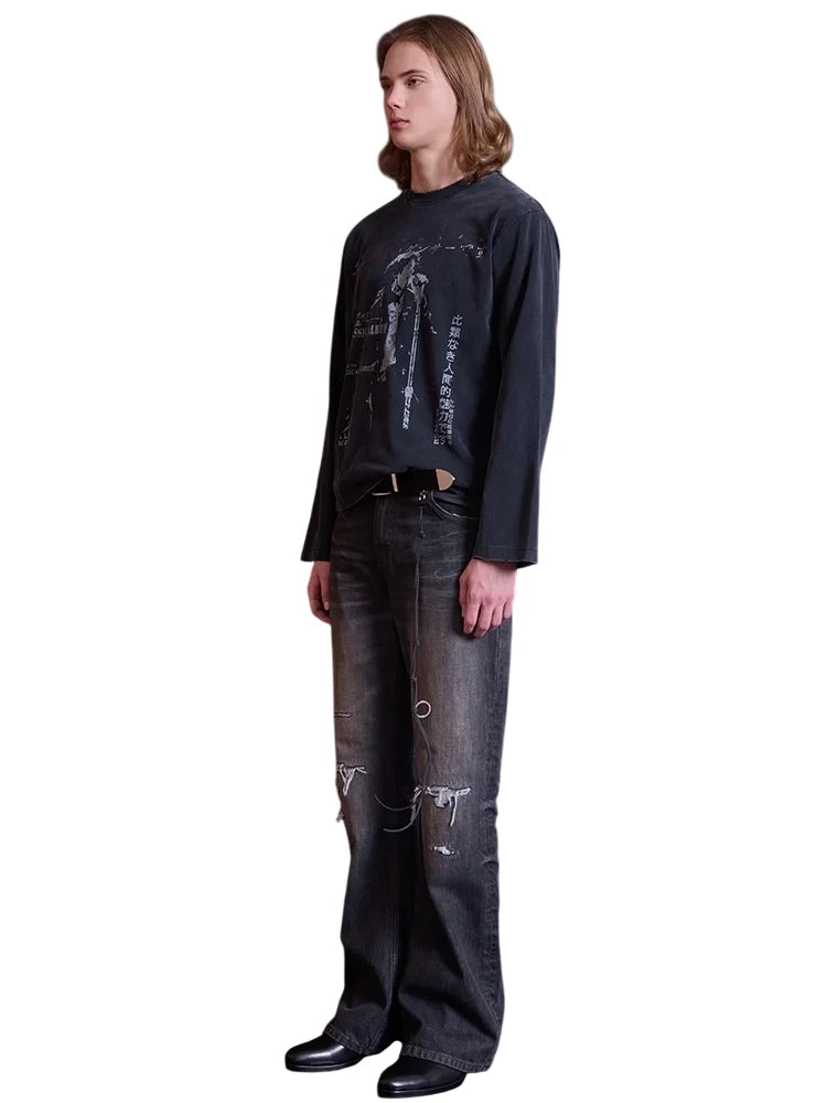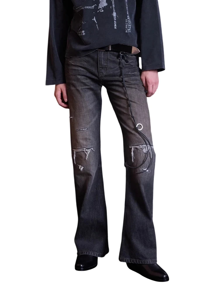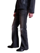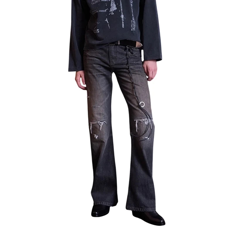 Elevate your streetwear style with these men's distressed flared bootcut jeans, featuring a vintage black-gray wash and crinkled texture. Designed with whiskered fading and worn detailing around the knees and thighs, these jeans offer an effortlessly rugged look. Artistic stitched graphics and a decorative cord with metallic-ring accents run diagonally across the leg, adding a bold, edgy touch. Perfect for those seeking flair and individuality in their everyday wear.