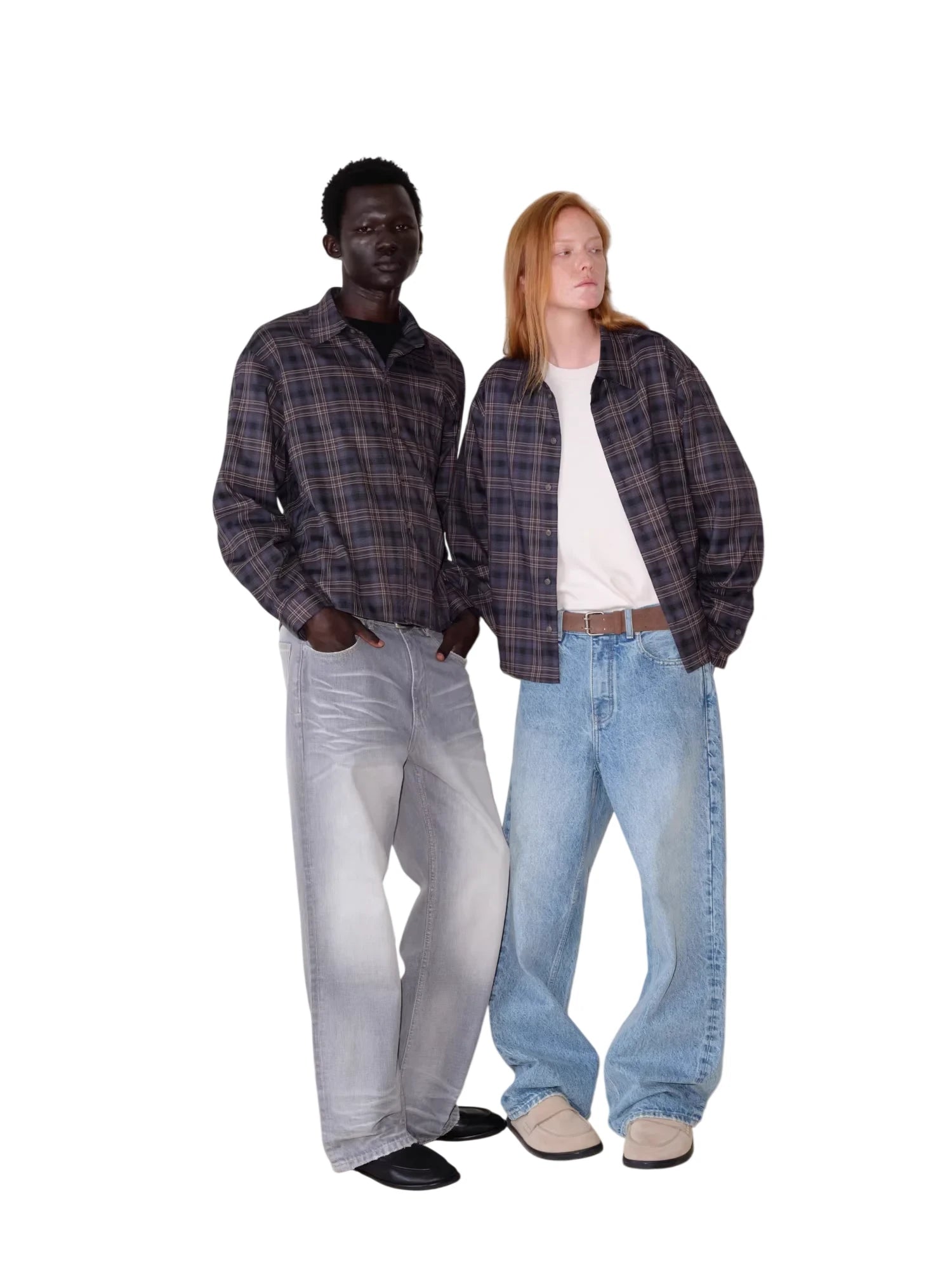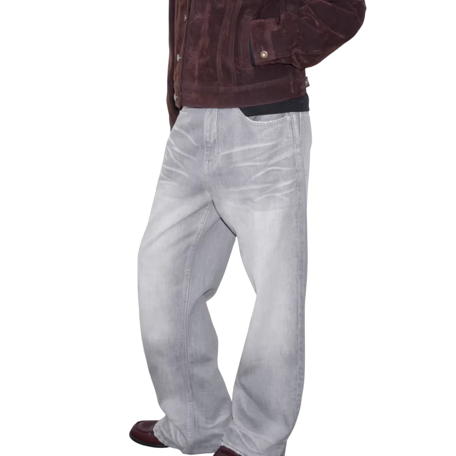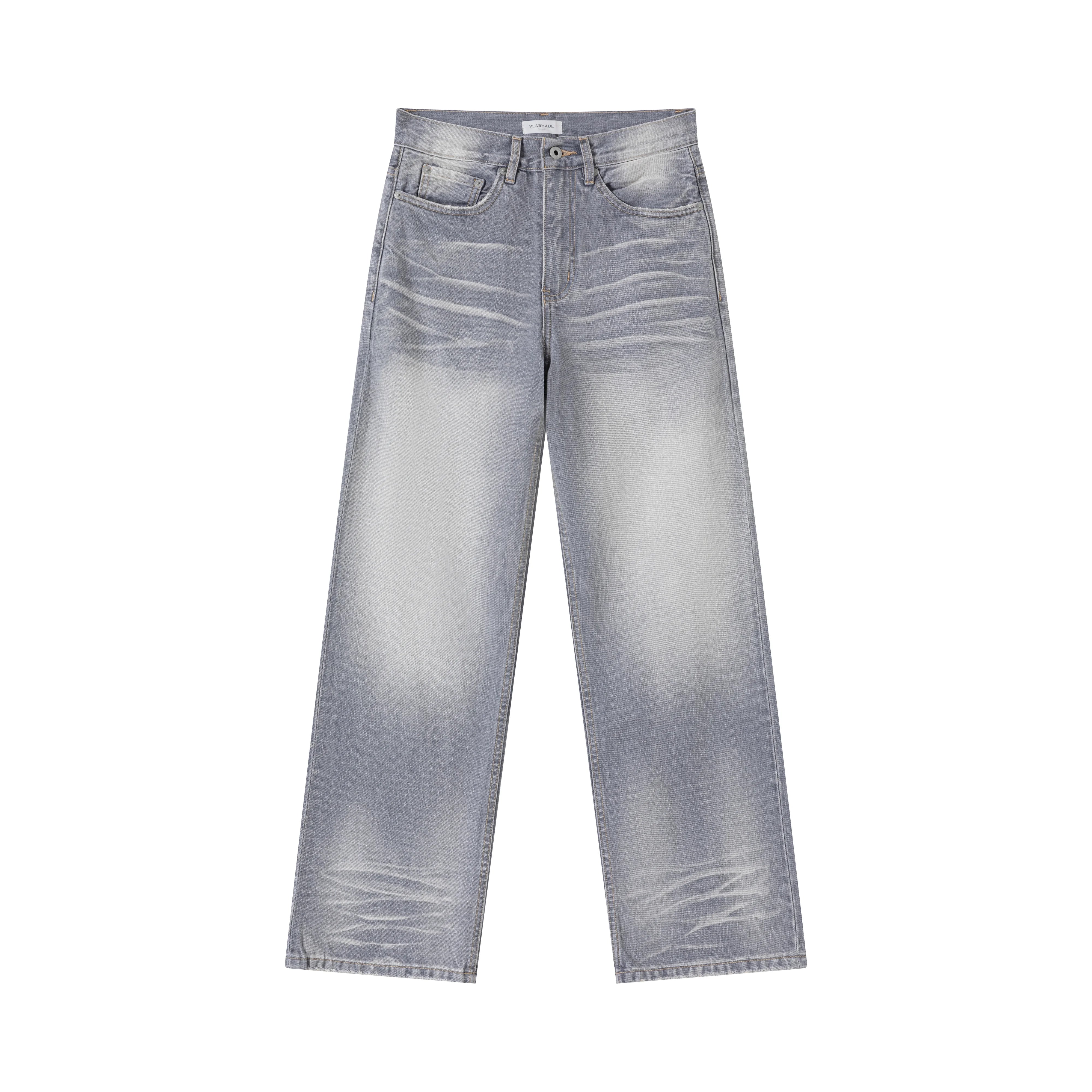 Designed for men, these vintage-inspired denim jeans feature a frosted blue-grey wash with subtle distressed details for a softly aged look. The straight leg cut and relaxed fit provide all-day comfort, while gentle front whiskering and water ripple effects add character. Classic five-pocket styling completes this timeless wardrobe essential.