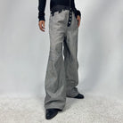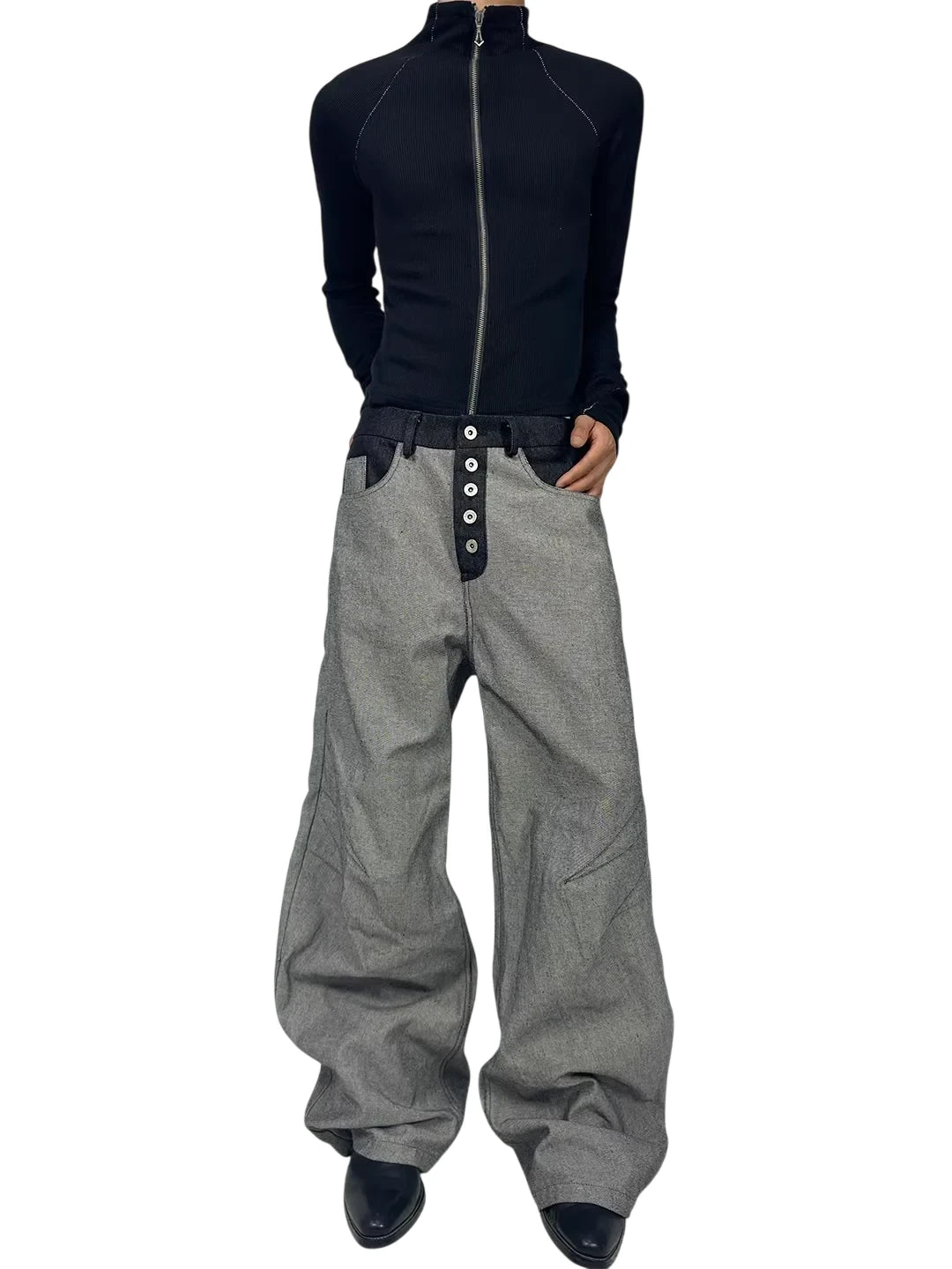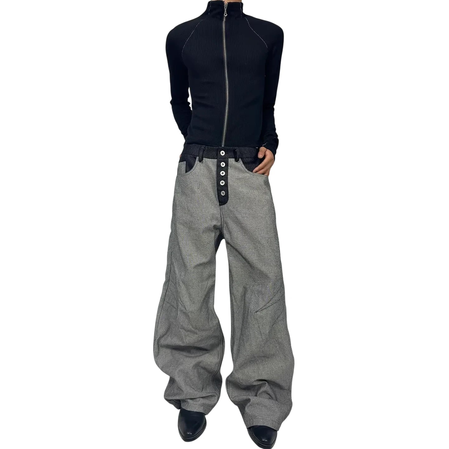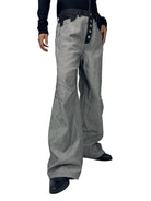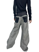 Make a bold statement with these reversible distressed denim pants, crafted from premium 13.5oz narrow selvedge fabric. Designed for a unisex fit, they feature a straight leg silhouette with a loose, slightly baggy cut that adds urban edge and comfort. The contrast black waistband with oversized white buttons and belt loops enhances the streetwear-inspired aesthetic, while deconstructed detailing brings a contemporary twist to classic denim. Versatile and fashion-forward, these pants are the perfect blend of style and function.