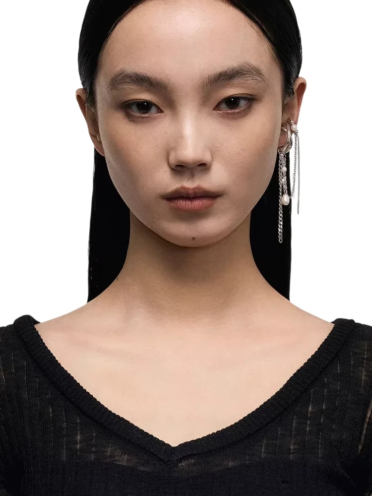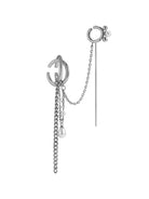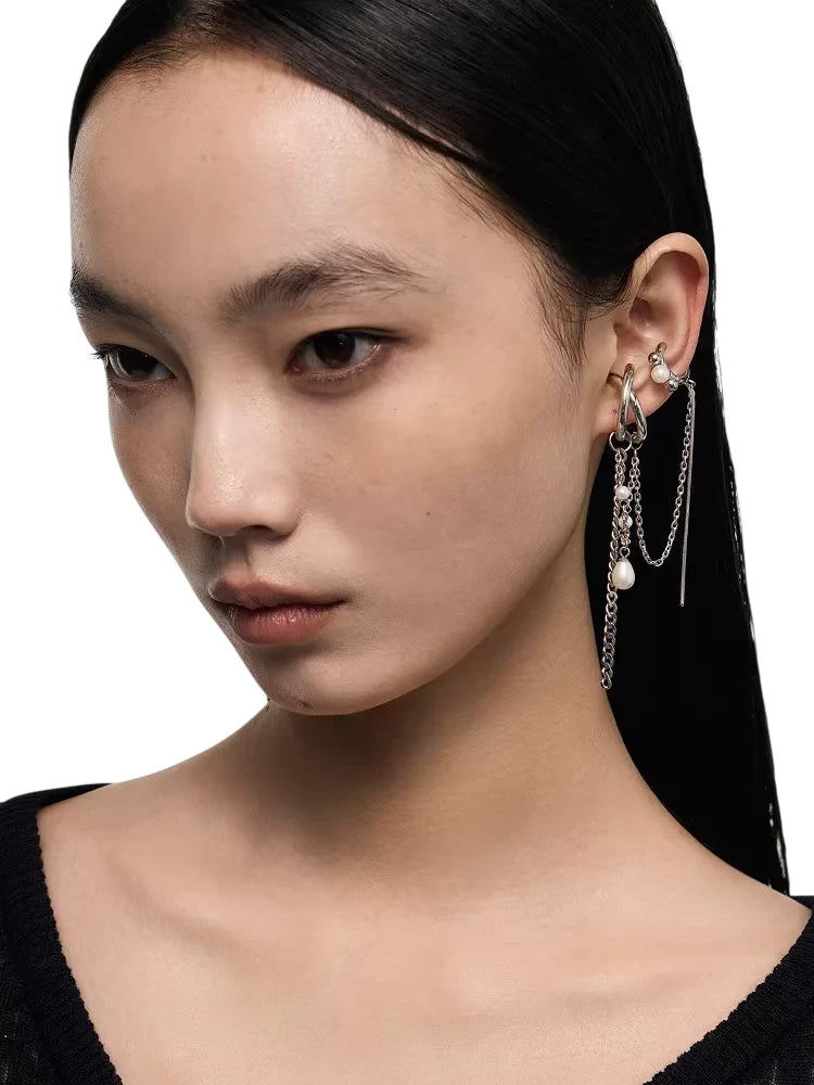 Elevate your style with these striking asymmetrical ear cuff earrings, designed with an edgy yet elegant aesthetic. Featuring silver-toned hoops adorned with faux pearl beads, delicate chains, and a multidimensional layered design, these earrings offer a bold statement for spring and summer wear.