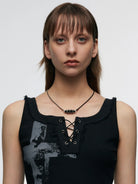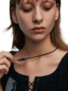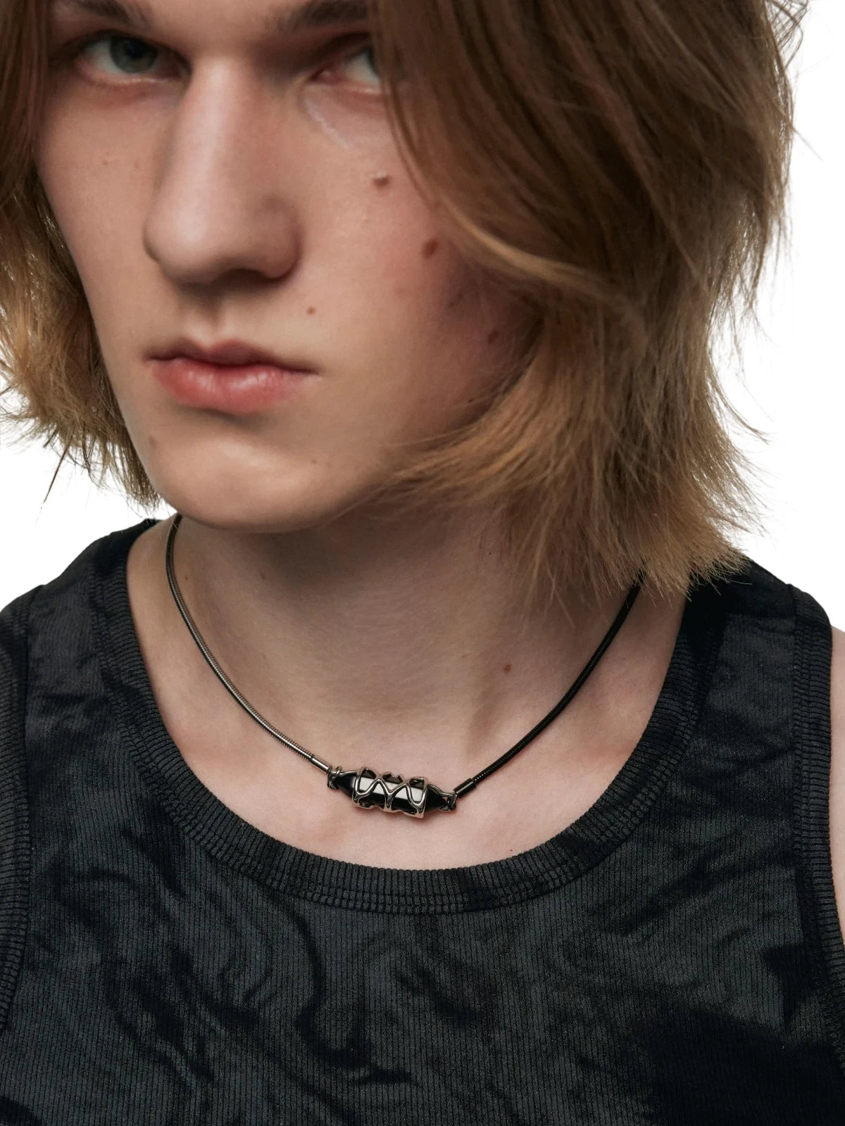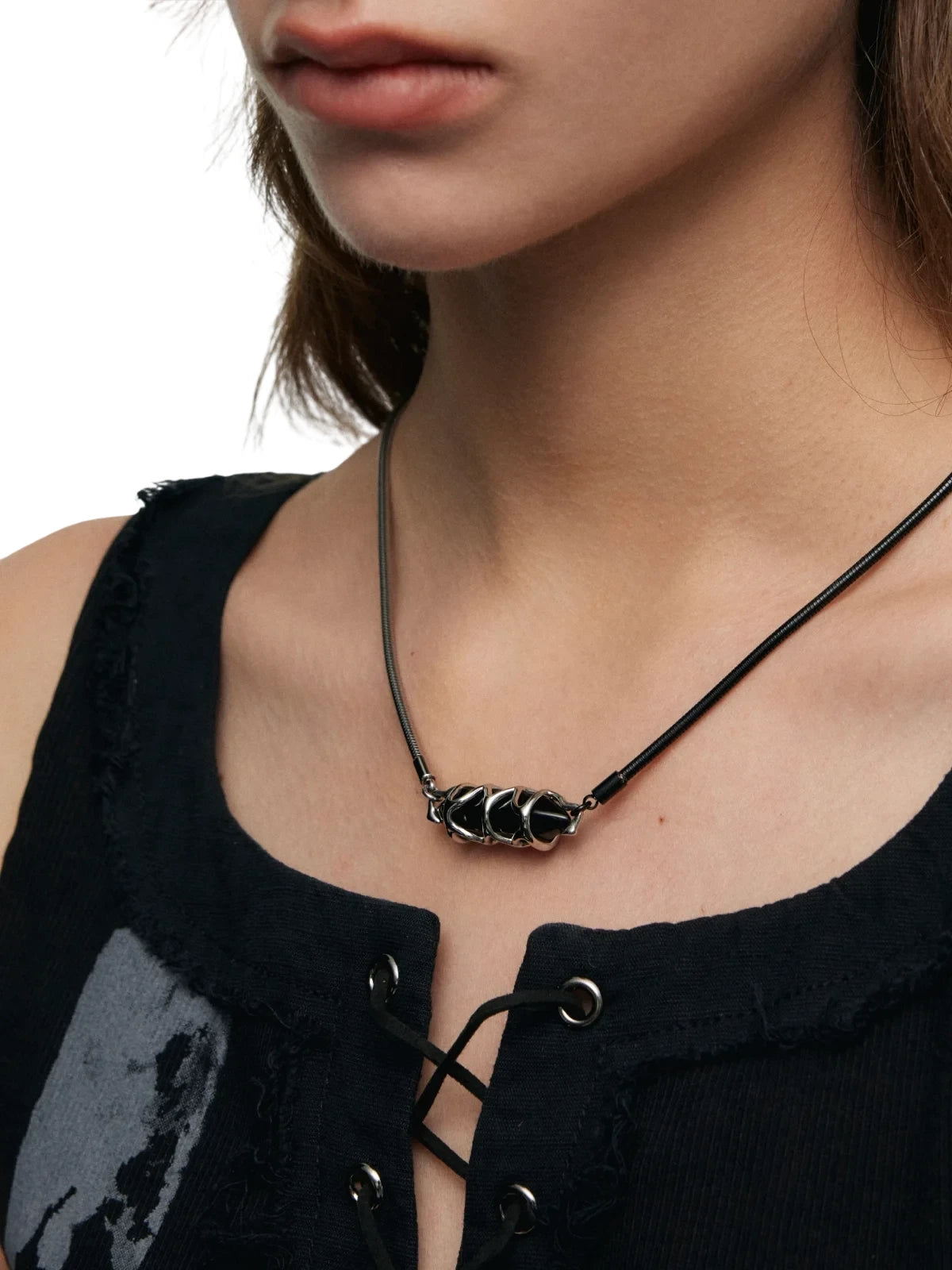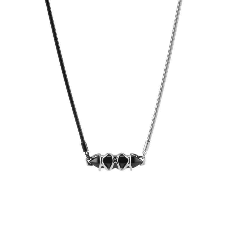 This unisex necklace features a striking and modern design, centering around sleek conical elements crafted from black agate. These are symmetrically enclosed within a polished silver-toned cage structure, creating a bold contrast and industrial aesthetic. The pendant is suspended from a two-tone cord—black on one side and silver on the other—lending an edgy, contemporary feel. A refined accessory ideal for those who appreciate minimalist yet statement-making jewelry.