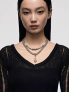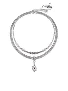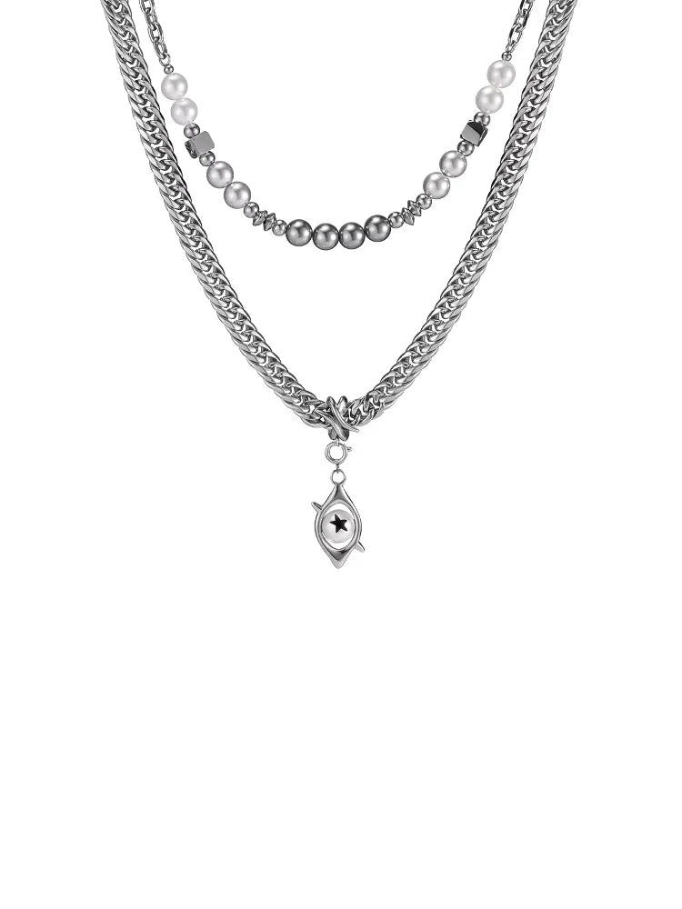 Elevate your accessory game with this stylish unisex double-layer necklace. Featuring a bold silver curb chain and a complementary strand of alternating silver-toned beads and simulated pearls, this piece blends contemporary edge with classic elegance. The centerpiece is a striking abstract eye pendant with a star detail, adding a unique focal point to your look. Perfect for both casual and statement outfits.